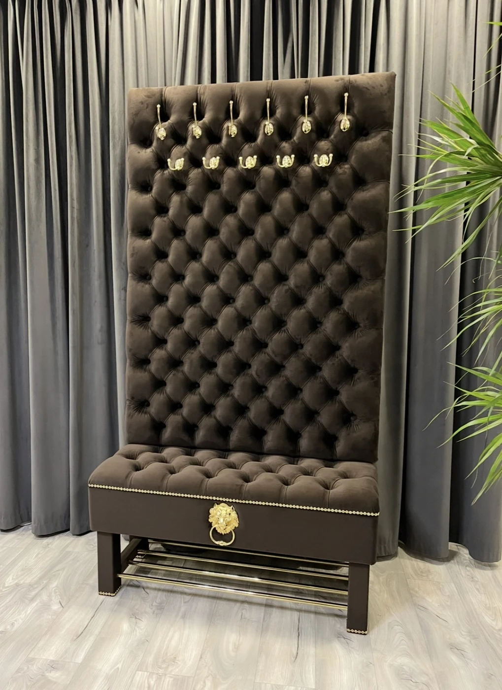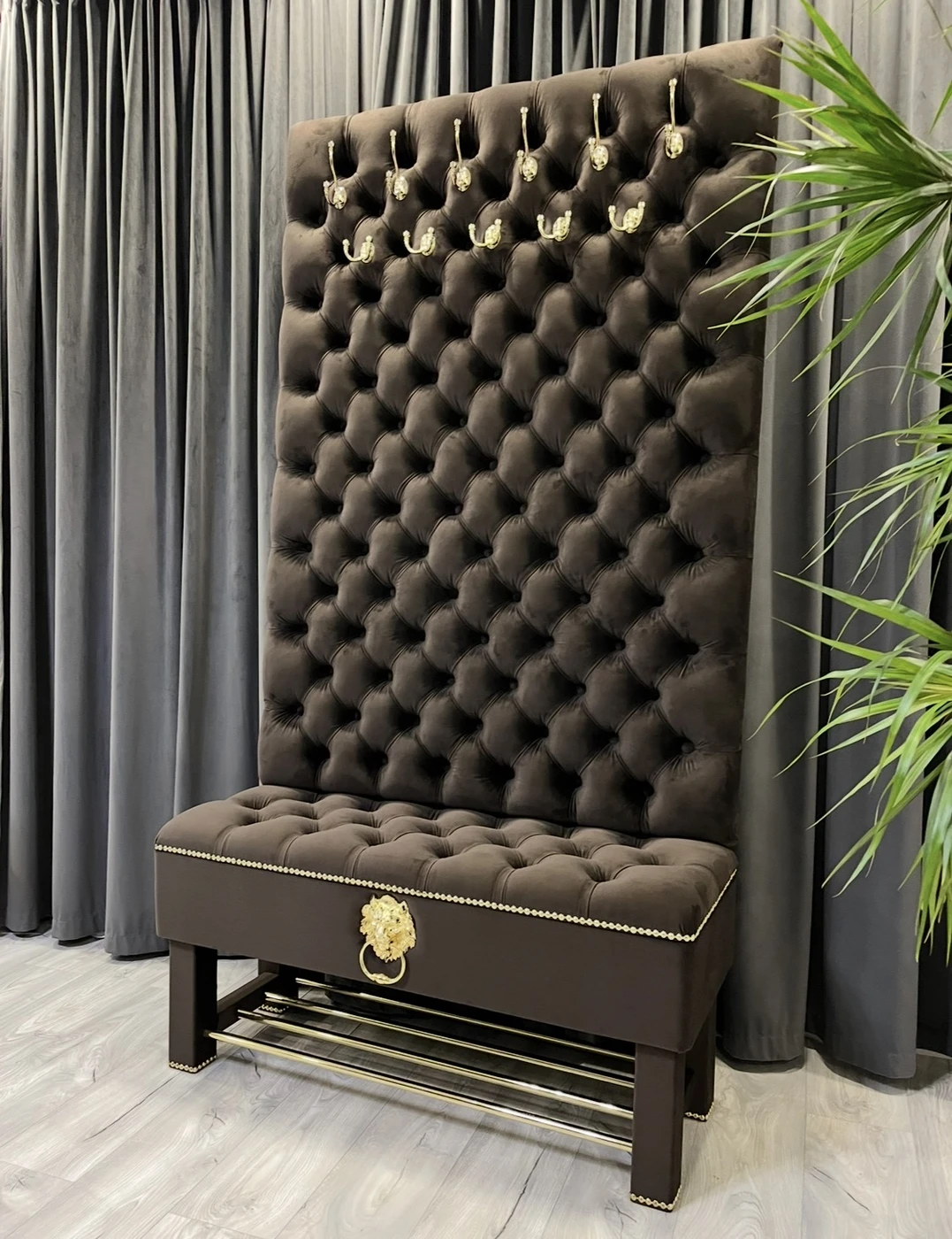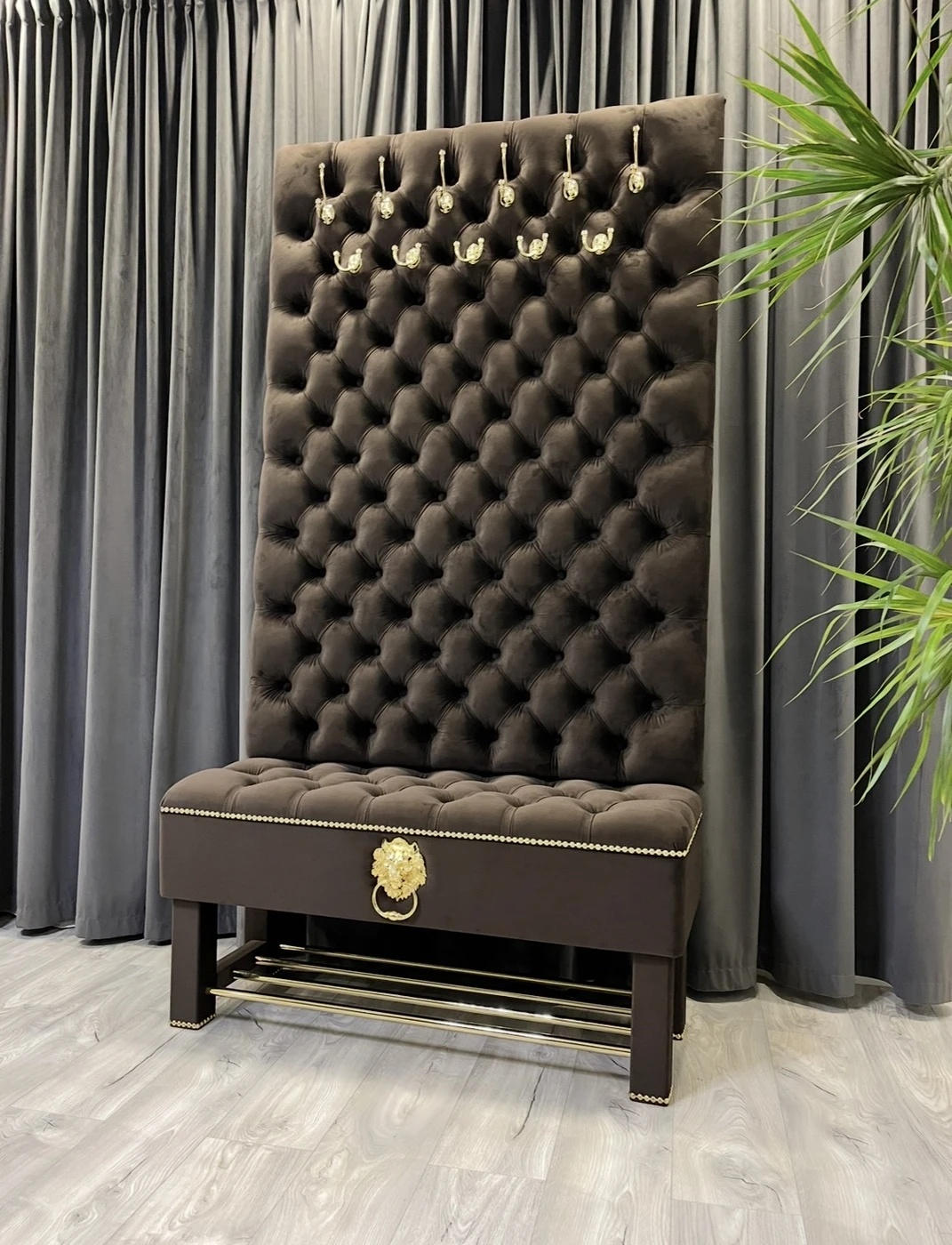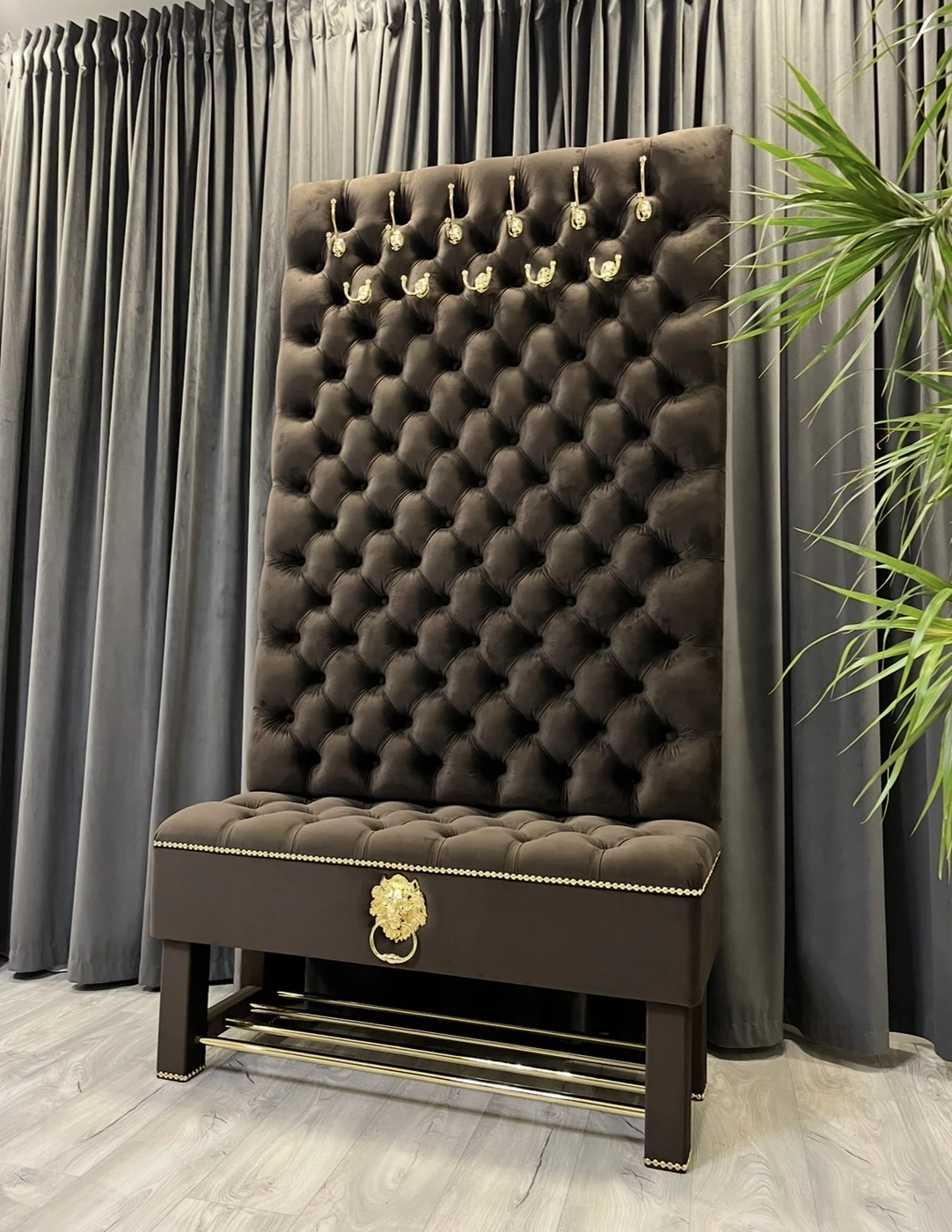 Gaminame prieškambario baldus pagal individualų užsakymą, pritaikytus konkrečiai jūsų erdvei ir interjerui. Nuotraukoje matomas prabangus prieškambario komplektas su daiktadėže ir rūbų kabykla, kuriame suderinta reprezentatyvi išvaizda, patogus naudojimas ir keli praktiški sprendimai viename balde. Šis modelis pagamintas iš aukštos kokybės rudos spalvos aksominio veliūro. Audinys atrodo prabangiai, yra malonus liesti ir puikiai tinka prieškambario erdvei, kur norisi ne tik tvarkos, bet ir estetiško vaizdo. Dekorui parinktos aukso spalvos detalės: masyvūs kabliukai rūbams, dekoratyvinė liūto galva su žiedu, baldinių vinių juosta ir metalinės batų grotelės. Visos detalės tarpusavyje suderintos taip, kad baldas atrodytų vientisai, solidžiai ir išskirtinai. Viršutinė šio prieškambario baldo dalis yra aukšta ir minkštai aptraukta rūbų kabykla, skirta paltams, striukėms, rankinėms ar kitiems dažniausiai prieškambaryje laikomiems daiktams. Tokia konstrukcija leidžia patogiai išnaudoti vertikalią erdvę ir kartu sukuria prabangų, akį traukiantį vaizdą. Apatinėje dalyje įrengta talpi daiktadėžė , kuri suteikia papildomos vietos tvarkingai laikyti daiktus. Po ja sumontuotos metalinės grotelės batams, todėl viename modelyje sujungtos kelios svarbios funkcijos. Dėl to šis baldas tinka žmonėms, kurie ieško ne tik gražaus, bet ir maksimaliai praktiško sprendimo prieškambariui. Šis prieškambario komplektas yra puikus pasirinkimas tiems, kurie vertina kokybę, individualią gamybą ir nori baldo, pritaikyto būtent jų namams. Gaminame įvairių dydžių prieškambario baldus, todėl galima keisti ne tik spalvą, audinį ar dekoracijas, bet ir matmenis pagal jūsų poreikį. Matmenys: Plotis – 110 cm Gylis – 40 cm Aukštis – 205 cm Jeigu ieškote kokybiškų ir išskirtinių prieškambario baldų su batų dėže ir rūbų kabykla, šis modelis yra puikus pasirinkimas tiek klasikiniam, tiek prabangesniam interjerui. Užsakymai ir konsultacijos: Tel. +370 624 04026 El. paštas: [email protected]