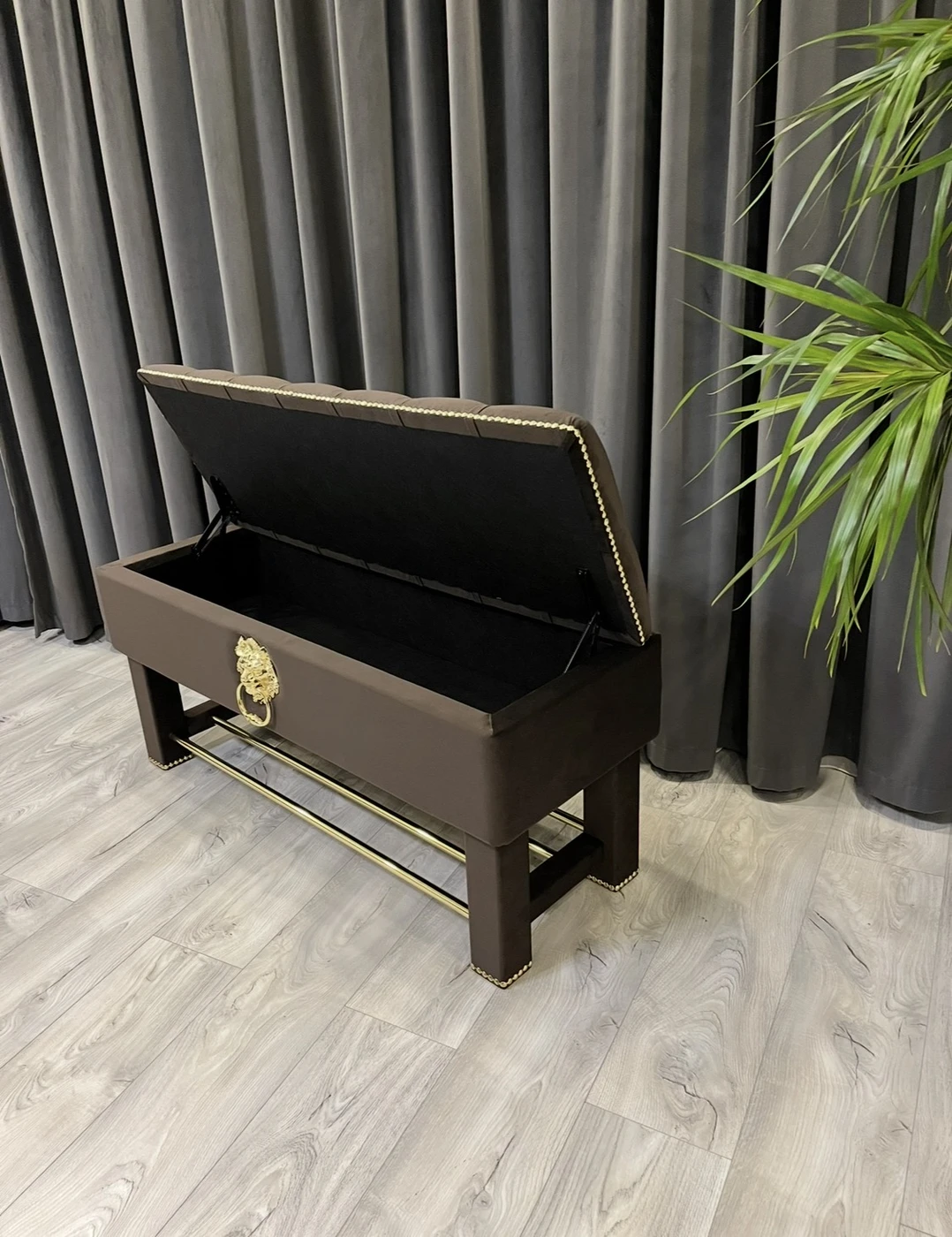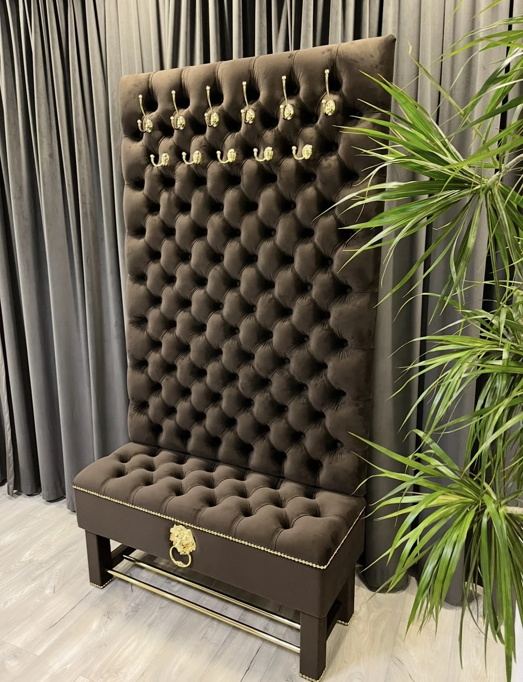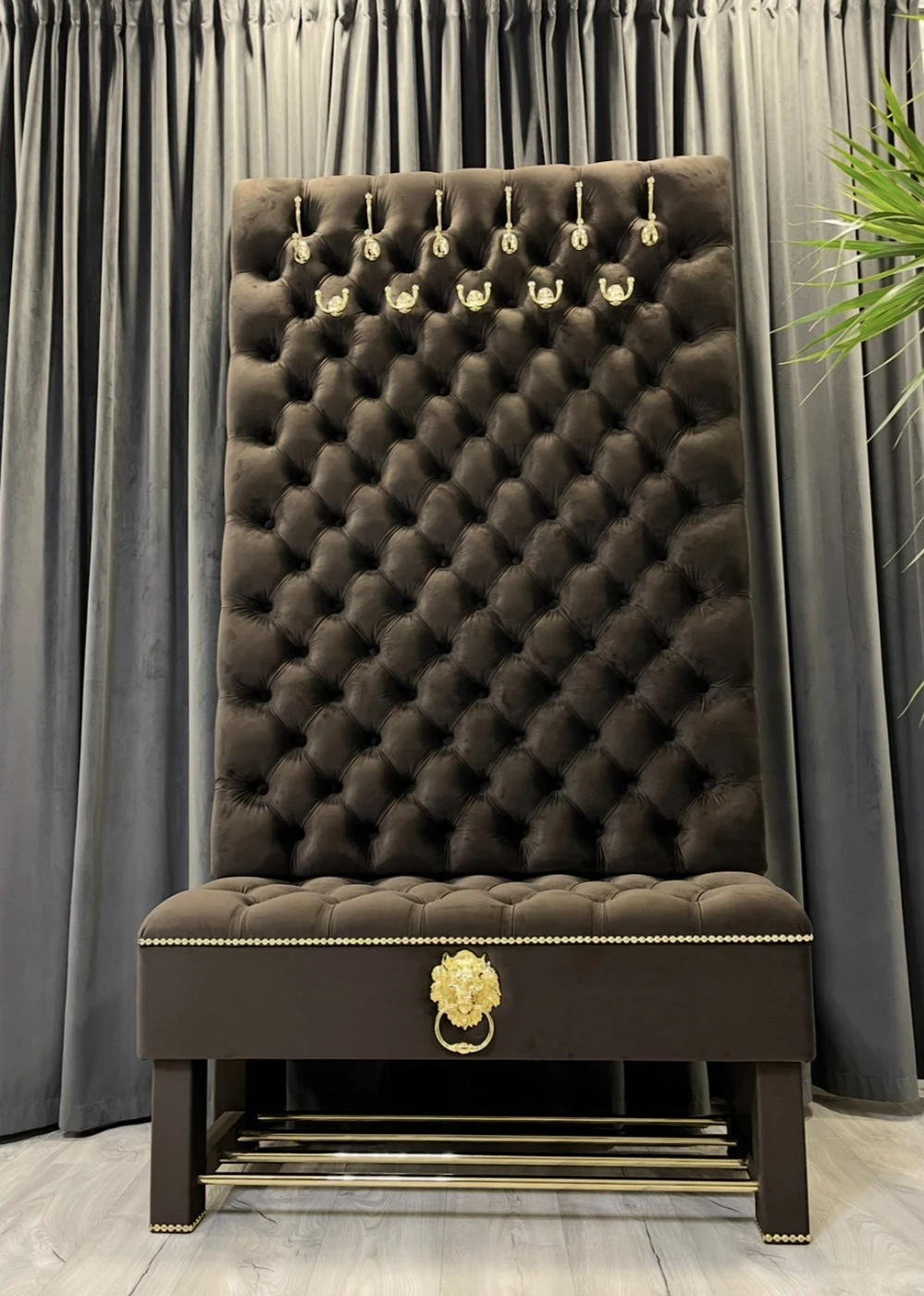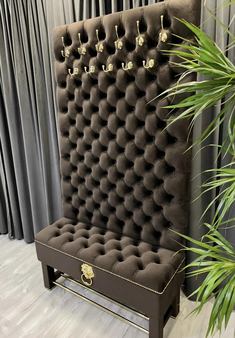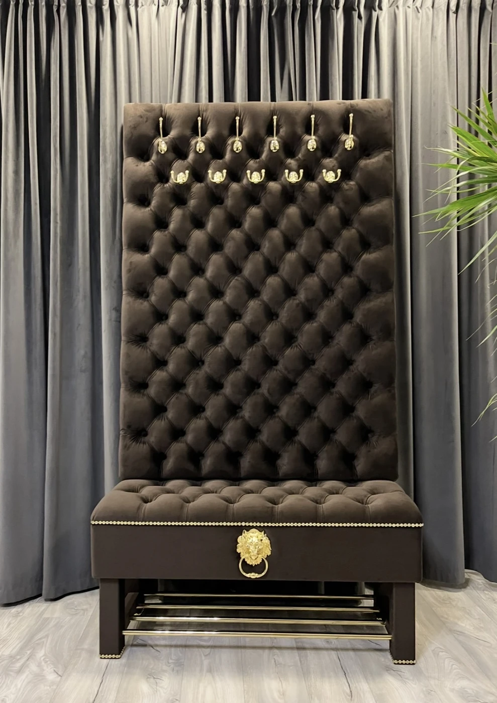 Gaminame prieškambario baldus pagal individualų užsakymą, pritaikytus konkrečiai jūsų erdvei ir interjerui. Nuotraukoje matomas prabangus prieškambario komplektas su daiktadėže ir rūbų kabykla, kuriame suderinta reprezentatyvi išvaizda, patogus naudojimas ir keli praktiški sprendimai viename balde. Šis modelis pagamintas iš aukštos kokybės rudos spalvos aksominio veliūro. Audinys atrodo prabangiai, yra malonus liesti ir puikiai tinka prieškambario erdvei, kur norisi ne tik tvarkos, bet ir estetiško vaizdo. Dekorui parinktos aukso spalvos detalės: masyvūs kabliukai rūbams, dekoratyvinė liūto galva su žiedu, baldinių vinių juosta ir metalinės batų grotelės. Visos detalės tarpusavyje suderintos taip, kad baldas atrodytų vientisai, solidžiai ir išskirtinai. Viršutinė šio prieškambario baldo dalis yra aukšta ir minkštai aptraukta rūbų kabykla, skirta paltams, striukėms, rankinėms ar kitiems dažniausiai prieškambaryje laikomiems daiktams. Tokia konstrukcija leidžia patogiai išnaudoti vertikalią erdvę ir kartu sukuria prabangų, akį traukiantį vaizdą. Apatinėje dalyje įrengta talpi daiktadėžė , kuri suteikia papildomos vietos tvarkingai laikyti daiktus. Po ja sumontuotos metalinės grotelės batams, todėl viename modelyje sujungtos kelios svarbios funkcijos. Dėl to šis baldas tinka žmonėms, kurie ieško ne tik gražaus, bet ir maksimaliai praktiško sprendimo prieškambariui. Šis prieškambario komplektas yra puikus pasirinkimas tiems, kurie vertina kokybę, individualią gamybą ir nori baldo, pritaikyto būtent jų namams. Gaminame įvairių dydžių prieškambario baldus, todėl galima keisti ne tik spalvą, audinį ar dekoracijas, bet ir matmenis pagal jūsų poreikį. Matmenys: Plotis – 110 cm Gylis – 40 cm Aukštis – 205 cm Jeigu ieškote kokybiškų ir išskirtinių prieškambario baldų su batų dėže ir rūbų kabykla, šis modelis yra puikus pasirinkimas tiek klasikiniam, tiek prabangesniam interjerui. Užsakymai ir konsultacijos: Tel. +370 624 04026 El. paštas: [email protected]