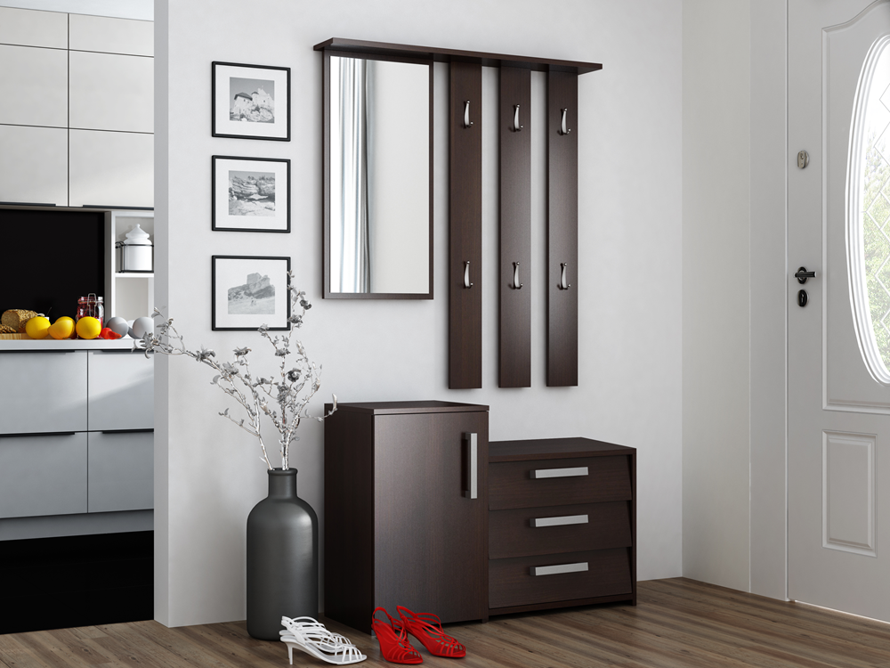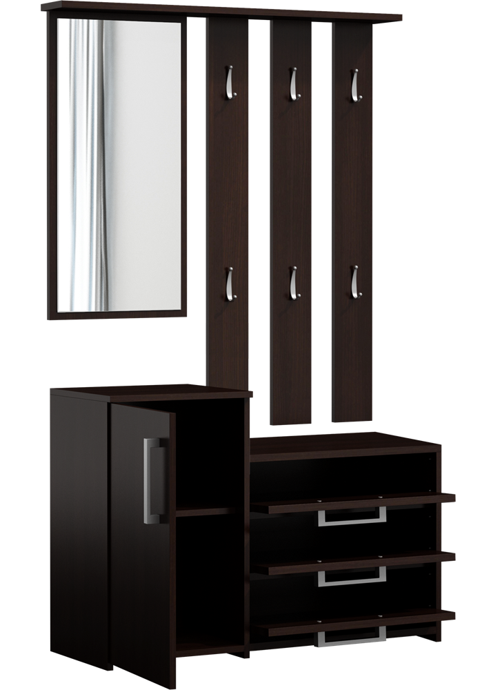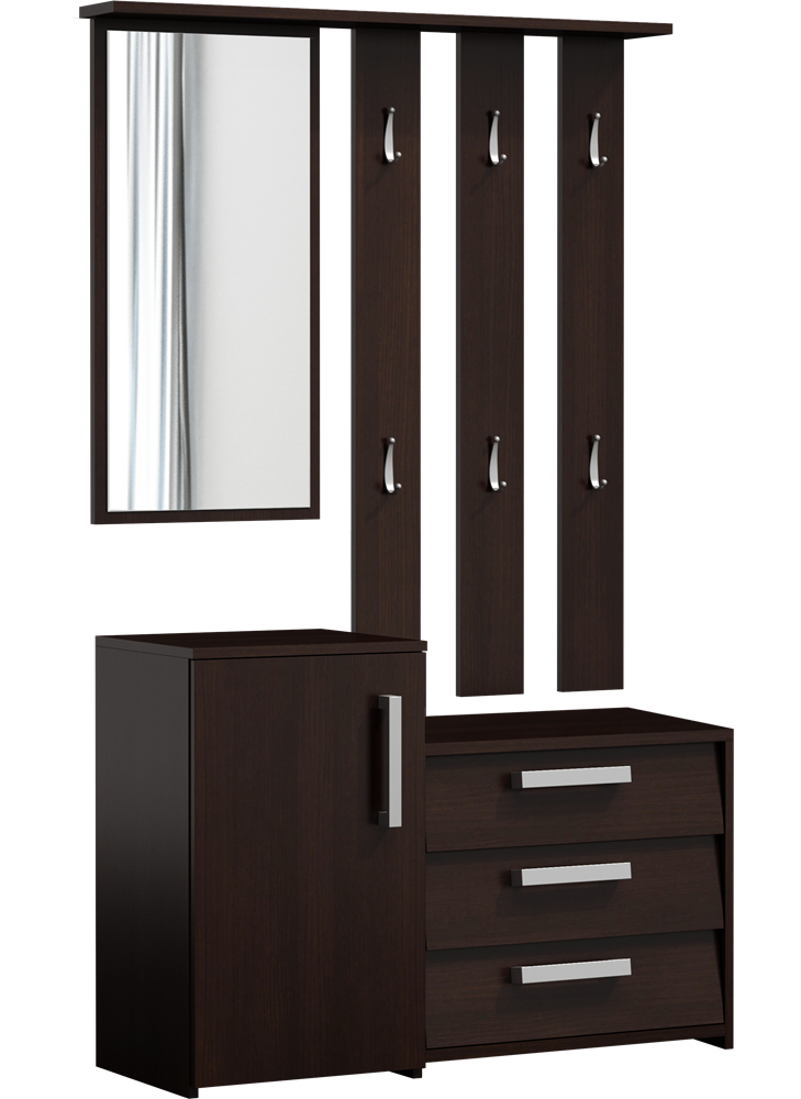 Prieškambario baldų komplektą sudaro kabykla su 6 kabliukais, veidrodis, spintelė ir batų spintelė;Prieškambario baldų komplektas pagamintas iš laminuotos medžio drožlių plokštės (MDP), storis – 16 mm;Kraštų apdailos medžiaga: ABS;Bendri prieškambario baldų komplekto išmatavimai: plotis – 99 cm, aukštis – 180 cm, gylis – 36 cm;Prieškambario baldų komplekto spalva: ruda (wenge);