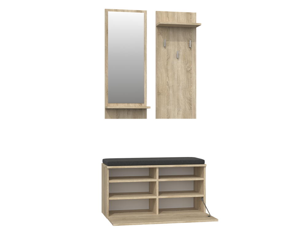 Prieškambario baldų komplektą sudaro kabykla su 3 kabliukais ir lentynėle, veidrodis su lentynėle, batų spintelė;Prieškambario baldų komplektas pagamintas iš laminuotos medžio drožlių plokštės (MDP), storis – 16 mm;Kraštų apdailos medžiaga: PVC;Pakabos/veidrodžio išmatavimai: plotis – 35 cm, aukštis – 90 cm, gylis – 16 cm;Batų spintelės išmatavimai: plotis – 85 cm, aukštis – 46 cm, gylis – 35 cm;Prieškambario baldų komplekto spalva: ąžuolo (sonoma);