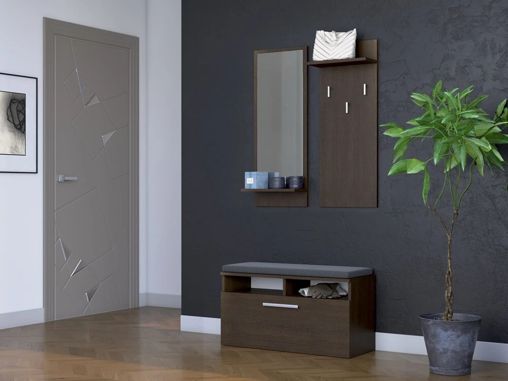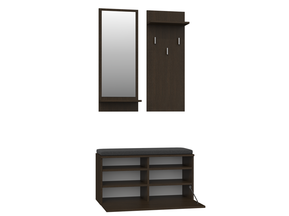 Prieškambario baldų komplektą sudaro kabykla su 3 kabliukais ir lentynėle, veidrodis su lentynėle, batų spintelė;Prieškambario baldų komplektas pagamintas iš laminuotos medžio drožlių plokštės (MDP), storis – 16 mm;Kraštų apdailos medžiaga: ABS;Pakabos/veidrodžio išmatavimai: plotis – 35 cm, aukštis – 90 cm, gylis – 16 cm;Batų spintelės išmatavimai: plotis – 85 cm, aukštis – 46 cm, gylis – 35 cm;Prieškambario baldų komplekto spalva: ruda (wenge);