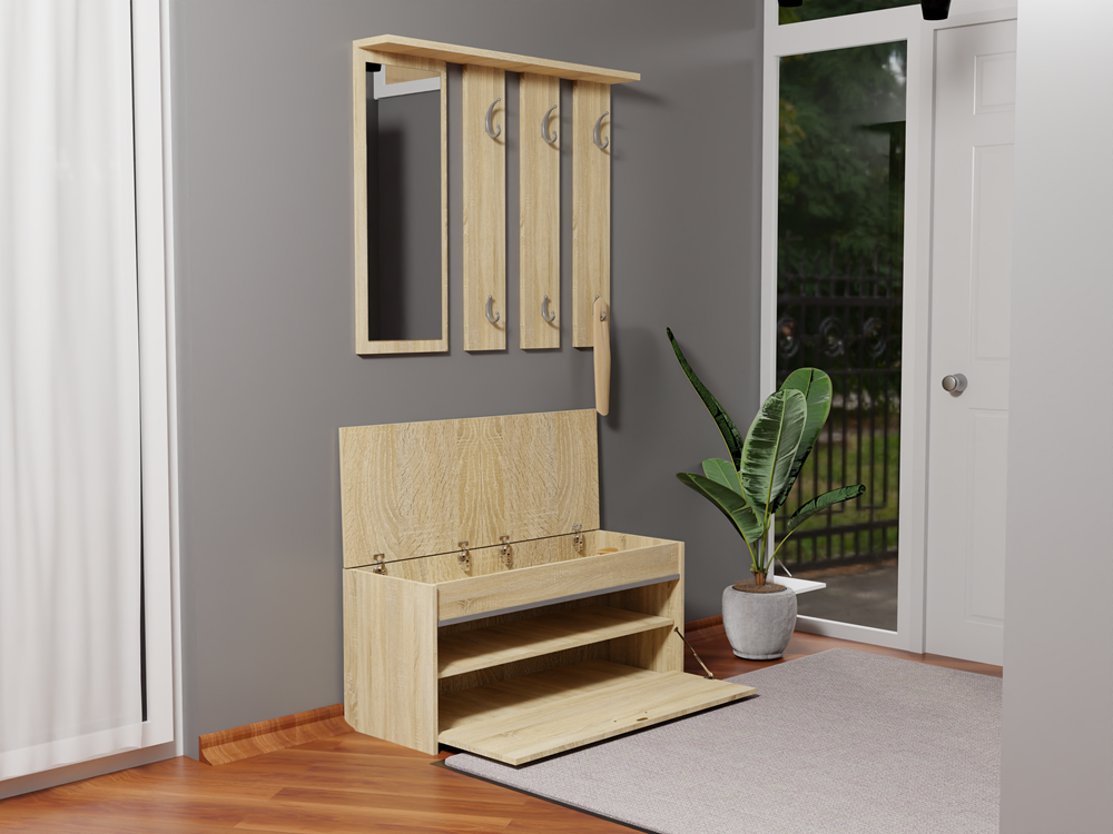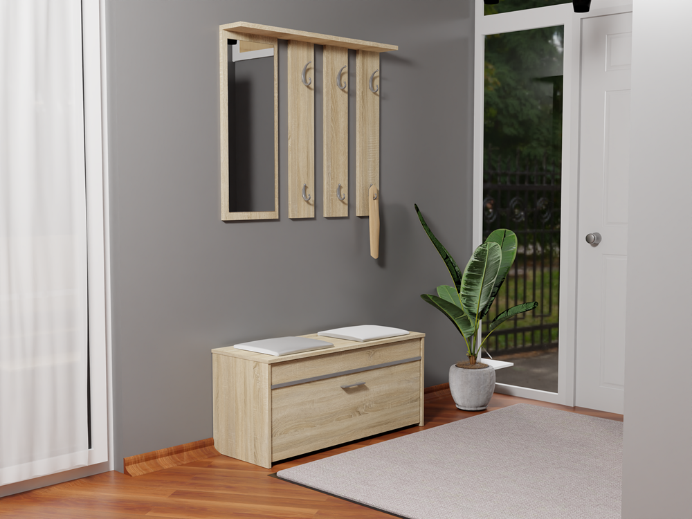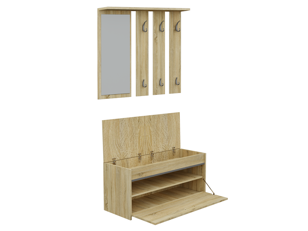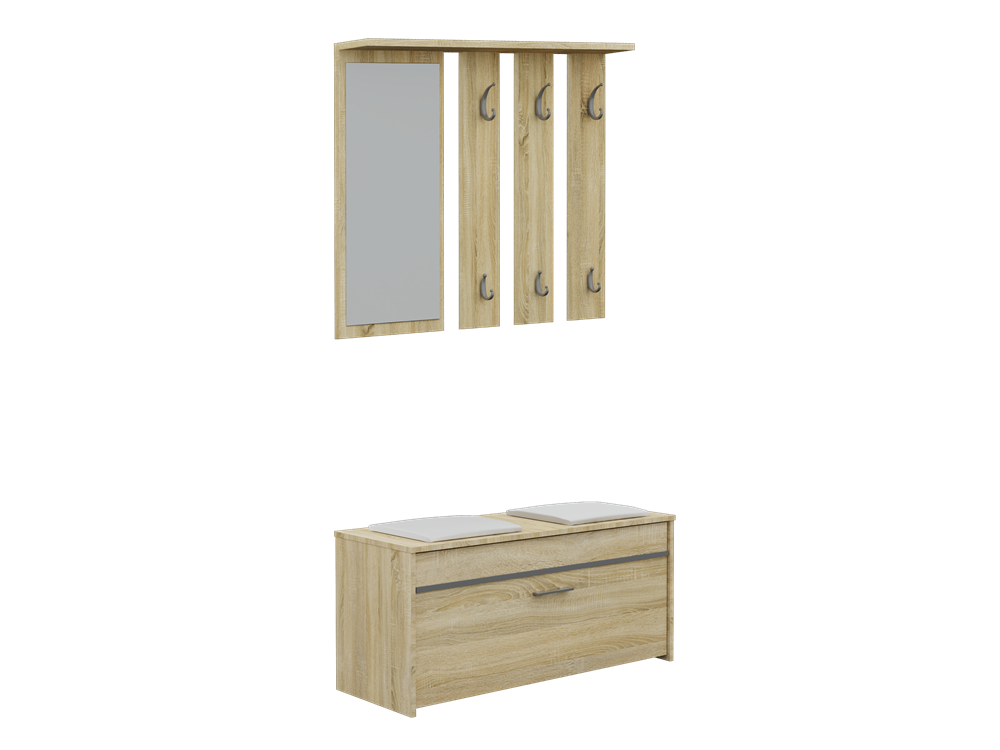 Komplektą sudaro veidrodis, kabykla ir batų spintelė;Komplektas pagamintas iš 16 mm storio laminuotos medžio drožlių plokštės (MDP) su PVC apdaila;Kabykla su 6 kabliukais;Batų spintelė su paminkštinta sėdimąja dalimi;Po sėdimąja dalimi - 8 cm gylio daiktadėžė smulkiems daiktams;Atverčiamų durelių viduje - 2 lentynos batams; Spintelė puošta dekoratyvine aliuminio juostele;Komplekto išmatavimai: aukštis – 180 cm, plotis - 85 cm, gylis - 41 cm;Spintelės išmatavimai: plotis - 100 cm, gylis - 38 cm, aukštis - 46 cm;Kabyklos su veidrodžiu išmatavimai: gylis - 14,7 cm, plotis - 100 cm, aukštis - 81,8 cm;Veidrodžio išmatavimai: plotis - 35 cm, aukštis - 81,8 cm;Komplekto spalva – ąžuolo (sonoma);