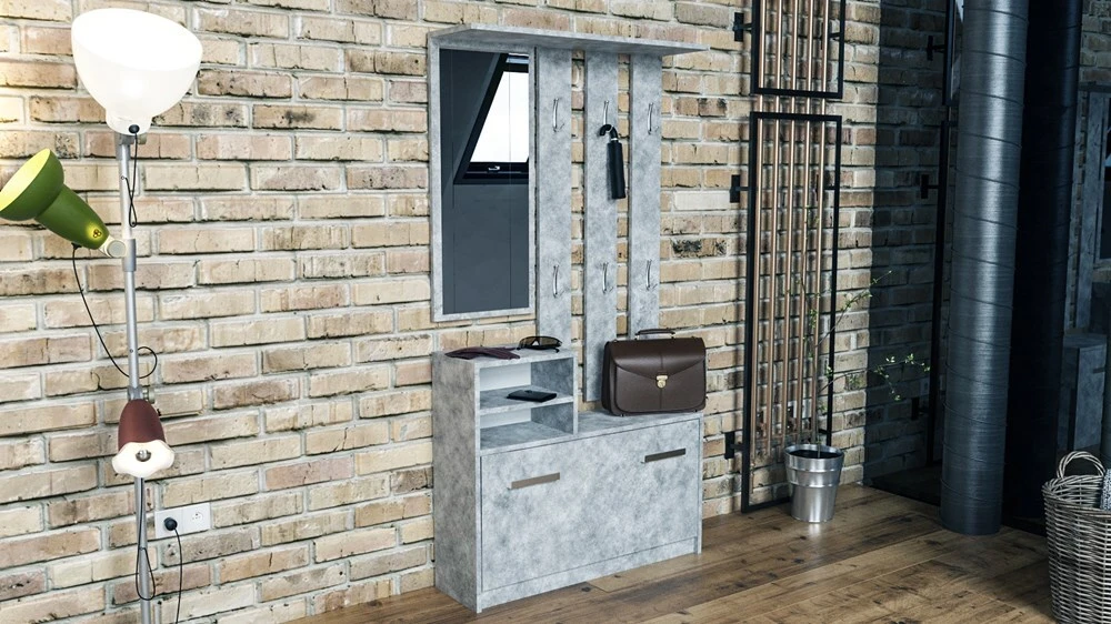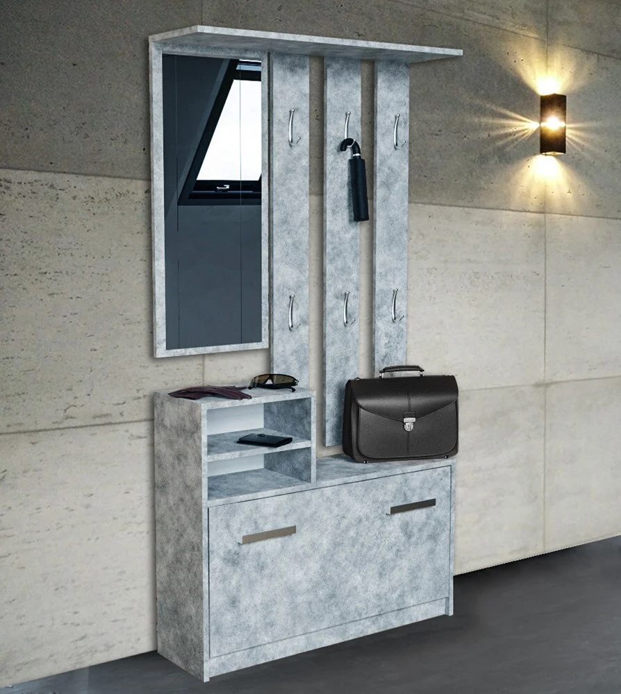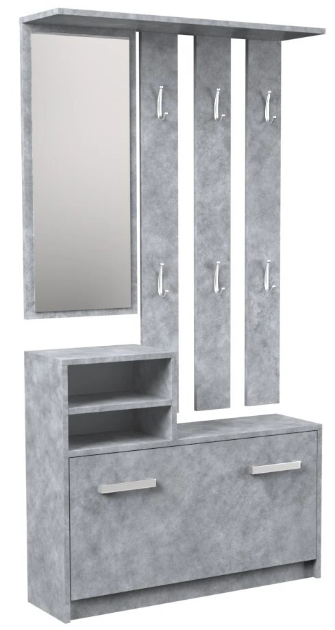 Komplektą sudaro veidrodis, kabykla ir batų spintelė su lentynomis Jūsų daiktams;Komplektas pagamintas iš 16 mm storio laminuotos medžio drožlių plokštės (MDP) su PVC apdaila;Kabykla su 6 kabliukais, kurios aukštį galite reguliuoti pagal asmeninius poreikius; Batų spintelė su dvejomis atviromis lentynomis;Batų spintelė talpina 8-9 batų poras; Komplekto išmatavimai: aukštis – 180 cm, plotis - 85 cm, gylis - 24 cm;Komplekto spalva – pilka (beton);