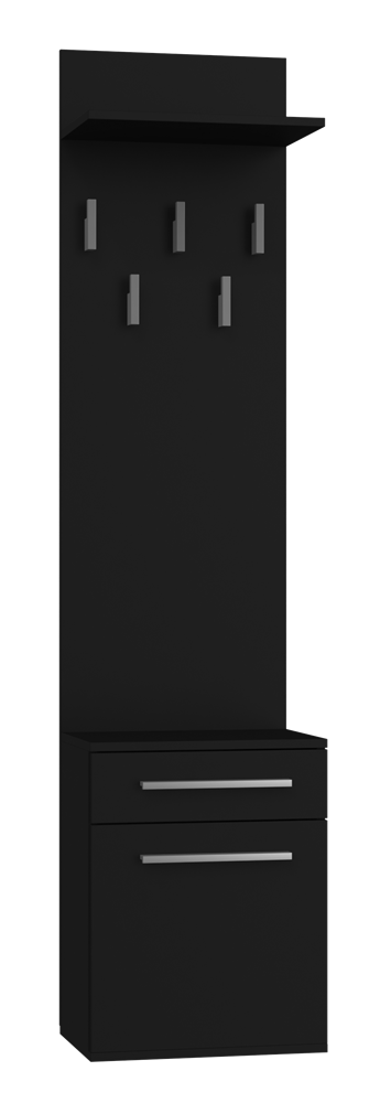 Praktiškas prieškambario komplektas;Komplektą sudaro kabykla ir spintelė;Pagaminta iš laminuotos medžio drožlių plokštės (MDP), storis - 16 mm;Komplekto kraštų apdailos medžiaga: PVC;Komplekto išmatavimai: plotis – 50 cm, aukštis – 181 cm, gylis – 35 cm;Kabyklos išmatavimai: plotis – 50 cm, aukštis – 124 cm, gylis – 27 cm;Spintelės išmatavimai: plotis – 50 cm, aukštis – 57 cm, gylis – 35 cm;Komplekto spalva: juoda;Kabykla su 5 kabliukais ir lentynėle;Spintelė;