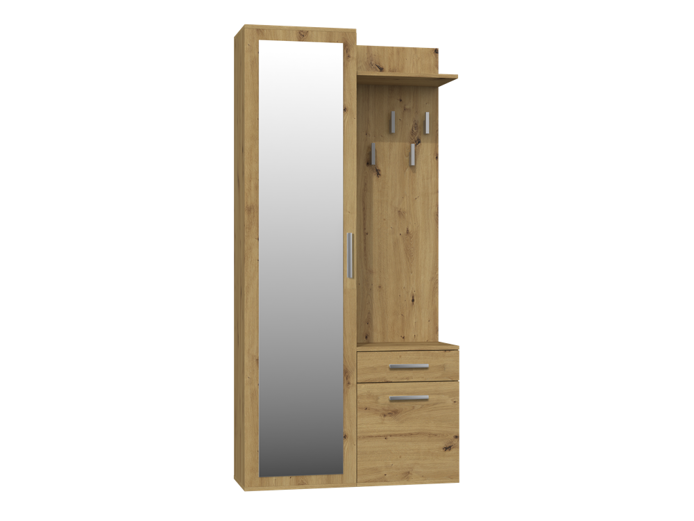 Praktiškas prieškambario komplektas;Komplektą sudaro spinta su veidrodžiu, kabykla ir spintelė;Pagaminta iš laminuotos medžio drožlių plokštės (MDP), storis - 16 mm;Komplekto kraštų apdailos medžiaga: PVC;Komplekto išmatavimai: plotis – 100 cm, aukštis – 180 cm, gylis – 35 cm;Spintos išmatavimai: plotis – 50 cm, aukštis – 180 cm, gylis – 35 cm;Kabyklos išmatavimai: plotis – 50 cm, aukštis – 124 cm, gylis – 27 cm;Spintelės išmatavimai: plotis – 50 cm, aukštis – 57 cm, gylis – 35 cm;Komplekto spalva: šviesiai ruda (dab artisan);Spinta su veidrodžiu, 2 lentynomis ir laikikliu pakaboms;Kabykla su 4 kabliukais;Spintelė su stalčiumi, 2 atviromis lentynomis;