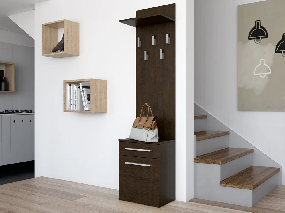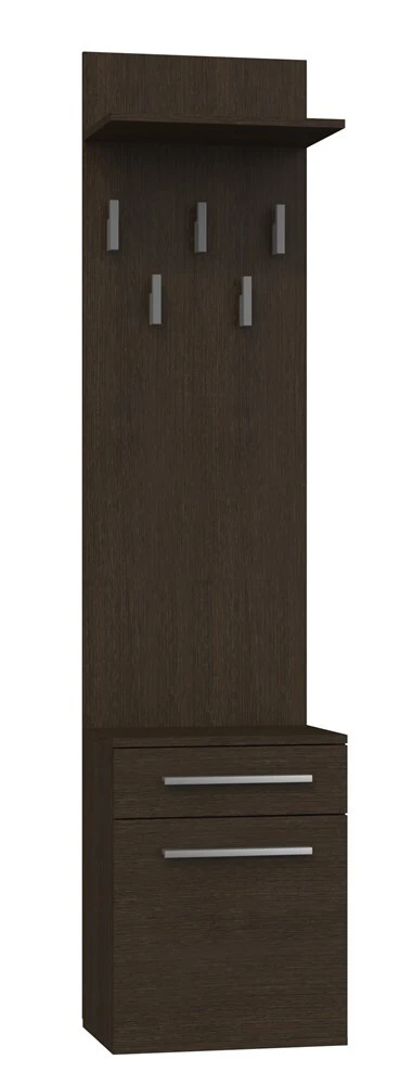 Praktiškas prieškambario komplektas;Komplektą sudaro kabykla ir spintelė;Pagaminta iš laminuotos medžio drožlių plokštės (MDP), storis - 16 mm;Komplekto kraštų apdailos medžiaga: PVC;Komplekto išmatavimai: plotis – 50 cm, aukštis – 181 cm, gylis – 35 cm;Kabyklos išmatavimai: plotis – 50 cm, aukštis – 124 cm, gylis – 27 cm;Spintelės išmatavimai: plotis – 50 cm, aukštis – 57 cm, gylis – 35 cm;Komplekto spalva: tamsiai ruda (wenge);Kabykla su 5 kabliukais ir lentynėle;Spintelė;