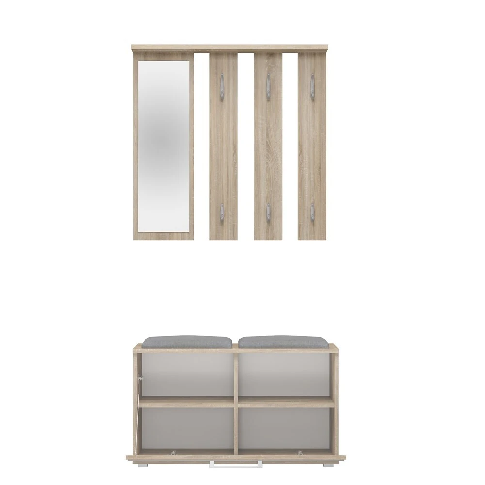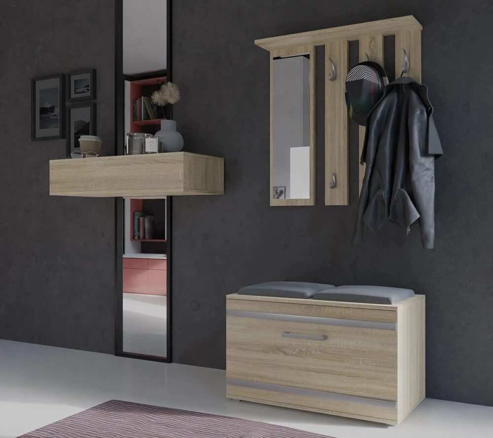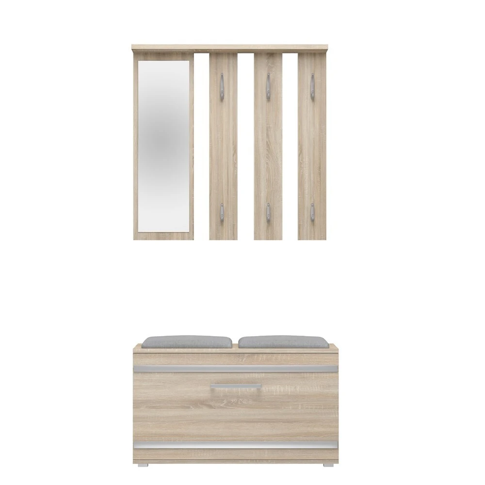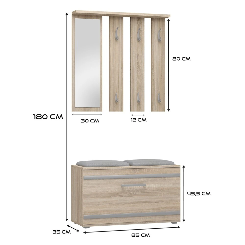 Komplektą sudaro veidrodis, kabykla ir batų spintelė;Komplektas pagamintas iš 16 mm storio laminuotos medžio drožlių plokštės (MDP) su PVC apdaila;Kabykla su 6 kabliukais;Batų spintelė su keturiais skyriais; Komplekto išmatavimai: aukštis – 180 cm, plotis - 85 cm, gylis - 35 cm;Spintelės išmatavimai: gylis - 35 cm, plotis - 85 cm, aukštis - 45 cm;Kabyklos išmatavimai: gylis - 15 cm, plotis - 85 cm, aukštis - 82 cm;Komplekto spalva – ąžuolo (sonoma);