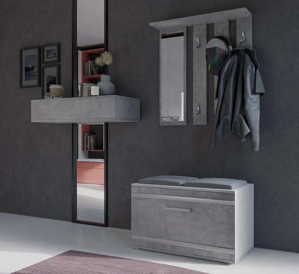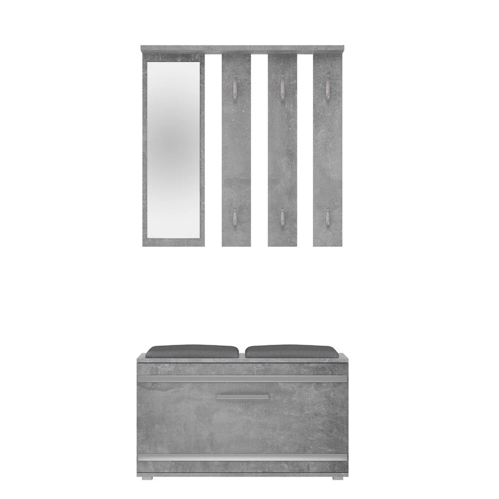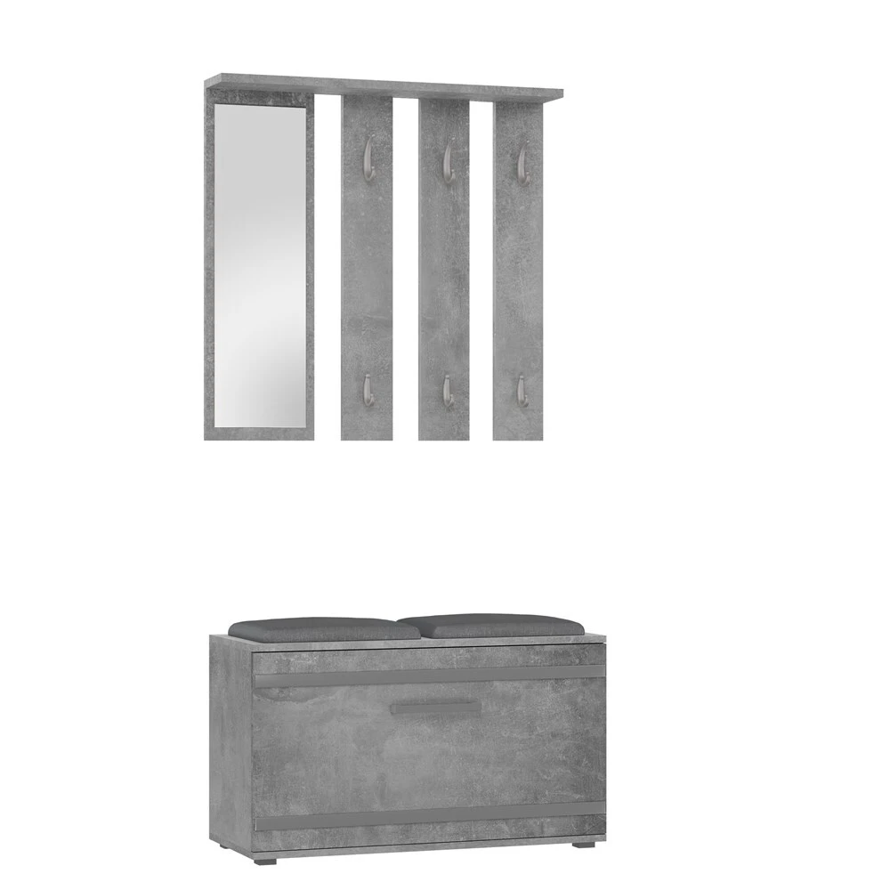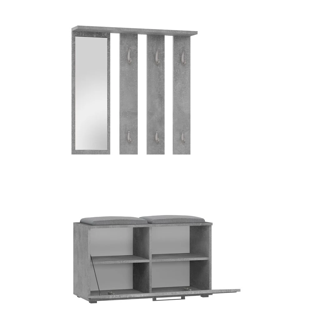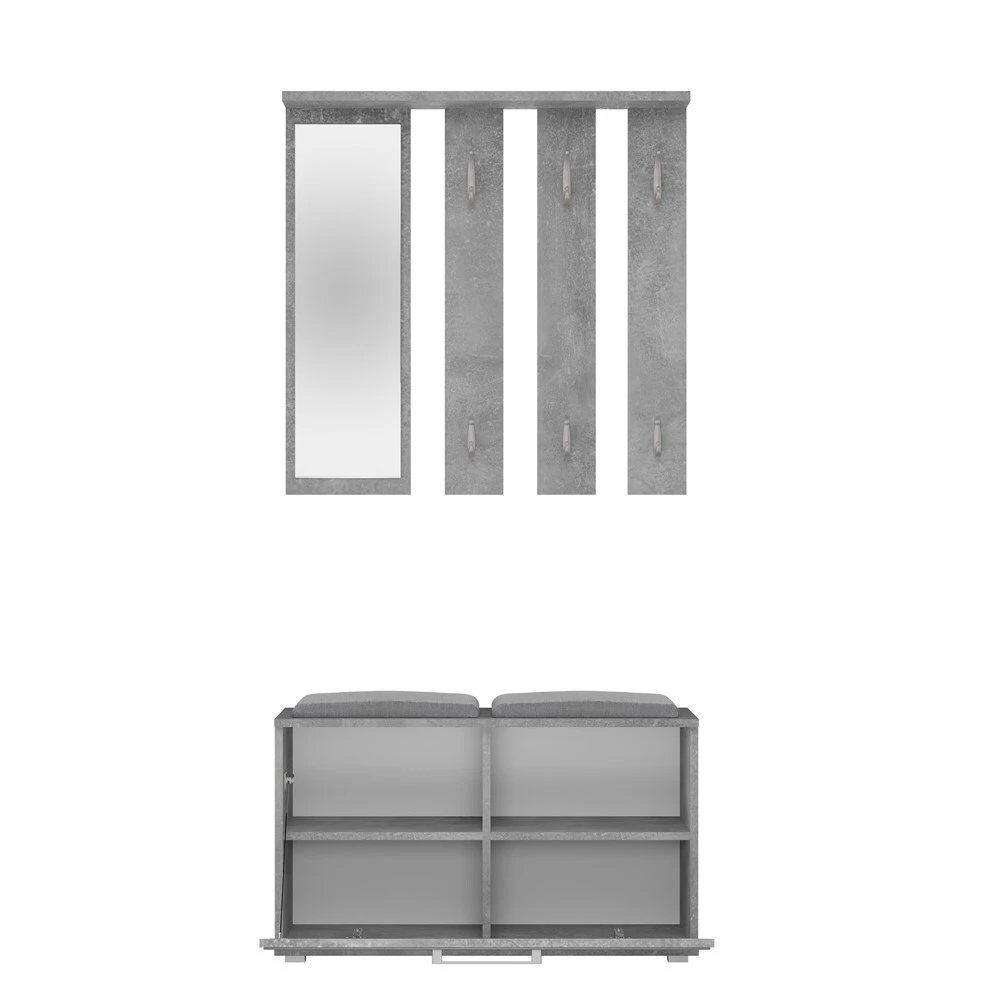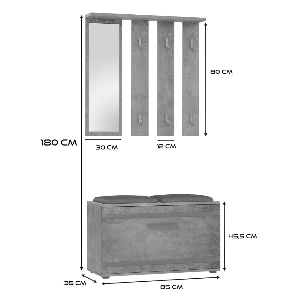 Prieškambario baldų komplektą sudaro kabykla su 6 kabliukais ir veidrodžiu, batų spintelė;Prieškambario baldų komplektas pagamintas iš laminuotos medžio drožlių plokštės (MDP), storis – 16 mm;Kraštų apdailos medžiaga: ABS;Bendri prieškambario baldų komplekto išmatavimai: plotis – 85 cm, aukštis – 180 cm, gylis – 35 cm;Prieškambario baldų komplekto spalva: pilka;
