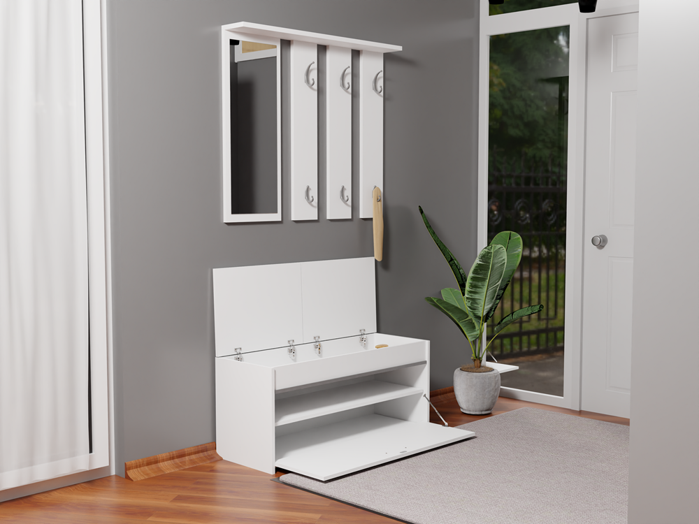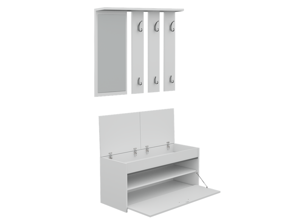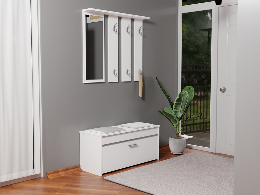 Praktiškas prieškambario komplektas;Komplektą sudaro veidrodis, kabykla ir batų spintelė;Pagaminta iš laminuotos medžio drožlių plokštės (MDP), storis - 16 mm;Komplekto kraštų apdailos medžiaga: ABS;Komplekto išmatavimai: plotis – 100 cm, gylis – 38 cm, aukštis – 143 cm (priklausomai nuo montavimo);Kabyklos išmatavimai: plotis – 100 cm, aukštis – 81,8 cm, gylis – 14,7 cm;Batų spintelės išmatavimai: plotis – 100 cm, aukštis – 46 cm, gylis – 38 cm;Komplekto spalva: balta;Kabykla su 6 kabliukais;Batų spintelė supaminkštinta sėdimają dalimi, 2 lentynomis su durelėmis;