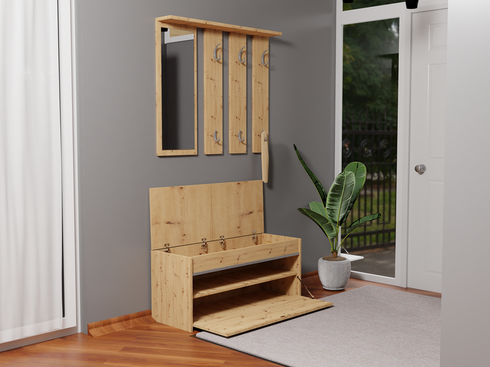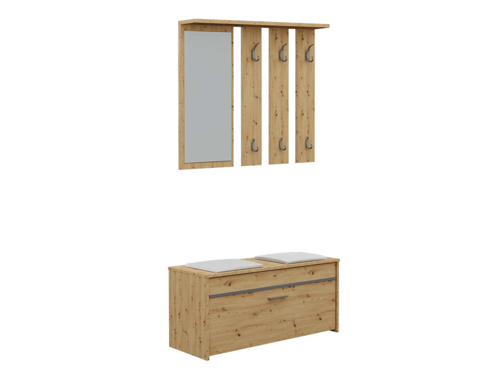 Praktiškas prieškambario komplektas;Komplektą sudaro veidrodis, kabykla ir batų spintelė;Pagaminta iš laminuotos medžio drožlių plokštės (MDP), storis - 16 mm;Komplekto kraštų apdailos medžiaga: ABS;Komplekto išmatavimai: plotis – 100 cm, gylis – 38 cm, aukštis – 180 cm (priklausomai nuo montavimo);Kabyklos išmatavimai: plotis – 100 cm, aukštis – 81,8 cm, gylis – 14,7 cm;Batų spintelės išmatavimai: plotis – 100 cm, aukštis – 46 cm, gylis – 38 cm;Komplekto spalva: smėlio (oak artisan);Kabykla su 6 kabliukais;Batų spintelė supaminkštinta sėdimają dalimi, 2 lentynomis su durelėmis;
