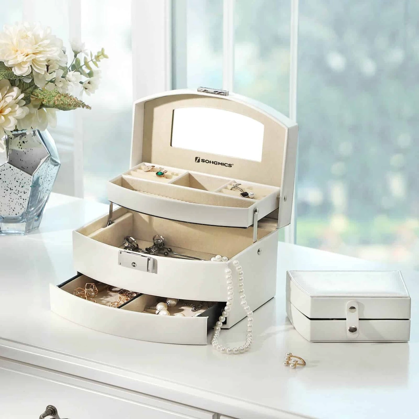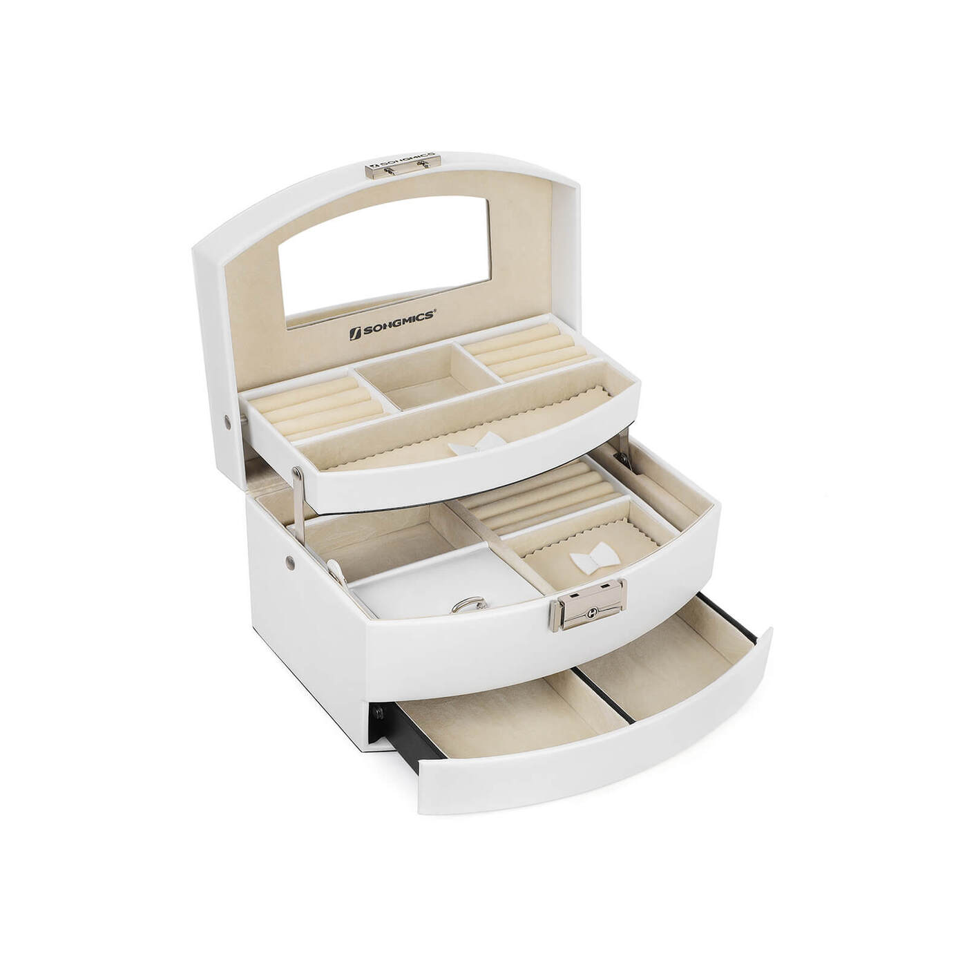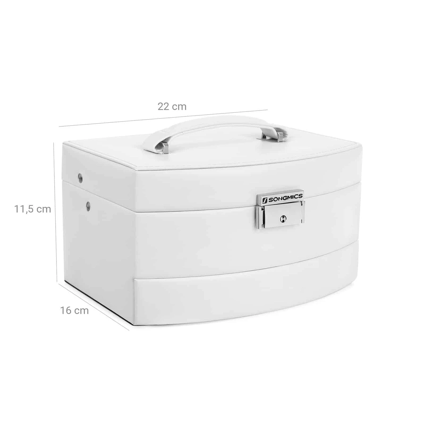 Aprašymas buvo automatiškai išverstas, gali pasitaikyti klaidų.Ar jus erzina, kad jūsų karoliai visada susipainioję, o žiedai guli kažkur bute? Tada laikas įsigyti šį elegantišką papuošalų laikiklį iš SONGMICS, kad galėtumėte tvarkingai laikyti vertingus papuošalus. Apsaugo visus jūsų aksesuarus Šioje papuošalų dėžutėje yra daug skyrių įvairiems papuošalams ir užtikrina, kad jūsų apyrankės, žiedai, auskarai, karoliai ir kt. bus saugiai laikomi. Minkštas aksominis pamušalas apsaugo jūsų papuošalus nuo įbrėžimų ir kitų pažeidimų. Dar didesnis pasirinkimas Siūlome jums rinktis iš įvairių dydžių ir spalvų papuošalų dėžučių; tiesiog ieškokite „SONGMICS juvelyrikos dėžutė“, kad sužinotumėte daugiau. Jei jūsų draugai taip pat yra papuošalų mylėtojai, viena iš šių dėžučių būtų ideali dovana!Išsami informacija apie gaminį: - Spalva: balta - Medžiaga: PU, MDF, aksomas - Gaminio dydis: 22 x 16 x 12,5 cm (I x P x A) - Mini dėžutės dydis: 14 x 9 x 6 cm (P x P x A) - Svoris: 1,1 kg Pakuotės turinys: - 1 x papuošalų dėžutė