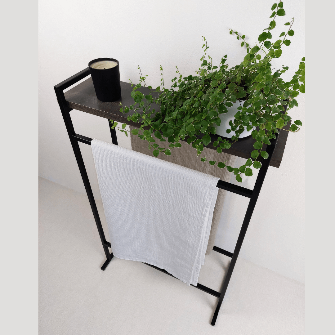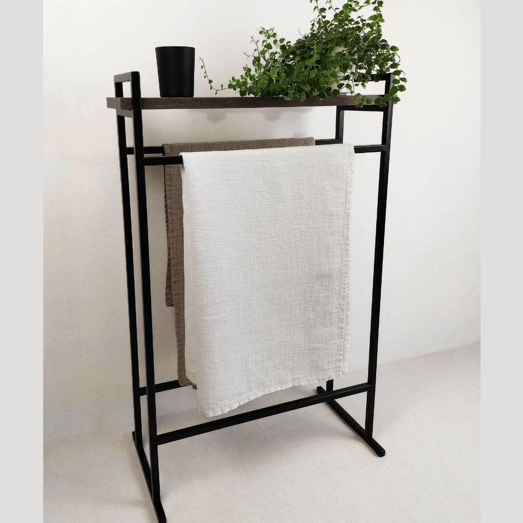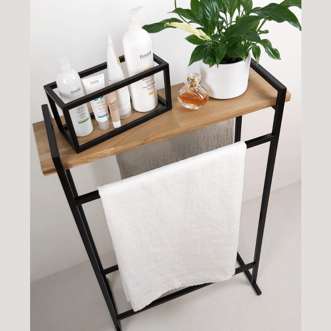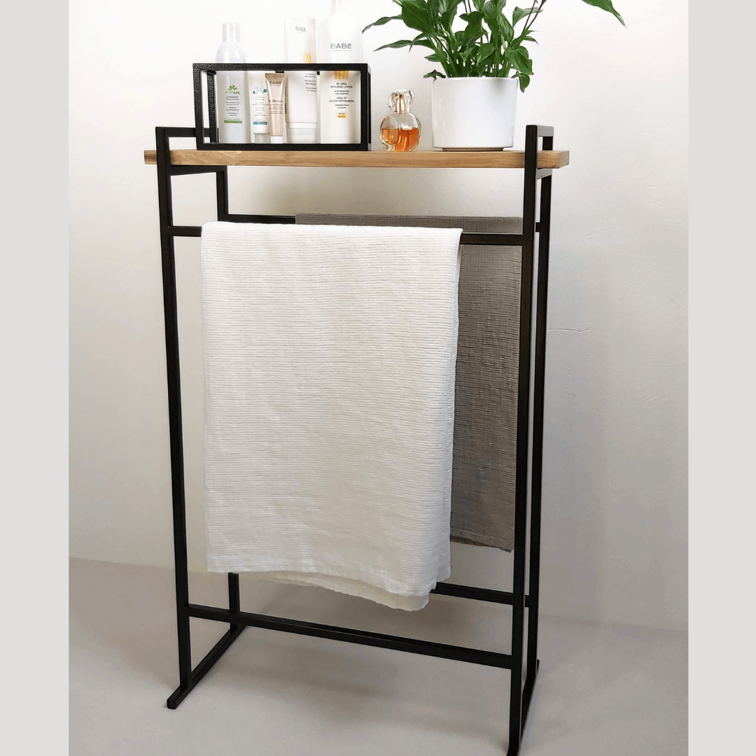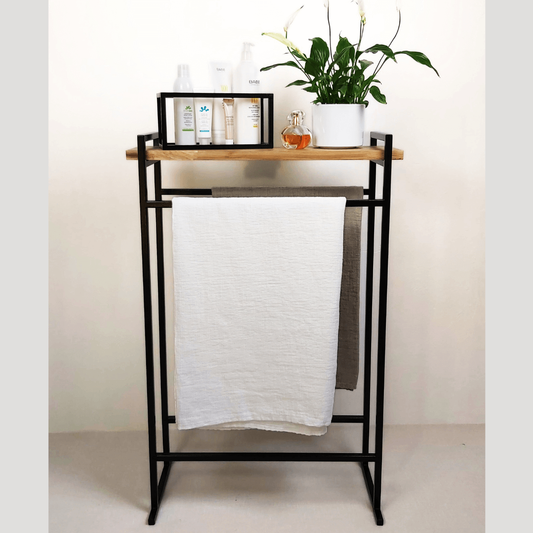 Rankų darbo tvirta pastatoma rankšluosčių kabykla su lentynėle stilingam vonios kambariui, pirčiai ar lauko terasai. Du laikikliai skirti pakabinti įvairių dydžių ir storių vonios, veido ar rankų rankšluosčius. Ant nedidelės lentynos bus patogu laikyti smulkius daiktus ar gėles, kurios jaukiai papuoš patalpą. Kompaktiška, patogaus aukščio kabykla padės maksimaliai išnaudoti vonios kambario erdvę ir susikurti SPA savo namuose. Taip pat puikiai tinka džiovinti pirties, paplūdimio rankšluosčius, maudymosi kostiumėlius ar kitus smulkius daiktus gryname ore ar balkone. Ši kabykla ras sau vietą ir lauko terasoje, kur sukabinsite pledus ar apsiaustus, kad vėsiais vakarais jie visada būtų Jums po ranka.