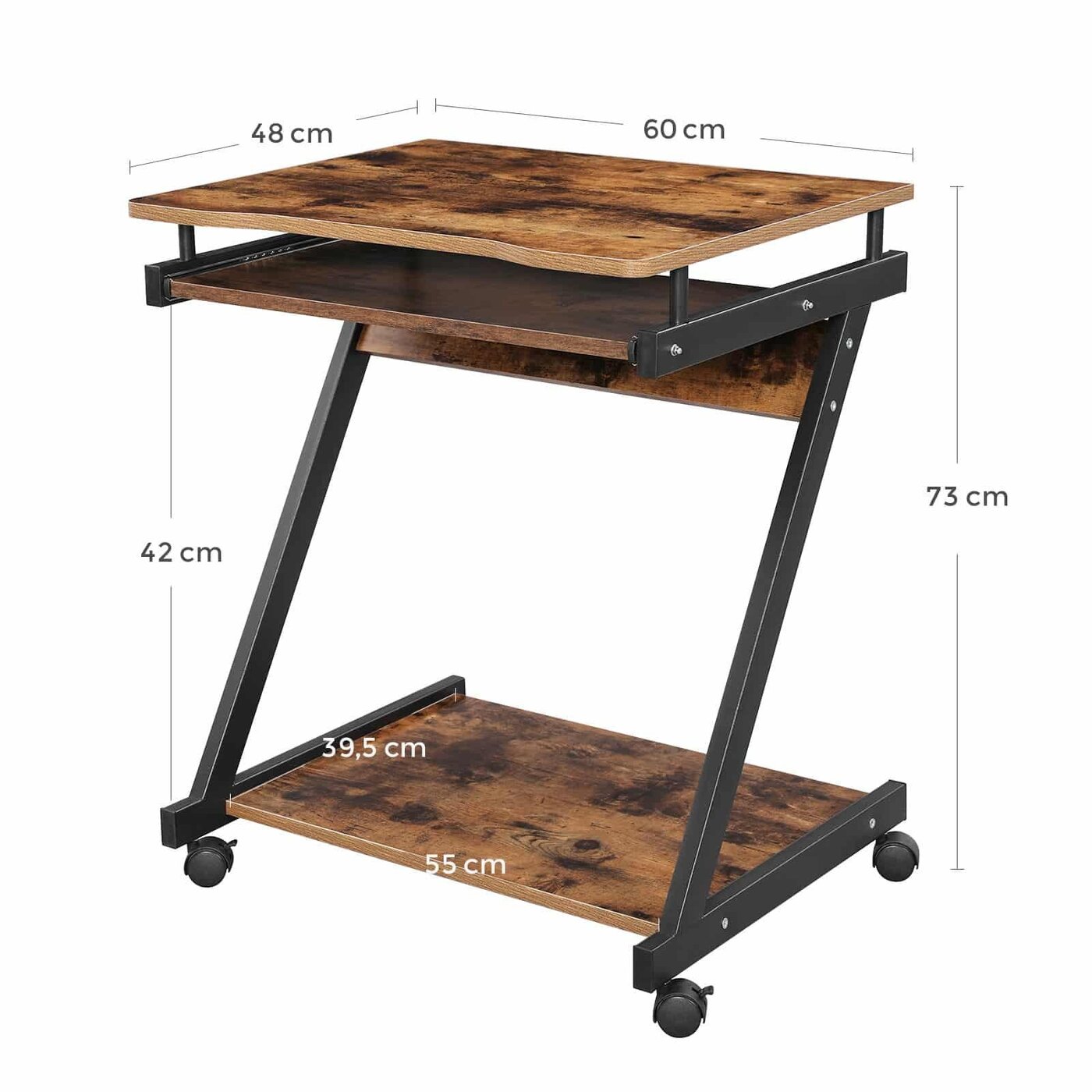 Aprašymas buvo automatiškai išverstas, gali pasitaikyti klaidų. Išsami informacija apie gaminį: - Spalva: vintažinė ruda-juoda - Medžiaga: vamzdinis plienas, medžio drožlių plokštė su melamino lukštu - Dydis: 60 x 48 x 73 cm (P x P x A) - Plokštės storis: 15 mm - Svoris: 9,5 kg - Maksimali statinė apkrova stalo paviršius: 30 kg - Maksimali statinė apkrova lentyna apatinėje srityje: 10 kgPristatymo komplektas:- 1 x kompiuterio stalas- 1 x priedų paketas- 1 x instrukcija (DE, EN, FR, ES, IT) VASAGLE Pastabos:- Saugumo sumetimais vaikams draudžiama lipti ant gaminio ar žaisti su juo .- Maksimalus statinis Stalviršio keliamoji galia yra 30 kg. Prašome neviršyti šio didžiausio svorio.