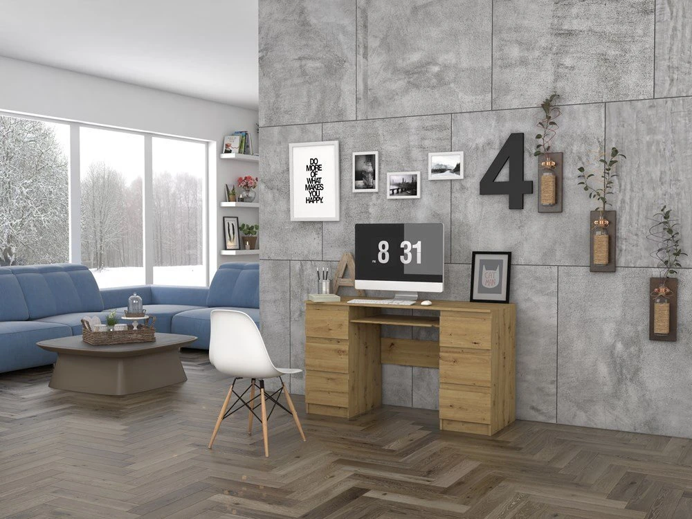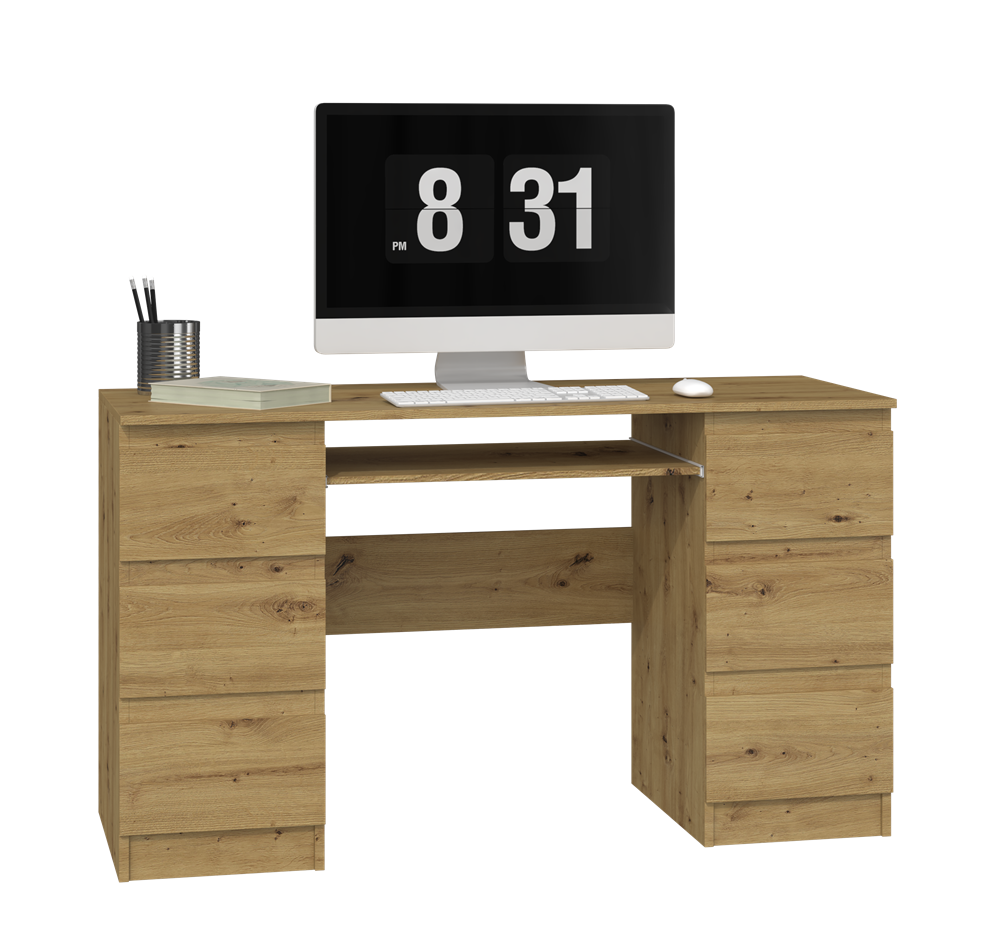 Modernaus dizaino rašomasis stalas;6 stalčiai;Ištraukiama klaviatūros lentyna;Pagamintas iš laminuotos medžio drožlių (MDP) plokštės;Stalo briaunos dailintos PVC danga, pasižyminčia dideliu mechaniniu ir cheminiu atsparumu;Išmatavimai: ilgis - 130 cm, aukštis - 76 cm, gylis - 51 cm.Spalva: ruda (artisan oak);Stalo paviršių galima valyti minkšta šluoste, nenaudojant stiprių cheminių valiklių.