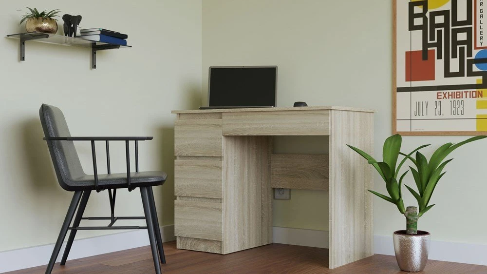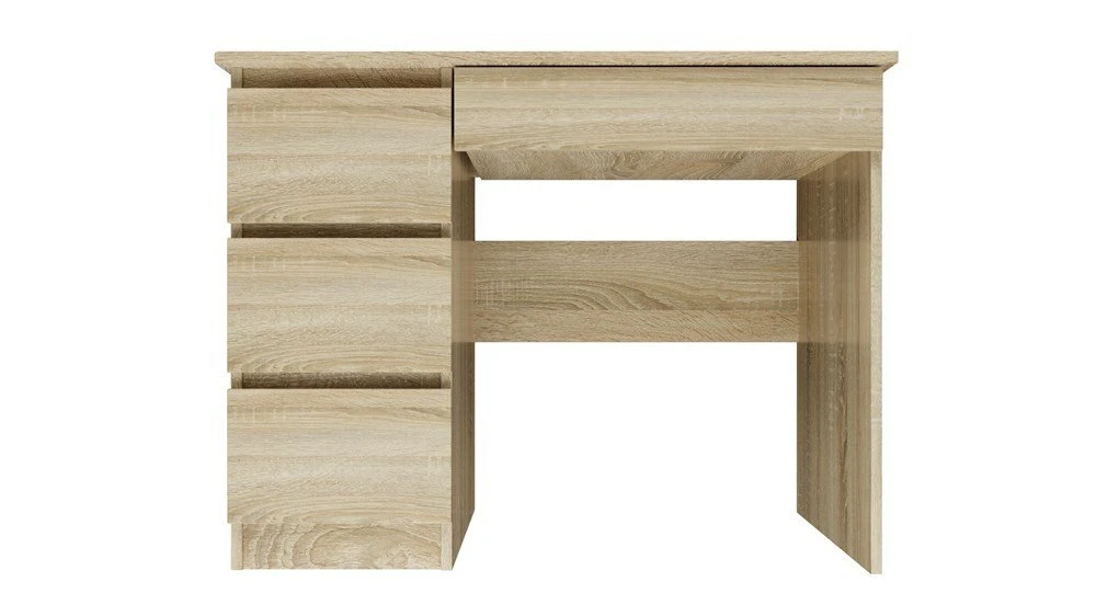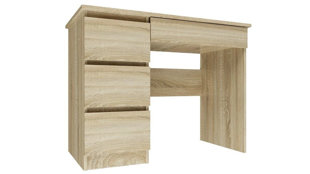 Funkcionalus rašomasis stalas su stalčiais. Stalas pagamintas iš laminuotos medžio drožlių plokštės (MDP) su ABS kraštų apdaila.Išmatavimai: aukštis - 76 cm, ilgis - 98 cm, gylis - 56 cm. Kairinis stalo variantas.Spalva: ąžuolo.