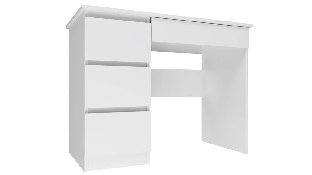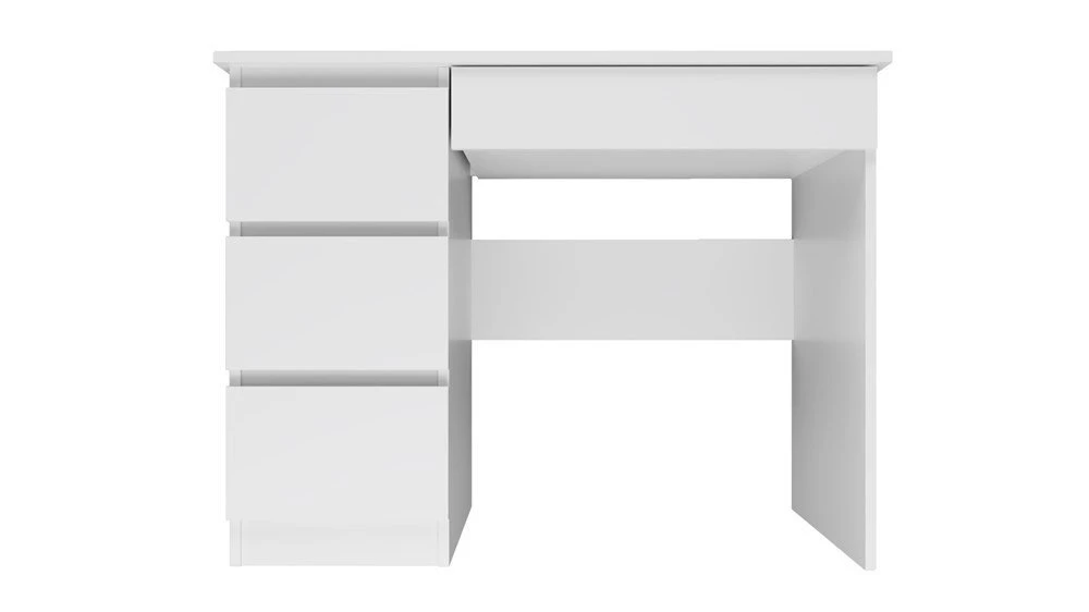 Modernaus dizaino rašomasis stalas;3 erdvūs stalčiai kairėje pusėje ir vienas stalčius dešinėje pusėje;Baldo orientacija: kairinis variantas;Stalas pagamintas iš 16 mm laminuotos medžio drožlių plokštės (MDP) su ABS kraštų apdaila;Stalo išmatavimai: ilgis – 98 cm, aukštis – 76 cm, gylis – 51 cm;Stalo spalva: balta (matinė);