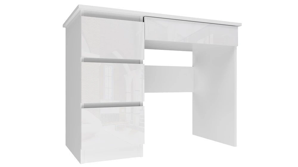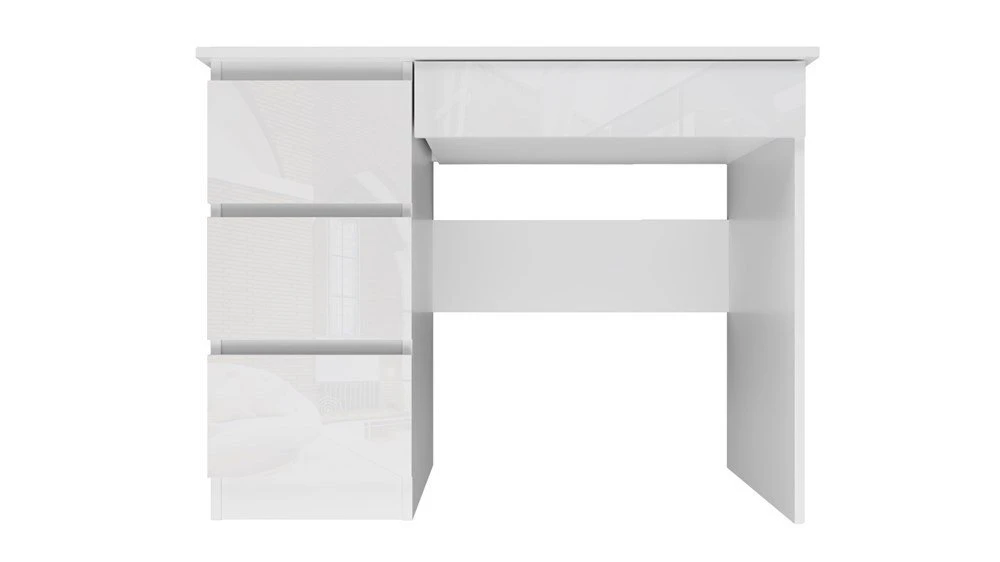 Modernaus dizaino rašomasis stalas;3 erdvūs stalčiai kairėje pusėje ir vienas stalčius dešinėje pusėje;Baldo orientacija: kairinis variantas;Stalas pagamintas iš 16 mm laminuotos medžio drožlių plokštės (MDP) su ABS kraštų apdaila;Stalo išmatavimai: ilgis – 98 cm, aukštis – 76 cm, gylis – 51 cm;Stalo spalva: balta (blizgi);