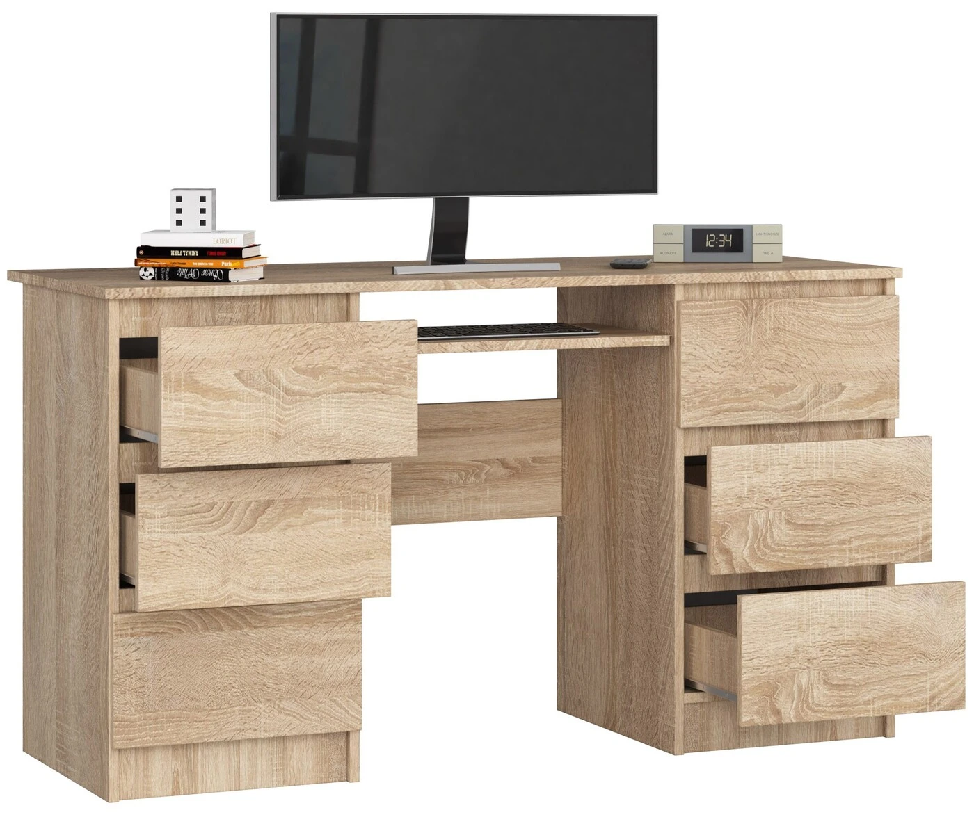 Aprašymas buvo automatiškai išverstas, gali pasitaikyti klaidų. Pristatome aukštos kokybės A-11 kompiuterio stalą, užtikrinantį didelį darbo komfortą ir pakankamai vietos mokyklinėms reikmenims ar kompiuterių priedams, tokiems kaip kompaktiniai diskai, atminties kortelės ir kt. maža įranga. Visa tai pagaminta iš kokybiškos medžiagos, kuri yra 16 mm storio laminuota plokštė. Stalo išmatavimai 135 × 70 × 55 cm, kurių pilnai pakanka patogiam mokymuisi, žaidimui ar darbui. Ant stalviršio gali tilpti stalinis kompiuteris, nešiojamas kompiuteris ar kitas įrenginys, pvz., žaidimų konsolė., ąžuolo spalvos ąžuolo spalvos rašomasis stalas yra su šešiais stalčiais, taip pat klaviatūros lentyna. Pateikto stalo viršuje ir priekyje yra atsparus trinčiai, todėl baldai nepraranda estetinės išvaizdos, net ir dažnai naudojami. Be to, visos briaunos yra apsaugotos nuo mechaninių pažeidimų, atsirandančių, pavyzdžiui, atsitrenkus į kėdę, faneruojant ABS kraštų juostele. Dėl to rašomasis stalas gali ilgai tarnauti savo šeimininkui, tai solidus ir patikimas baldas, puikiai tinkantis jaunimo kambariui. Stalčiai ir klaviatūros lentyna yra ant metalinių kreiptuvų, todėl jų atidarymas ir uždarymas yra sklandus ir nereikalauja daug jėgos. Rašomasis stalas klientui pristatomas kaip savaiminio surinkimo komplektas su aiškiomis instrukcijomis lenkų kalba. Komplekte taip pat yra reikalingi surinkimo elementai, o visos dalys yra kruopščiai pritvirtintos, kad jos nebūtų pažeistos transportuojant. - Rašomasis stalas iš dilimui atsparios laminuotos plokštės - Yra daug vietos bet kokiam išdėstymui - Stalčių ir durų fasadai pagaminti iš laminuotos plokštės - Stalčiai ir klaviatūros lentyna juda toliau metaliniai ritininiai kreiptuvai - Matomi kraštai padengti ABS briauna su padidintu atsparumu pažeidimams - Savarankiško surinkimo stalas - Pridedama instrukcija - Gamintojo garantija 24 mėnesiai