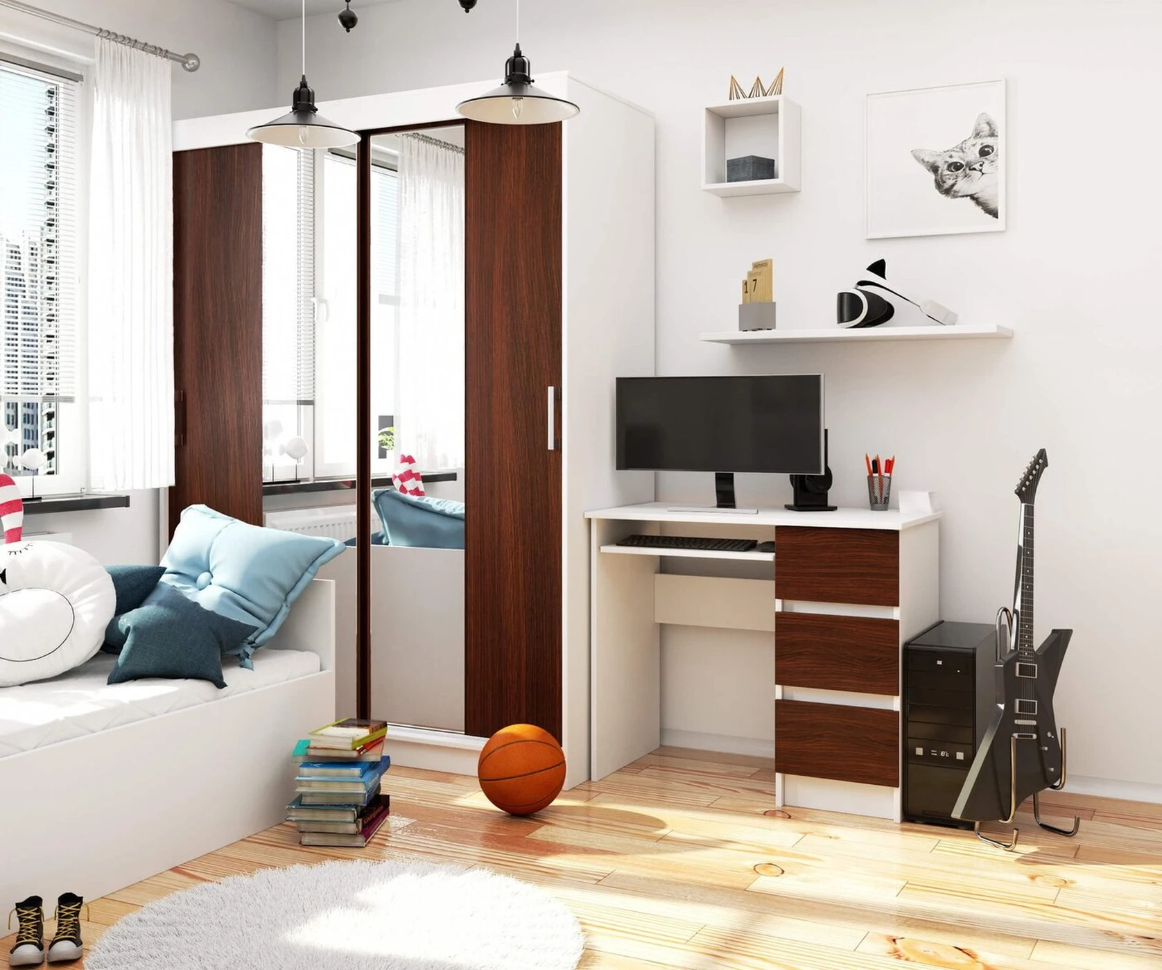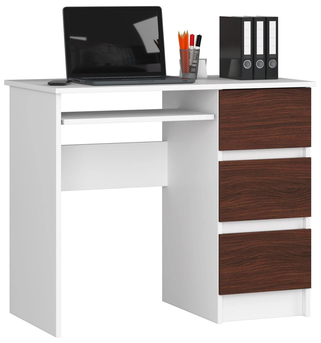 Aprašymas buvo automatiškai išverstas, gali pasitaikyti klaidų. Rašomasis stalas iš laminuotos plokštės – tai gaminys, pasižymintis dideliu atsparumu dilimui, kurio dėka jis puikiai tarnaus ilgą laiką. Dėl universalios išvaizdos jis puikiai atrodo bet kuriame kambaryje. Balduose yra stalviršis, ištraukiama lentyna ir trys erdvūs stalčiai, kuriuos galima išdėstyti pagal individualius poreikius. balduose dera balta ir, tamsiai rudas ; Gaminys pasižymi minimalistiniu dizainu; Puikiai tiks vaikų kambaryje, jaunimo kambaryje, namų darbo kambaryje ar biure; Stalčių fasadai pagaminti iš laminuotos plokštės; Stalčiai ir klaviatūros lentyna juda ant metalinių ritinėlių kreiptuvų; Matomi kraštai padengti ABS apvadu, kuris garantuoja didesnį atsparumą pažeidimams; Gaminys skirtas montuoti savarankiškai; Instrukcija yra komplekte; Baldas turi 24 - mėnesio garantija. Kompiuterio stalas A- 6 90 cm. Right – tai gaminys, kuriame dera funkcionalumas, aukšta kokybė ir nesenstantis dizainas. Produktas gali būti laisvai derinamas su kitais tos pačios kolekcijos įrangos elementais. Baltos/venge spalvos kompiuterių stalai puikiai atrodys tiek klasikiniame, tiek moderniame interjere. Lengva naudoti ir palaikyti švarą, jis neabejotinai pateisins klientų lūkesčius, kurie iš pasirinktų baldų tikisi praktinio naudojimo, paprastumo ir elegancijos.