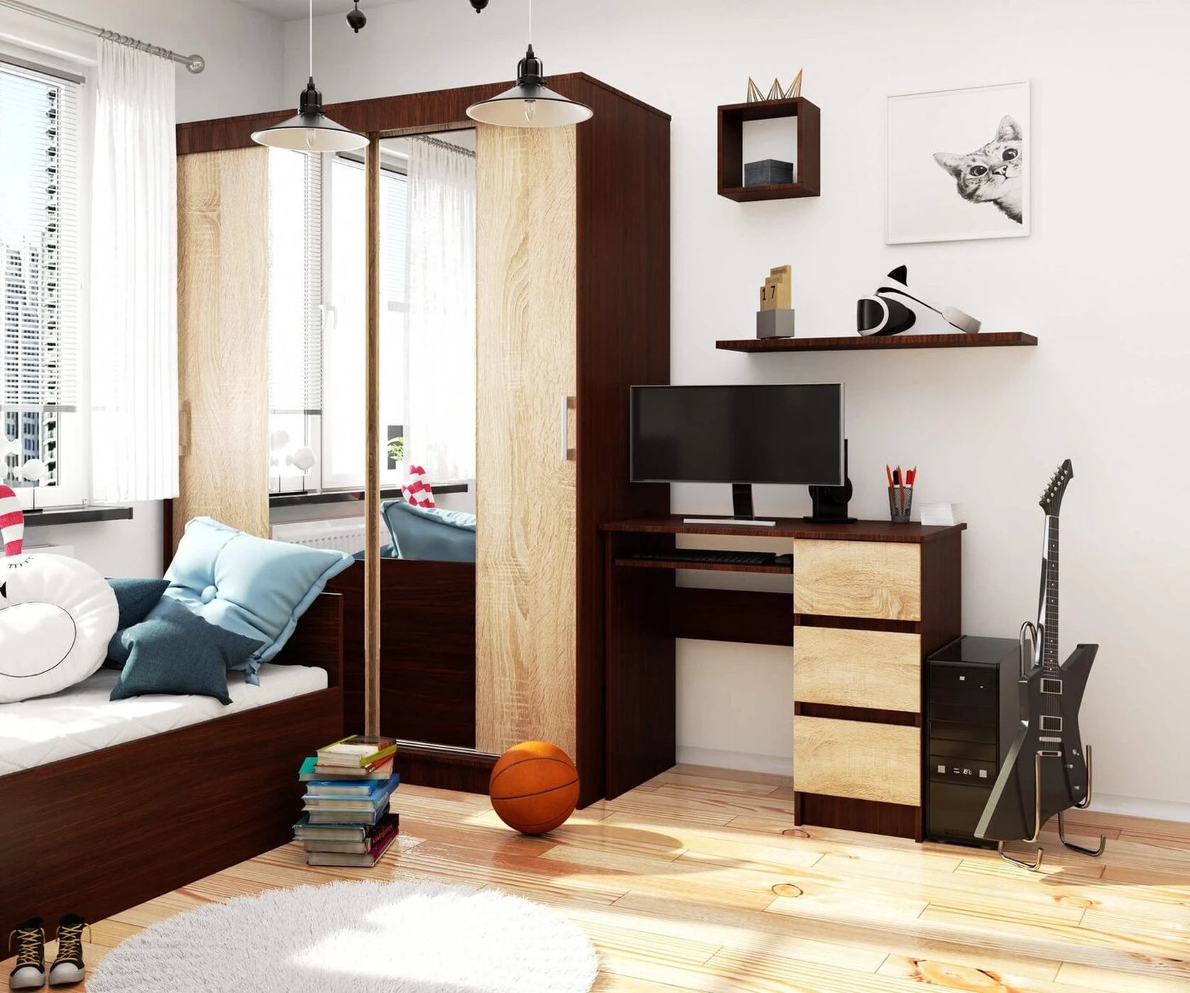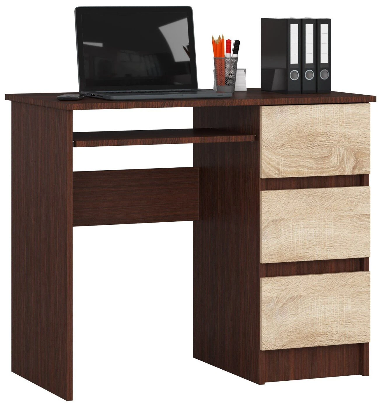 Aprašymas buvo automatiškai išverstas, gali pasitaikyti klaidų. Darbas prie kompiuterio ekrano yra daugelio žmonių standartas. Tai reiškia, kad reikia įsigyti tinkamą stalą. Pristatome modernų dešinįjį A-6 kompiuterio stalą, kurio ilgis 90 cm, aukštis 77 cm, gylis 50 cm. Dėl savo dydžio jis puikiai tiks mažuose kambariuose arba biuro patalpose su daugybe pozicijų. Jo korpusas yra, tamsiai rudas medienos spalvos, o fasadai yra sonomos ąžuolo spalvos. Dviejų spalvų naudojimas suteikia įdomų vizualinį efektą. Rašomasis stalas pagamintas iš 16 mm storio laminuotos plokštės, kuri pasižymi dideliu atsparumu dilimui. Matomi baldų kraštai taip pat tvirtinami ABS apvadu. Dėl to rašomasis stalas yra patvarus ir tvirtas. Turi tris stalčius ir klaviatūros lentyną. Jie juda dėl ritininių kreiptuvų, pagamintų iš metalo. Stalčiai yra erdvūs ir leidžia optimaliai valdyti erdvę. Rašomasis stalas skirtas surinkti savarankiškai. Tam padeda tikslios instrukcijos, pateiktos kartu su užsakymu. Baldams suteikiama 24 mėnesių garantija. Mūsų gaminys pasižymi aukšta kokybe ir funkcionalumu, palengvinančiu kompiuterio naudotojų darbą. Jo elegantiška išvaizda taip pat yra jos pranašumas. Paprastos formos rašomasis stalas stebina savo spalvomis, kurios išskiria jį iš kitų pasiūlymų. Pagamintas iš kokybiškų medžiagų, šis baldas tikrai tarnaus Jums ilgai. Visa tai už patrauklią kainą! Galimybė asmeninį stalą atsiimti parduotuvėje arba pristatymas per kurjerį. - Rašomasis stalas pagamintas iš trinties atspari laminuota lenta - Yra daug vietos bet kokiam išdėstymui - Stalčių fasadai pagaminti iš laminuotos plokštės - Stalčiai ir klaviatūros lentyna yra ant metalinių ritinėlių kreiptuvų - Uždengti matomi kraštai su ABS briauna garantuoja didesnį atsparumą pažeidimams - ""Pasidaryk pats"" stalas - Pridedamos instrukcijos - Garantija 24 mėn.