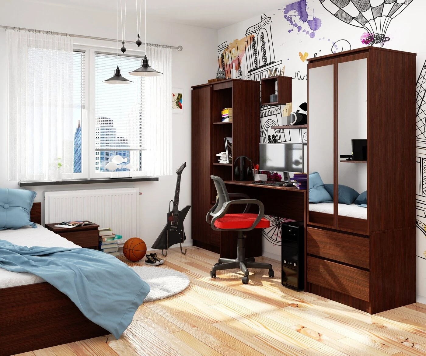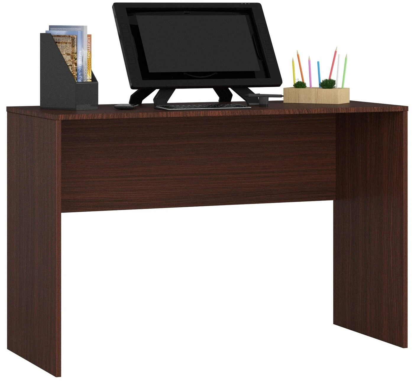 Aprašymas buvo automatiškai išverstas, gali pasitaikyti klaidų. Standartinius jaunimo kambario baldus galima papildyti klasikiniu B-17, tamsiai rudas rašomuoju stalu. Laisvai pastatomi 120 cm aukščio baldai buvo pagaminti iš laminuotos plokštės, pasižyminčios dideliu atsparumu dilimui. Rašomasis stalas turi papildomas ABS apsaugas, apsaugančias briaunas nuo mechaninių pažeidimų. Dėl mažo svorio, standartinių dydžių ir tinkamos baldo priekinės ir galinės pusės apdailos jį galima pastatyti bet kurioje kambario vietoje. Baldą galima įsigyti surenkamoje formoje, tačiau vadovaudamiesi pridedamomis instrukcijomis galėsite nesunkiai surinkti gaminį. – Rašomasis stalas iš dilimui atsparios laminuotos plokštės - Stalčių ir durelių fasadai pagaminti iš laminuotos plokštės - Matomi kraštai padengti ABS briauna, padidinta atsparumu pažeidimams - Savarankiško surinkimo stalas - Pateikiamas vadovas - Gamintojo garantija 24 mėn. Laisvai pastatomas stalas! Rašomojo stalo nugarėlė padengta laminuota plokšte, todėl baldus galima pastatyti bet kur, nepridedant jų prie sienos.