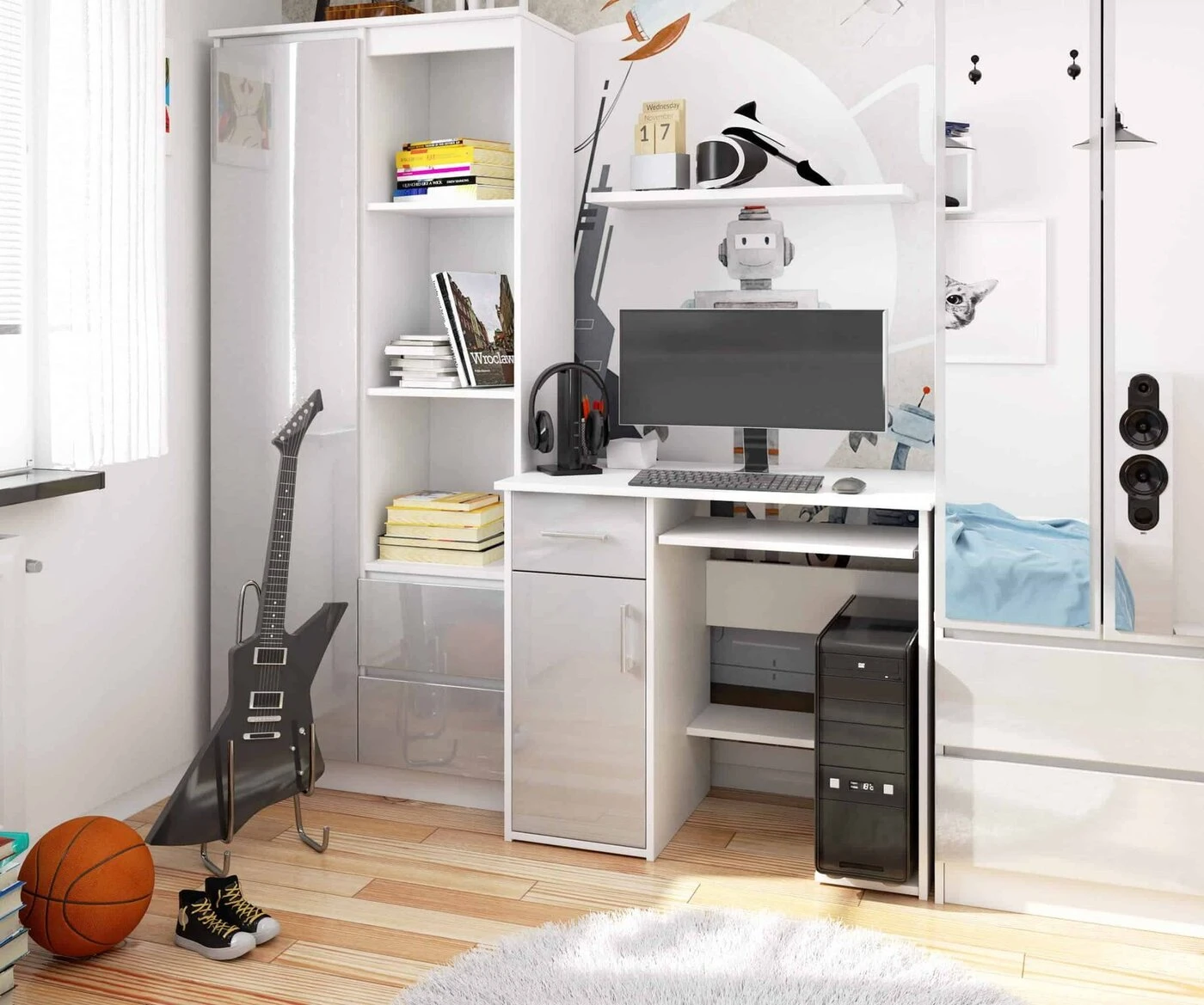 Aprašymas buvo automatiškai išverstas, gali pasitaikyti klaidų. Elegantiškas JAY kompiuterio stalas puikiai tiks žmonėms, kurie renkasi minimalistinius aksesuarus ir tvarko interjerą., baltas rašomasis stalas su metaliniais spintelių fasadais ir sidabrinėmis stalčių bei durų rankenomis bus puiki vieta mokytis ir dirbti. Pritaikytas nešiojamam kompiuteriui ar kompiuteriui įdėti į jį. Rakinamos spintelės ir vieta ant stalviršio leis šią erdvę išnaudoti pasirinktu būdu. Stalčiai ir klaviatūros lentyna juda ant metalinių ritinėlių kreiptuvų, o tai suteikia papildomo patogumo ir patogumo naudoti. Kodėl verta pirkti JAY kompiuterio stalą? tiek rašomasis stalas, tiek stalčius, tiek durelių fasadai pagaminti iš trinčiai atsparios laminuotos plokštės, kraštai padengti ABS apvadu, kuris garantuoja didesnį atsparumą pažeidimams, lengvesnis montavimas dėl aiškių ir paprastų instrukcijų, pritvirtintų prie stalo, kompiuterio stalas turi daug laisvos vietos tiek ant stalviršio, tiek uždarose spintelėse, li> dėl įvairių JAY modelio spalvų prieinamumo kiekvienas ras kažką sau ir pritaikys stalą pagal savo lūkesčius 90 cm ilgio rašomasis stalas puikiai tiks net mažuose kambariuose. Puikiai tinka studentui jaunimo kambaryje, biure ar gyvenamajame kambaryje ir nuotoliniam darbui. Tai patogus ir stabilus. kurios studijas ir darbą pavers grynu malonumu. Puikiai suderinti matmenys yra didžiulis privalumas, kai daug valandų praleidžiama vienoje pozicijoje prieš monitorių. Rašomasis stalas pagamintas iš aukščiausios kokybės medžiagų, todėl tarnaus ilgus metus.
