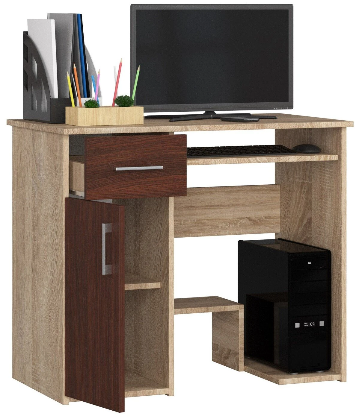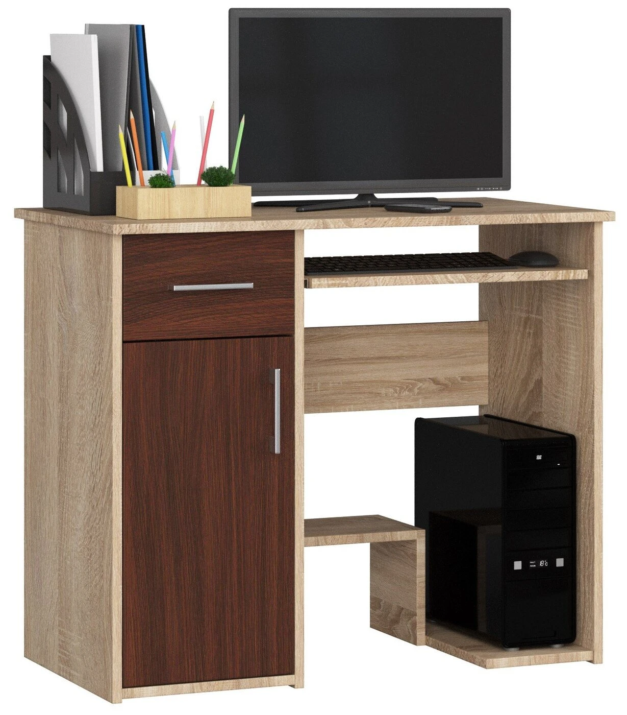 Aprašymas buvo automatiškai išverstas, gali pasitaikyti klaidų. JAY kompiuterio stalas pagamintas iš trinčiai atsparios, laminuotos dviejų medienos spalvų baldinės plokštės. Rašomojo stalo korpusas ir jo viršus padengtas, ąžuolo spalvos ąžuolo laminatu, o stalčiaus priekis ir spintelės durelės yra, tamsiai rudas spalvos. Visas daiktas turi matinį paviršių. Dešinėje baldo pusėje yra stumdomas stalčius ant metalinių ritininių kreiptuvų ir spintelė su atverčiamomis durelėmis, slepianti dvi lentynas. Kairioji stalo pusė skirta darbui. Po stalviršiu, atitinkamame aukštyje, yra ištraukiama lentynėlė klaviatūrai, o apačioje - papildoma lentynėlė priedams. Dar žemiau, prie dešinės baldo kojelės yra kompiuterinė lentyna. Tarp JAY kompiuterio stalo privalumų neabejotinai reikėtų paminėti: patogūs baldo matmenys - 74 cm aukštis, 90 cm plotis ir 50 cm gylis; ištraukiamas klaviatūros stalčius, leidžiantis sutaupyti vietos ant stalviršio; kompiuterio lentyna; papildoma, žema lentyna priedams; paįvairinti sandėliavimo erdvę (stalčius, spinta, atviros lentynos); dviejų spalvų apdaila, suteikianti didesnes išdėstymo galimybes; išlaikyti malonią medienos spalvą; krašto apsauga su ABS plastiku; 24 mėn. gamintojo garantija. JAY, tamsiai rudos/ąžuolo spalvos kompiuterio stalas yra nesenstantis, universalus baldas vaikų ir paauglių kambariams. Dėl savo kompaktiškų matmenų ir kartu didelės sandėliavimo vietos jis puikiai tiks, jei miegamajame ar svetainėje reikės įrengti papildomą kompiuterių stotelę. JAY yra baldas, kuris taip pat atliks savo vaidmenį biuruose.