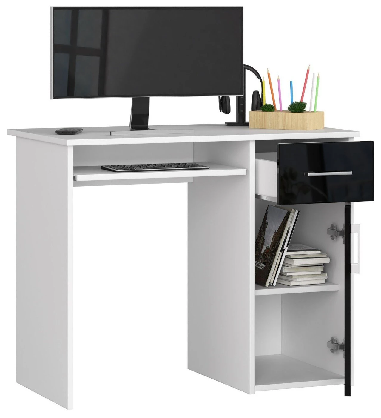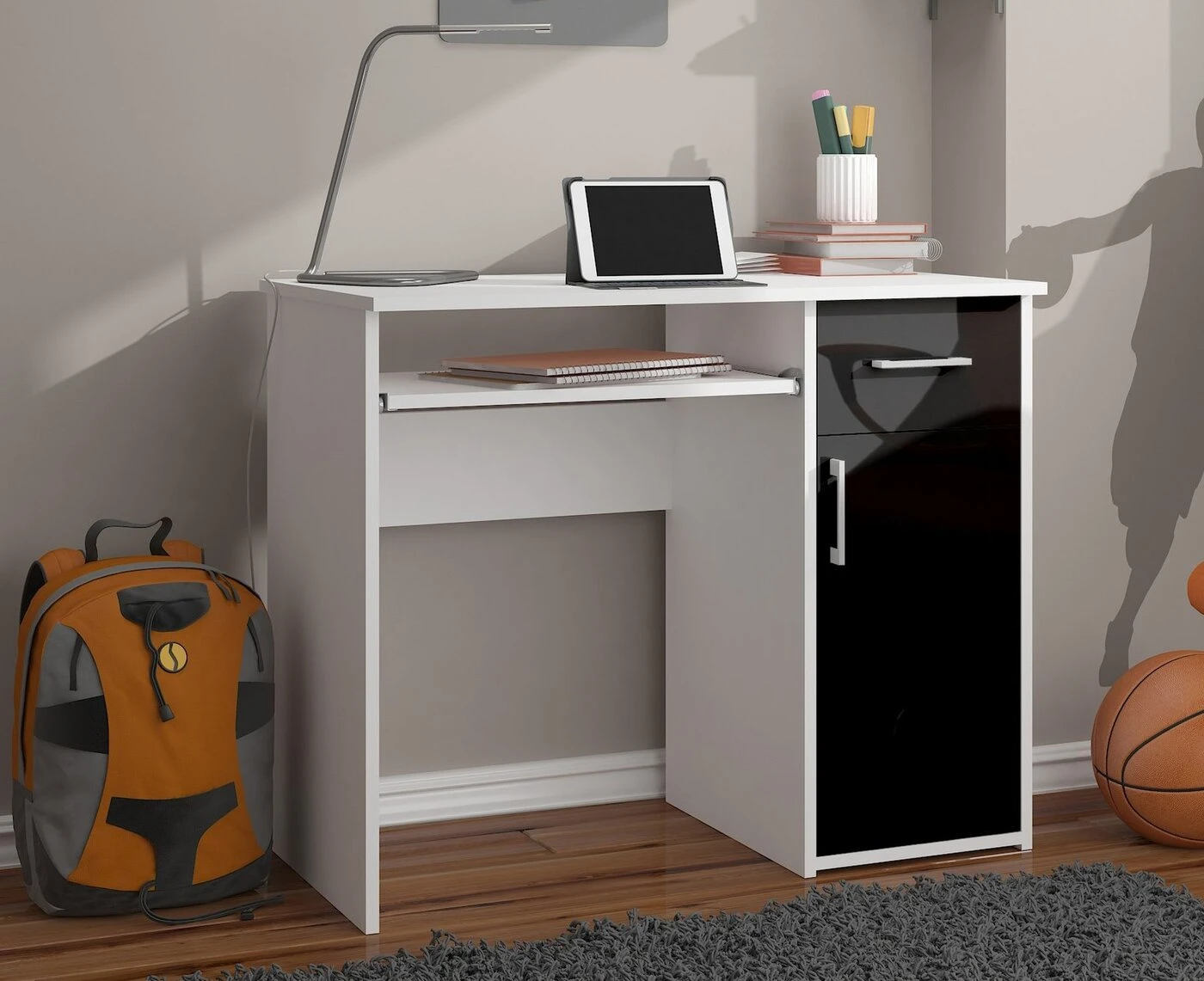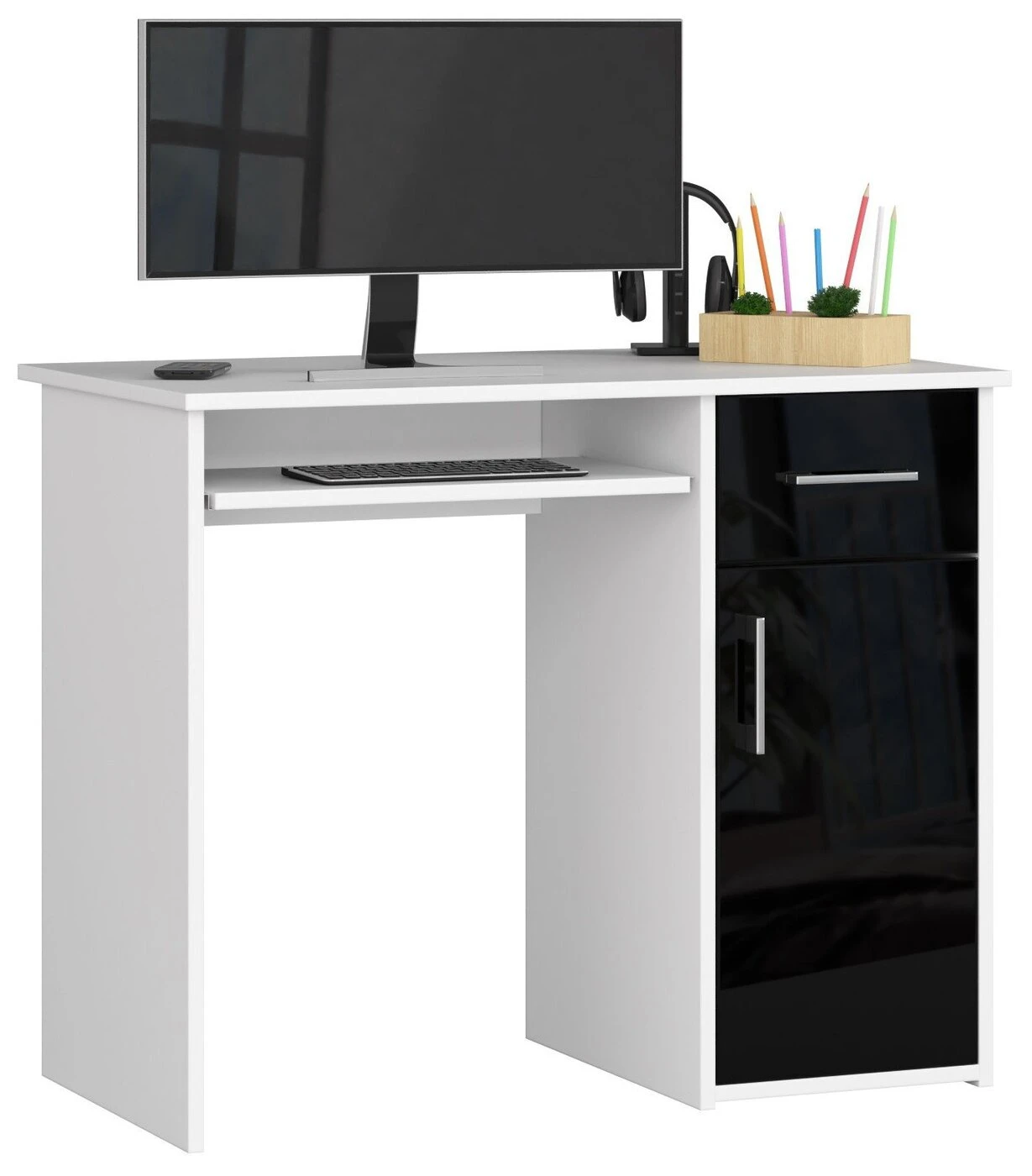 Aprašymas buvo automatiškai išverstas, gali pasitaikyti klaidų. PIN kodo kompiuterio stalas yra puikus pasiūlymas kambaryje, biure ar biure. Šis baldas užtikrina maksimalų darbo ir mokymosi komfortą. Jo korpusas, baltas, o stalčių ir durelių fasadai yra blizgiai juodi. Jų rankenos yra sidabrinės spalvos. Tai elegantiškas, bet kartu ir dizainerių sukurtas sprendimas, puikiai tiks prie įvairių interjero derinių. Rašomasis stalas pagamintas iš trinčiai atsparios 16 mm laminuotos plokštės. Matomos briaunos padengtos ABS briauna, padidinta atsparumu pažeidimams. Šis baldas suteikia daug vietos bet kokiam išdėstymui. Jame yra stalčius, spintelė (ir viena lentyna viduje) ir išstumiama klaviatūros lentyna. Stalčius ir lentyna juda dėl metalinių ritinėlių kreiptuvų – šis mechanizmas užtikrina maksimalų komfortą naudojant baldus. Rašomasis stalas laisvai pastatomas, jis skirtas savarankiškai surinkti, o tai padeda su užsakymu pateiktos instrukcijos. Jam taip pat suteikiama 24 mėnesių garantija. Baldus galima įsigyti už labai patrauklią kainą. Jis pasižymi ilgaamžiškumu ir atsparumu, todėl tai yra daugelio metų investicija. Be to, vizualiai atrodo įdomiai ir padeda tinkamai organizuoti darbą. Jo matmenys yra 90 cm ilgio, 74 cm aukščio ir 50 cm gylio. - Pagamintas rašomasis stalas iš dilimui atsparios laminuotos plokštės - Yra daug vietos bet kokiam išdėstymui - Durelių viduje yra viena lentyna - Stalčių ir durų fasadai pagaminti iš akrilo MDF High Gloss - Stalčiai ir klaviatūros lentyna juda ant metalinių ritinėlių kreiptuvų - Matomi kraštai padengti ABS briauna, kad būtų didesnis atsparumas pažeidimams - Sidabrinės rankenos stalčiams ir durims - Rašomasis stalas savarankiškam surinkimui - Laisvai pastatomas rašomasis stalas (laminuota lenta stalo gale) - Pateikiamas vadovas - Garantija 24 mėn. Laisvai stovintį stalą galima pastatyti biure, viešbučio ar paslaugų patalpose. ABS briauna apsaugo stalo kraštus nuo pažeidimų. Nuostabus kainos ir kokybės santykis.