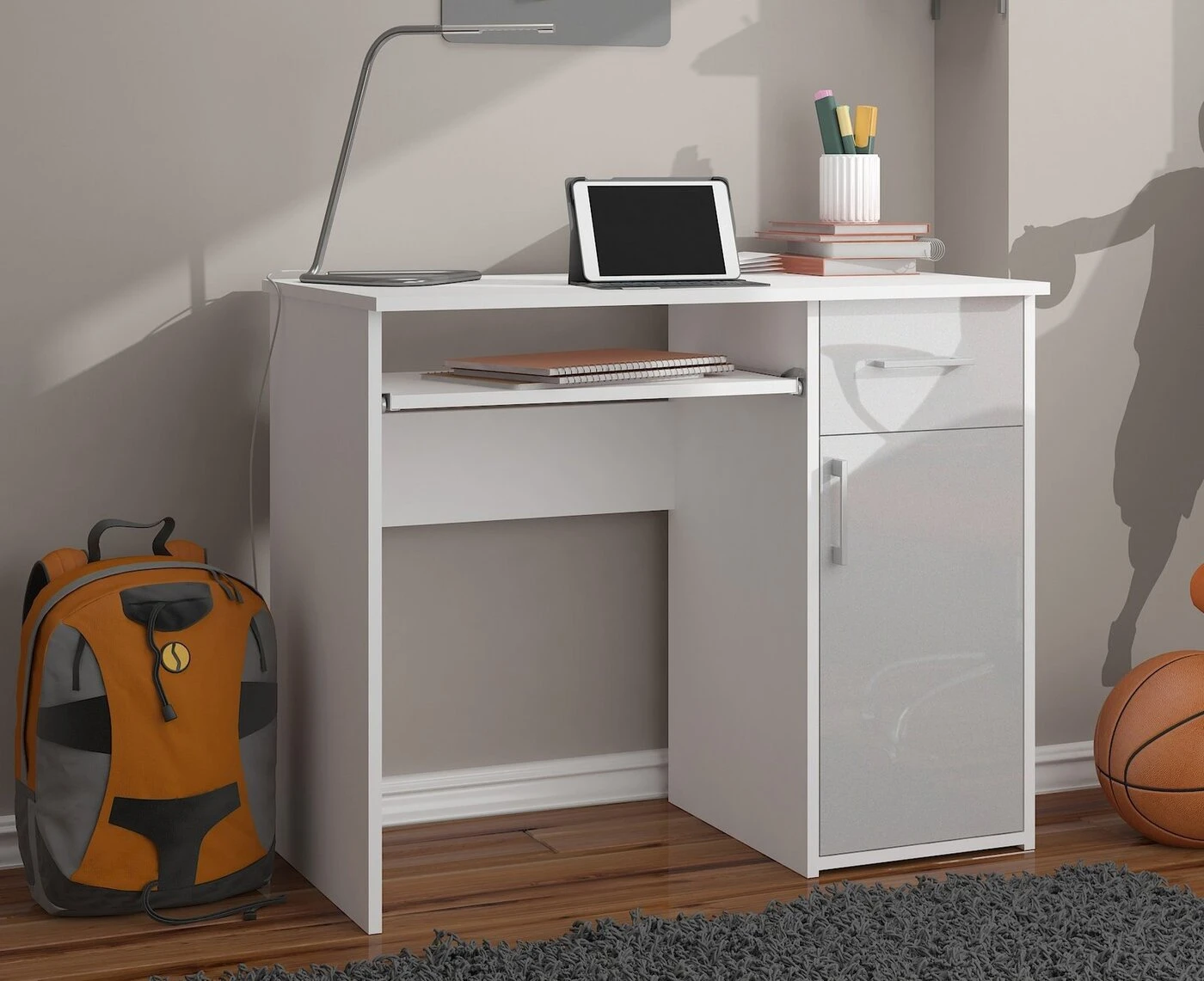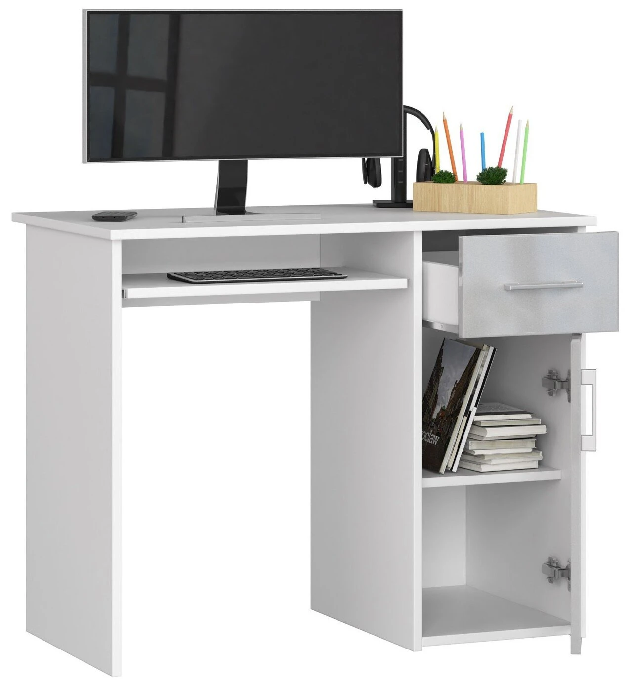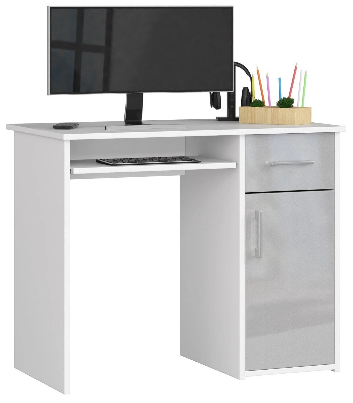 Aprašymas buvo automatiškai išverstas, gali pasitaikyti klaidų. Patogus ir praktiškas kompiuterio stalas bus sėkmingai naudojamas viešbučiuose, valstybinėse įstaigose ir privačiuose namuose. 16 mm storio laminuotos plokštės pagrindu paruoštas baldas puikiai dera prie ryškių interjero spalvų. Dėl to, kad gaminyje yra užpakalinė plokštė, galima baldus pastatyti nepritaikant prie kambario sienos. Dėl MDF Acrylic technologijos panaudojimo stalčių fasadams ir durims paruošti, baldai puikiai blizga. Stalčiuose ir klaviatūros tvirtinimo lentynoje yra sumontuotos ritininės kreipiamosios sistemos, palengvinančios jų judėjimą. Baldo kraštai sutvirtinti ABS ratlankiu, kuris garantuoja didesnį atsparumą mechaniniams pažeidimams. Sidabrinės spalvos rankenos durims ir stalčiams suteikia baldams atitinkamos elegancijos. Gamintojas baldą tiekia dalimis, kad būtų galima surinkti savarankiškai. Be to, pridedamas aiškus vadovas ir 24 mėnesių gamintojo garantija. – Pagamintas stalas iš laminuotos plokštės atsparios dilimui atsparios - Turi daug vietos bet kokiam išdėstymui - Durų viduje yra viena lentyna - Stalčių ir durų fasadai pagaminti iš AKRYL MDF High Gloss MDF plokštės - Stalčiai ir klaviatūros lentyna juda ant metalinių ritinėlių kreiptuvų - Matomi kraštai padengti ABS briauna, kad būtų didesnis atsparumas pažeidimams - Sidabrinės stalčiaus ir durų rankenos - Rašomasis stalas, skirtas savarankiškai surinkti - Laisvai pastatomas rašomasis stalas (laminuota lenta stalo gale) - Pateikiamas vadovas - Garantija 24 mėn. Laisvai stovintis stalas suteikia galimybę veikti jis laikomas biuro, viešbučio ar paslaugų patalpose. ABS briauna apsaugo stalo kraštus nuo pažeidimų. Nuostabus kainos ir kokybės santykis.