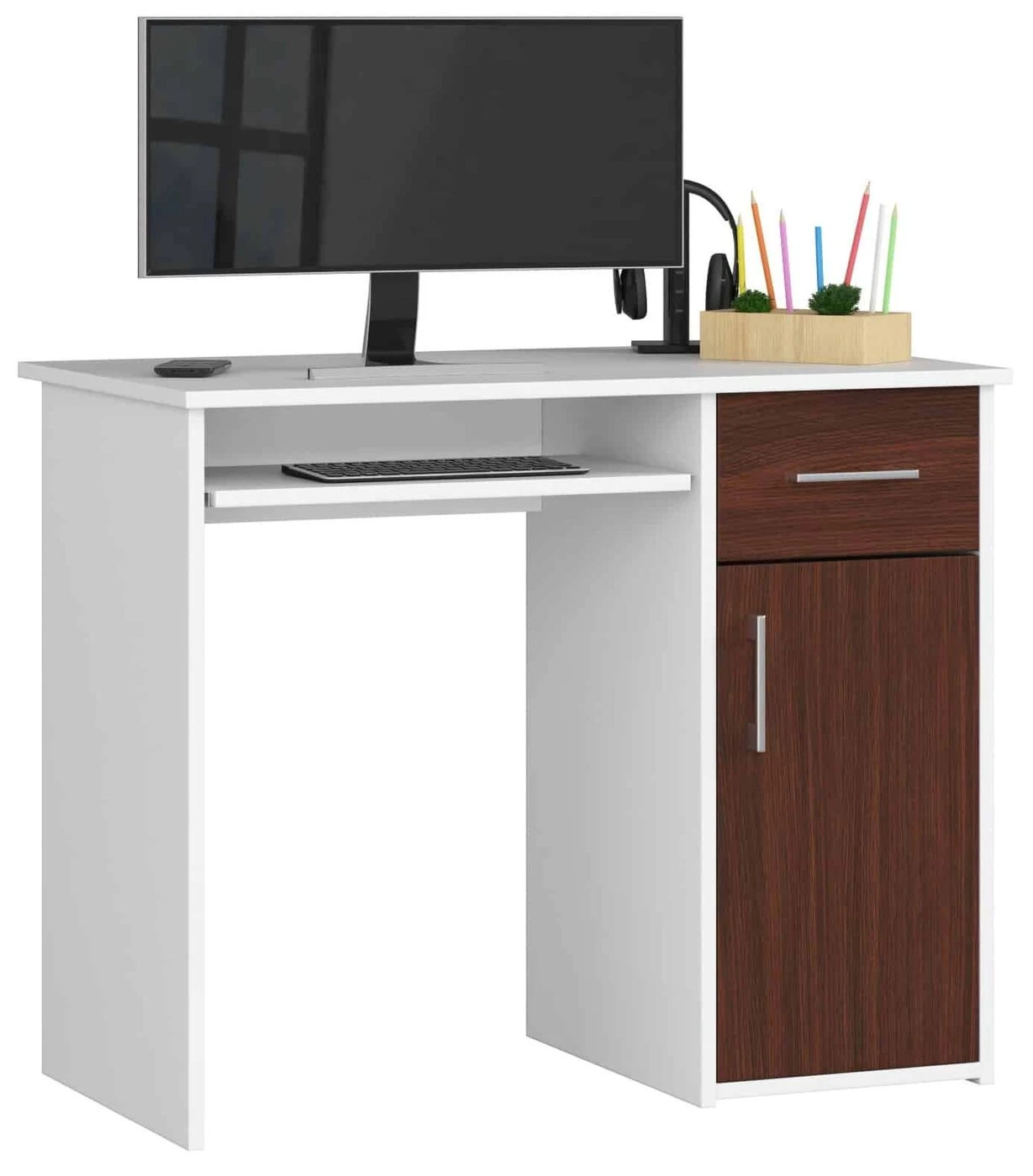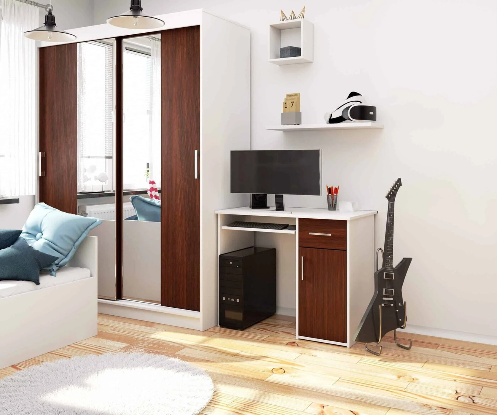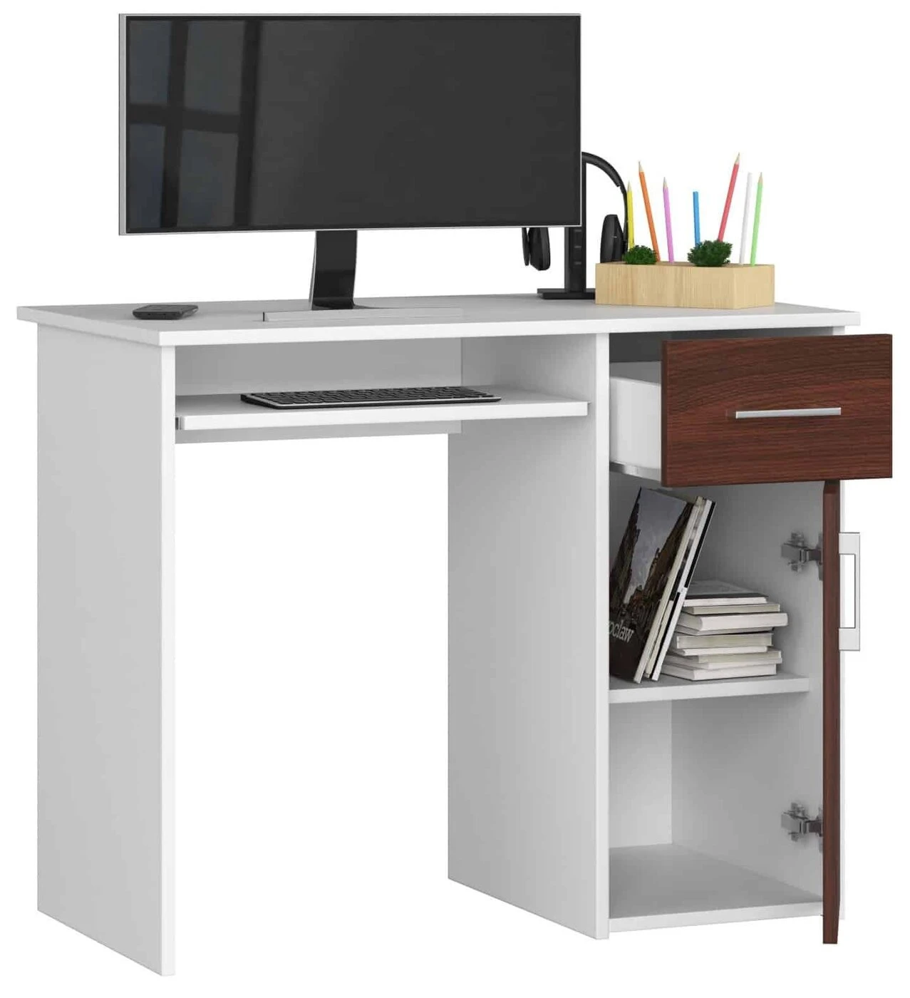 Aprašymas buvo automatiškai išverstas, gali pasitaikyti klaidų. Praktiškas ir elegantiškas laisvai pastatomas PIN kodo stalas puikiai tiks vaiko kambaryje, kaip kompiuterio stalas. Taip pat tai bus idealus sprendimas nedidelėms biuro patalpoms, kur reikia įsirengti daug etatų. 90 cm pločio stalviršis leidžia ant jo laisvai pastatyti monitorių, o klaviatūrą patogiai galima padėti ant žemiau esančios slankiojančios lentynėlės. Erdvi spintelė su lentyna ir stalčiumi suteikia daug erdvės Jūsų pačių tobulėjimui. Stalo konstrukcija pagaminta iš baltos laminuotos plokštės, atsparios trinčiai, o fasadai iš MDF plokštės, tamsiai rudas spalvos. Klasikinė, elegantiška išvaizda – puikiai tinka daugeliui interjerų. Madingi spalvų deriniai. Praktiškas dizainas – stumdoma klaviatūros lentyna, gilus stalčius ir spintelė su lentyna. Stalo nugarėlė šonuose pagaminta iš tos pačios lentos, todėl gali stovėti bet kokia tvarka. Stalviršis pagamintas iš trinčiai atsparios laminuotos plokštės. Matoma kraštai tvirtinami ABS faneruote. Klaviatūros ir stalčiaus lentyna juda ant metalinių slankiklių ir ratukų. Garantija 24 mėn. Surinkimo instrukcijos pateiktos paketas. Pagaminta Lenkijoje. Atskirai stovinčių stalų PIN kodas klientui pristatomas elementais, atskiram pirmadieniui taż - pakuotėje yra surinkimo instrukcija ir reikalingi įrankiai. Rekomenduojame stalą valyti minkšta kempine arba skudurėliu, naudojant baldams prižiūrėti skirtas ploviklius. Taip pat atkreipkite dėmesį, kad stalas visada turi būti pastatytas ant sauso paviršiaus.