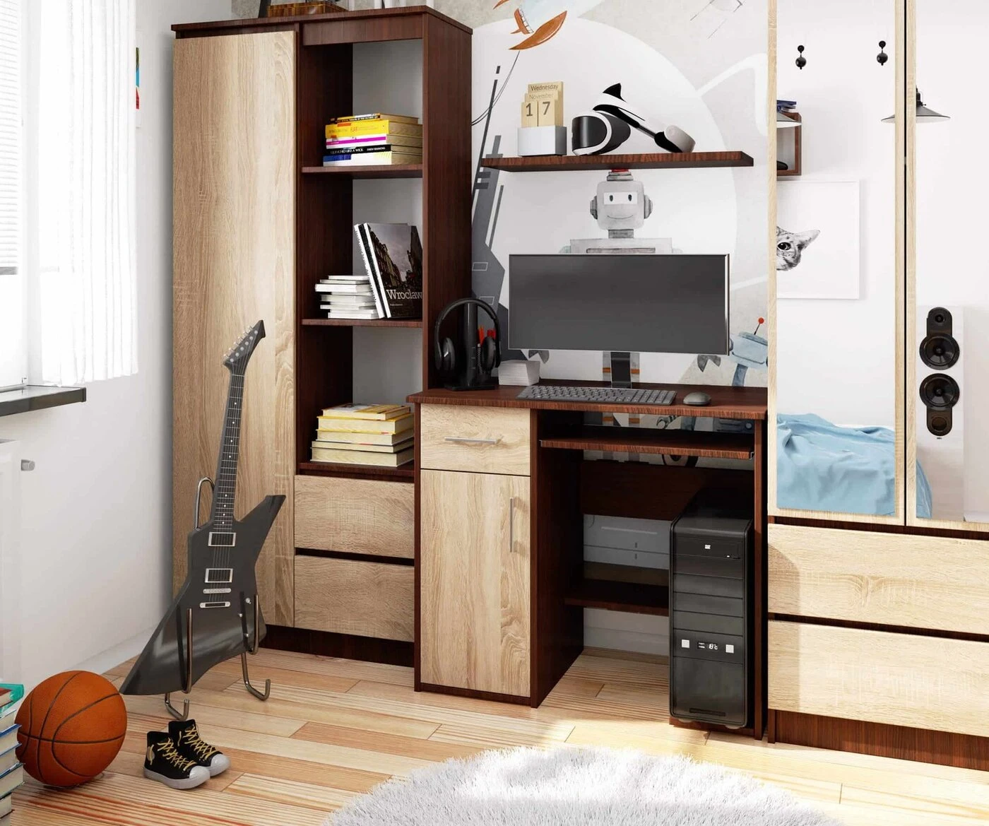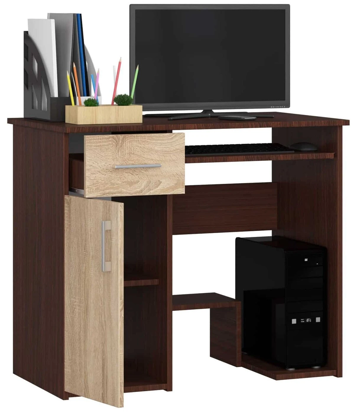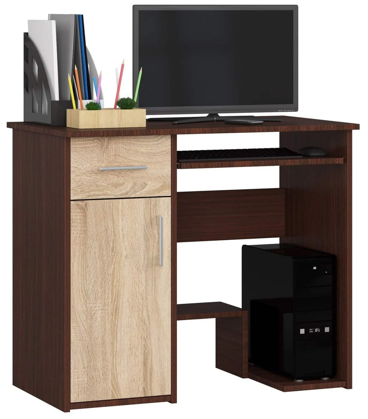 Aprašymas buvo automatiškai išverstas, gali pasitaikyti klaidų. Vis daugiau žmonių mokosi arba dirba nuotoliniu būdu. Nenuostabu, kad pastaruoju metu kompiuterių stalų paklausa išaugo. Tačiau kokį baldų modelį rinktis? Jis turėtų būti funkcionalus ir tuo pat metu elegantiškas. Svarbu ir jo kaina. Mūsų parduotuvė rekomenduoja JAY 80 cm kompiuterio stalą, tamsiai rudas ir, ąžuolo spalvos spalvų. Baldai tinka svetainei ir jaunimo kambariui, svetainei ar biurui. JAY 80 cm rašomasis stalas yra labai patrauklus pasiūlymas. Kokie jo privalumai? ilgaamžiškumas – baldai pagaminti iš laminuotos plokštės, atsparios dilimui ir įbrėžimams, talpa - rašomasis stalas turi daug vietos bet kokiam išdėstymui, t.y. stalčius, 2 lentynos (vienos durys), vieta centriniam blokui ir stumdoma klaviatūros lentyna, naudojimo patogumas - stalčiai ir klaviatūros lentyna judėti ant metalinių ritinėlių kreiptuvų, atsparumas - matomos briaunos padengtos ABS briauna padidintu atsparumu pažeidimams, elegancija - stalas paprastos formos, korpusas, tamsiai rudas spalvos spalvos, o fasadai sonomos spalvos, kuri suteikia įdomų vizualinį efektą, o stalčių ir durų rankenos sidabrinės, funkcionalumas - baldas padeda sukurti patogią darbo ir mokymosi erdvę, priimtina kaina, 24 mėnesių garantija. Rašomasis stalas Zaven Jay leidžia lengviau organizuoti darbą ir mokytis priešais kompiuterio ekraną. Tai patvarus baldas, kuris Jums tarnaus ilgus metus. Jis skirtas savarankiškam surinkimui, kurį palengvina komplekte esančios instrukcijos.