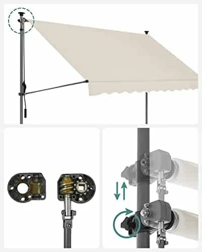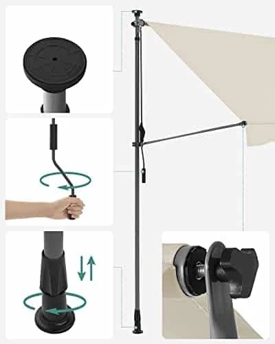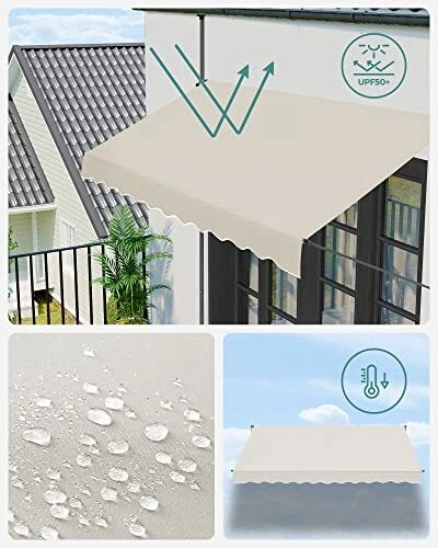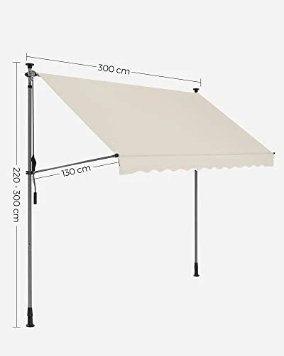 Aprašymas buvo automatiškai išverstas, gali pasitaikyti klaidų.Mėgaukitės vasara be sudėtingo surinkimo: ar norėtumėte markizės be skylių? Tada ši SONGMICS balkono tenta kaip tik jums. Jokio gręžimo ar varžtų – tereikia surinkti rėmą ir sureguliuoti stulpų bei markizės aukštį, kad stulpai tvirtai įsitvirtintų tarp grindų ir lubų. Reguliuojamas ir apsaugotas: Aukštos kokybės markizės audinys ne tik apsaugo jus nuo UV spindulių, bet ir prieš lietų. Naudodami švaistiklį galite reguliuoti markizės kampą ir plotį, nesvarbu, ar ji yra balkone, terasoje ar lauke, tai suteiks jums visišką apsaugą.Produkto informacija: Spalva: smėlio spalvos Medžiaga: milteliniu būdu dengti plieniniai strypai, aliuminis (ritininis vamzdis: Ø 38 mm), 280 g/m² poliesteris, PU danga Dydis: 300 x 130 cm (P x P) Aukštis: 2,2-3 m Svoris : 10,5 kg Pristatymo komplektas : 1 x spaustukas markizė 1 x instrukcijos SONGMICS Pastabos: Surinkti turėtų 2 žmonės. Surinkę patikrinkite, ar stovo stulpai yra tvirti. Nenaudokite gaminio esant stipriam vėjui, lietui ar sningant. Pasikeitus orams, nedelsdami atitraukite markizę, nes kitaip gali būti padaryta žala. Visiškai ištraukus markizės audinį, toliau nesukite švaistiklio. Norėdami išvalyti markizės audinį, jį reikia sudrėkinti minkštu skudurėliu vandens arba švelnaus ploviklio šluoste, kurią reikia nuvalyti.