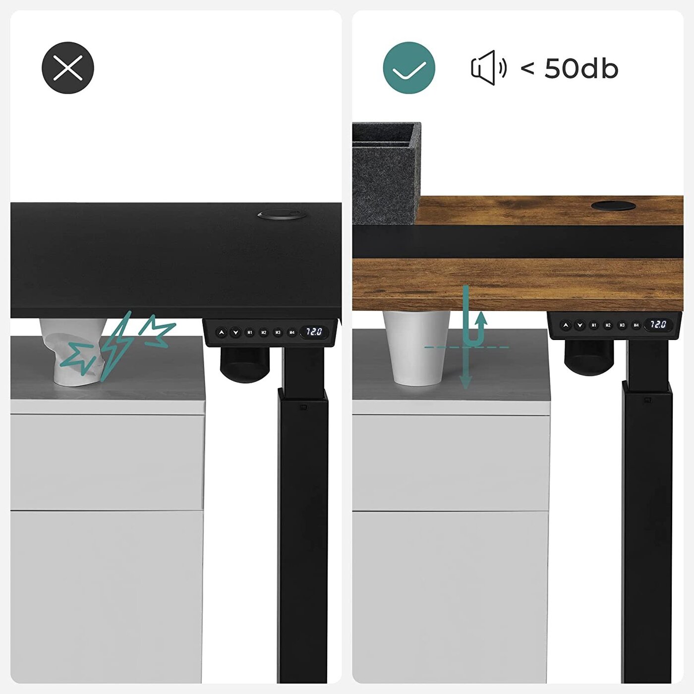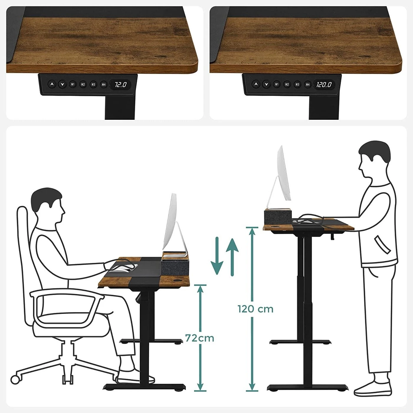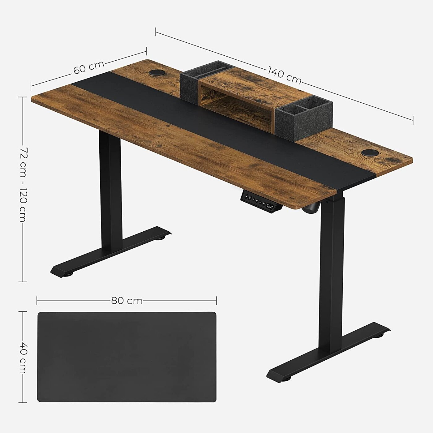 Aprašymas buvo automatiškai išverstas, gali pasitaikyti klaidų.Elektrinio stalo privalumai: sulankstoma konstrukcija, kad būtų lengva surinkti. Reguliuojamas aukštis keičiant pozas. 4 skirtingų aukščių saugykla greitam reguliavimuiLangus, tylus aukščio reguliavimas Monitoriaus stovai ir daiktadėžės ant paviršiaus, kad būtų galima geriau organizuotiProdukto informacija:Spalva: vintažinė ruda-juodaMedžiaga: medžio drožlių plokštė, plienas Dydis: 140 x 60 x (72-120 ) cmStalviršio storis: 1,5 cmSvoris: 28,2 kgMaks. Keliamoji galia: 80 kgPakuotės turinys: 1 x elektrinis stalinis stovas 1 x monitoriaus stovas 2 x laikymo dėžutė 1 x priedų paketas 1 x instrukcija SONGMICS Pastabos: Kėlimo ir nuleidimo metu įsitikinkite, kad stalui nėra kliūčių. Nestatykite stalo tiesiai prie sienos Šis gaminys skirtas naudoti tik patalpose. Visus elektrinius komponentus laikykite toliau nuo skysčių. Vienu metu gaminį naudokite tik ne ilgiau kaip 2 minutes. Pasibaigus šiam laikotarpiui, stalo rėmas neturėtų būti judinamas 18 minučių, kad nepažeistumėte variklio. Išardykite šį gaminį