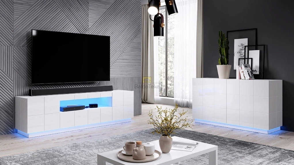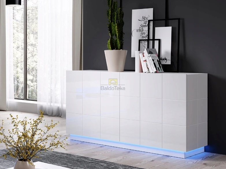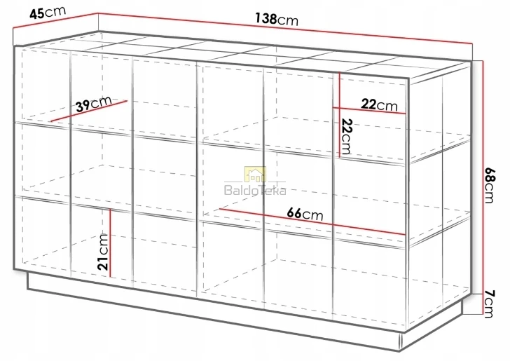Komplektacijoje pridedamas cokolis (7 cm) ir juodos spalvos kojelės (12 cm).
