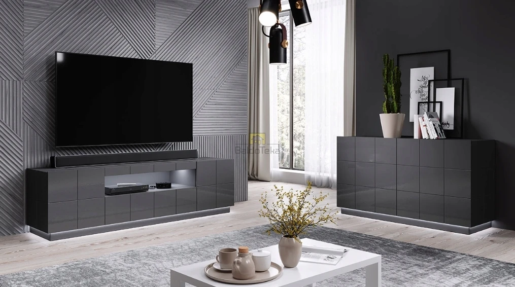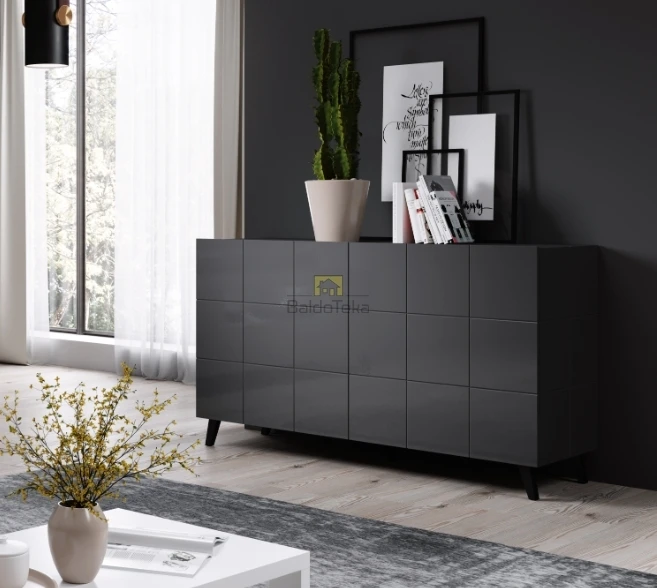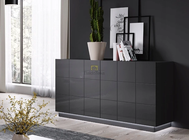 Komplektacijoje pridedamas cokolis (7 cm) ir juodos spalvos kojelės (12 cm).