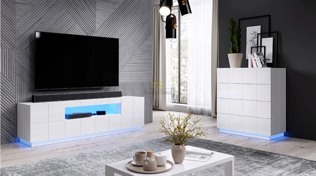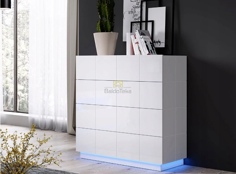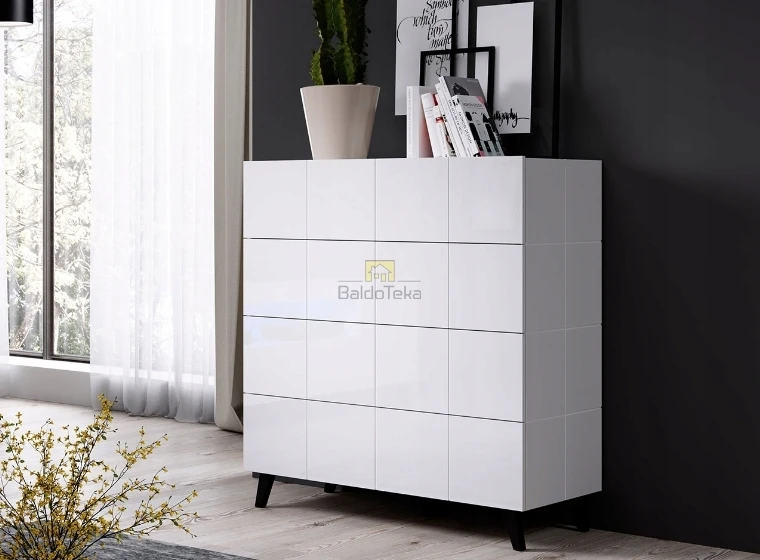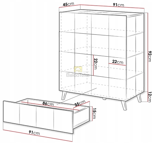 Komplektacijoje pridedamas cokolis (7 cm) ir juodos spalvos kojelės (12 cm).