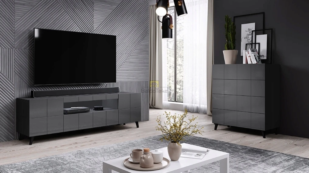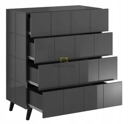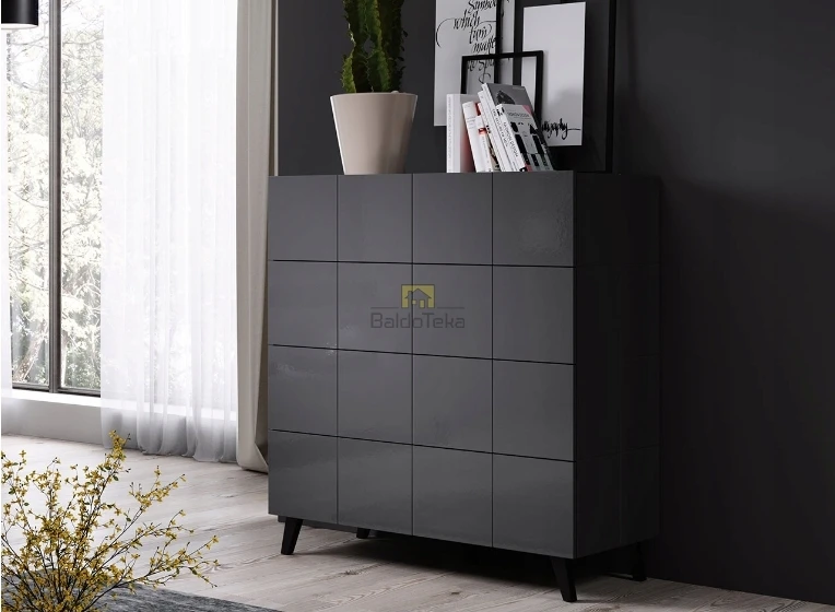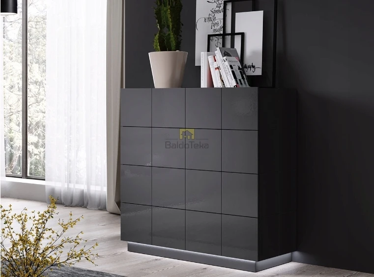 Komplektacijoje pridedamas cokolis (7 cm) ir juodos spalvos kojelės (12 cm).