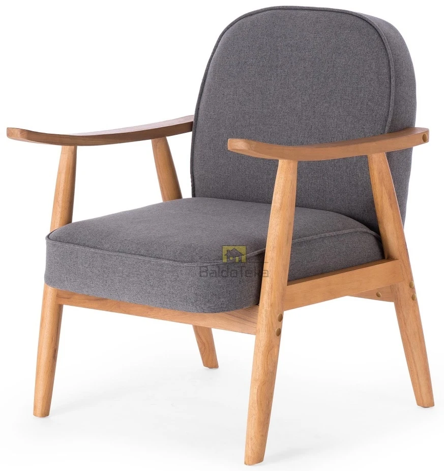 Elegantiškas pilkas gobeleno fotelis su natūraliu medžiu
