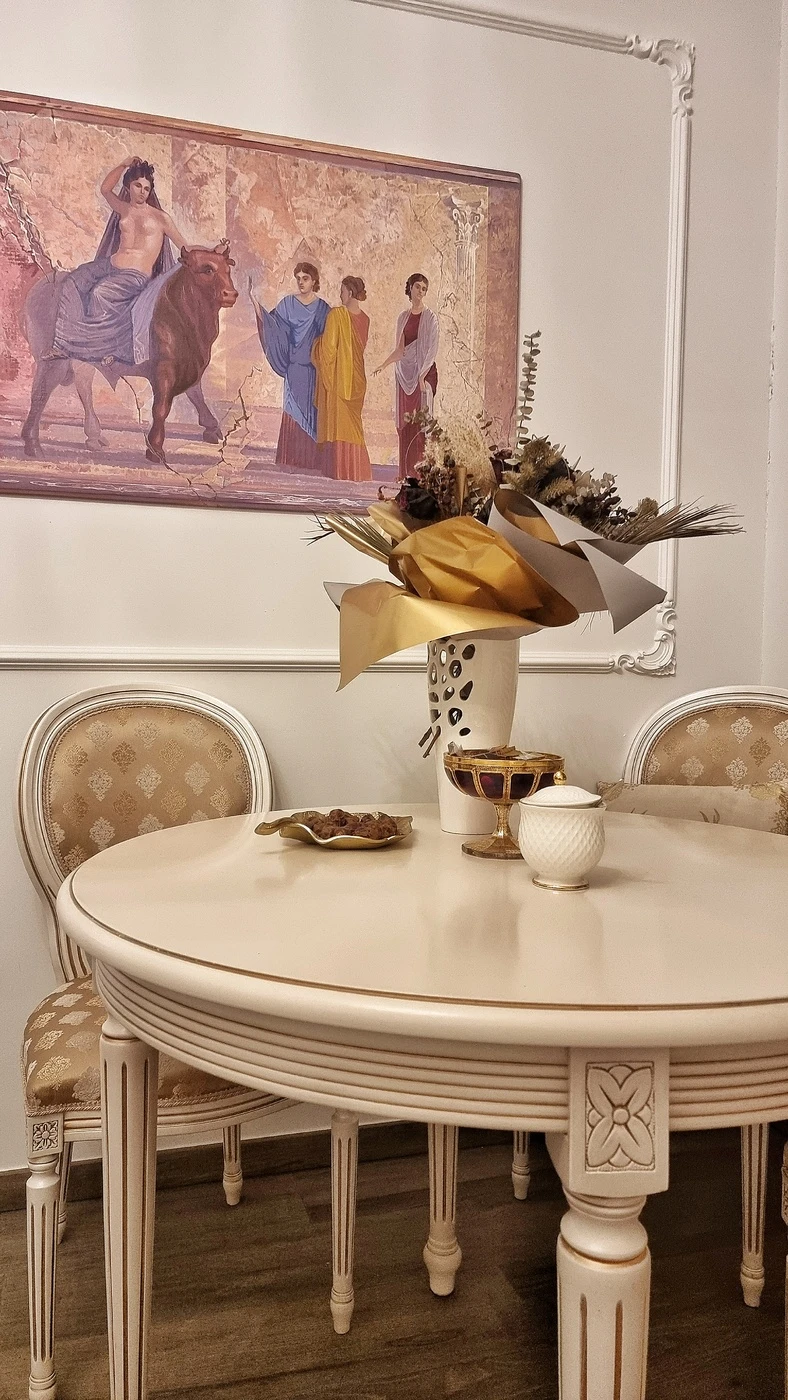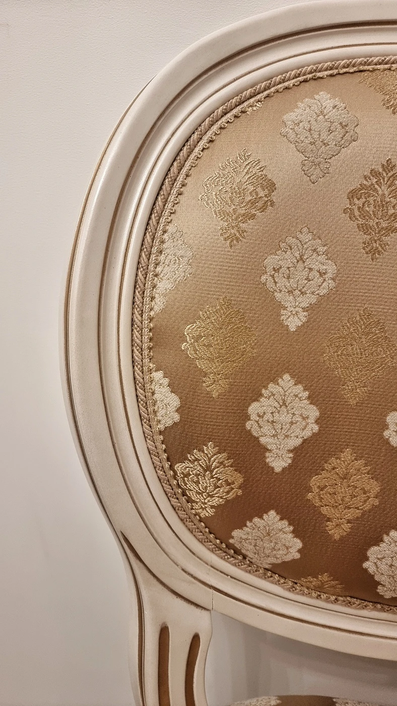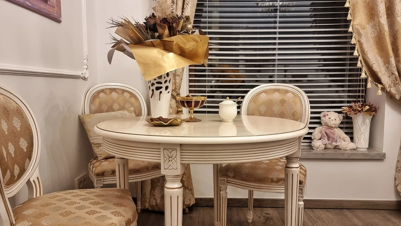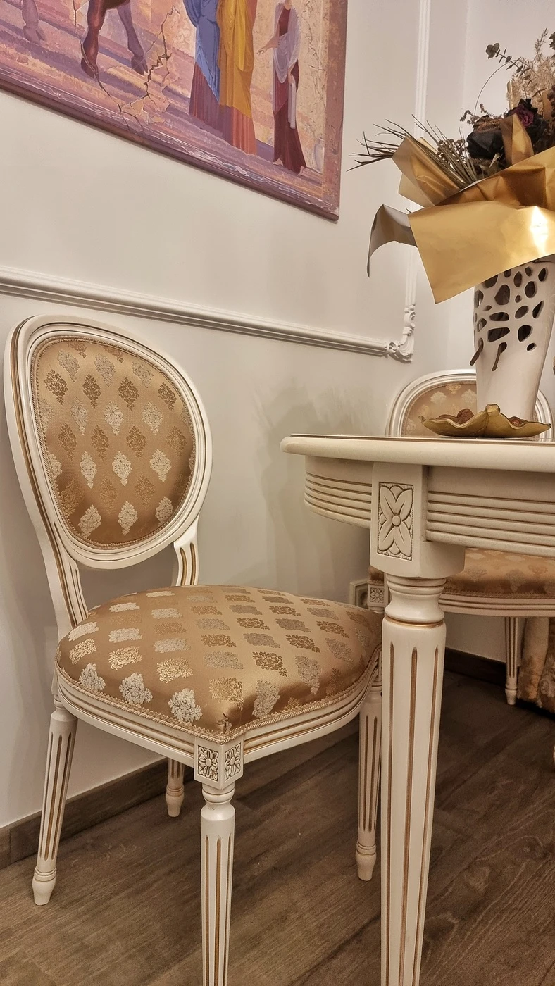 Parduodu puikų rokoko stiliaus baldų komplektą - kavos staliuką ir 3 kėdes. Didžiąją laiko dalį baldai buvo naudojami kaip ofiso dekoras, todėl stiprių nusidėvėjimo žymių neturi.