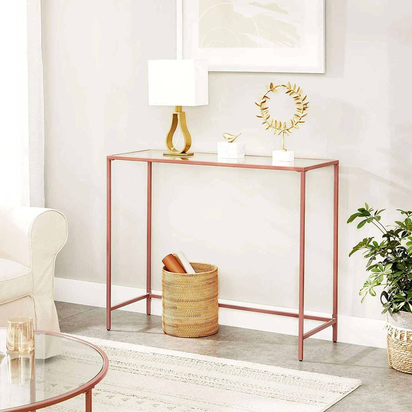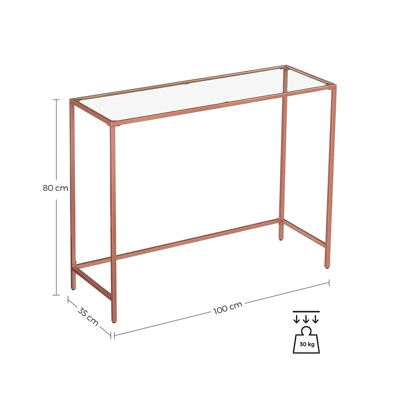 Aprašymas buvo automatiškai išverstas, gali pasitaikyti klaidų.Išsami informacija apie gaminį: - Spalva: rožinis auksas - Medžiaga: metalas, stiklas - Dydis: 100 x 35 x 80 cm (P x P x A) - Svoris: 8,2 kg - Maksimali statinė apkrova: 30 kgPristatymo komplektas: - 1 x konsolinis staliukas - 1 x priedų paketas - 1 x vadovas (DE, EN, ES, FR, IT)
