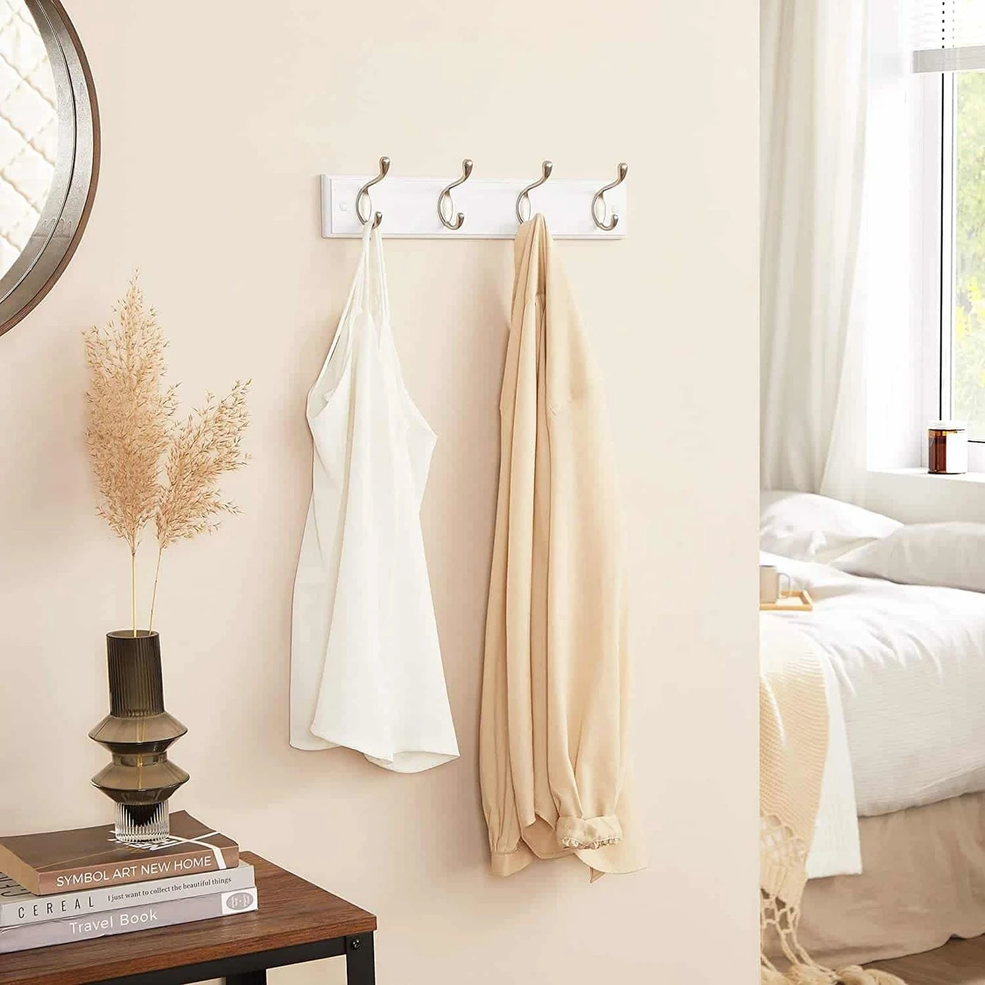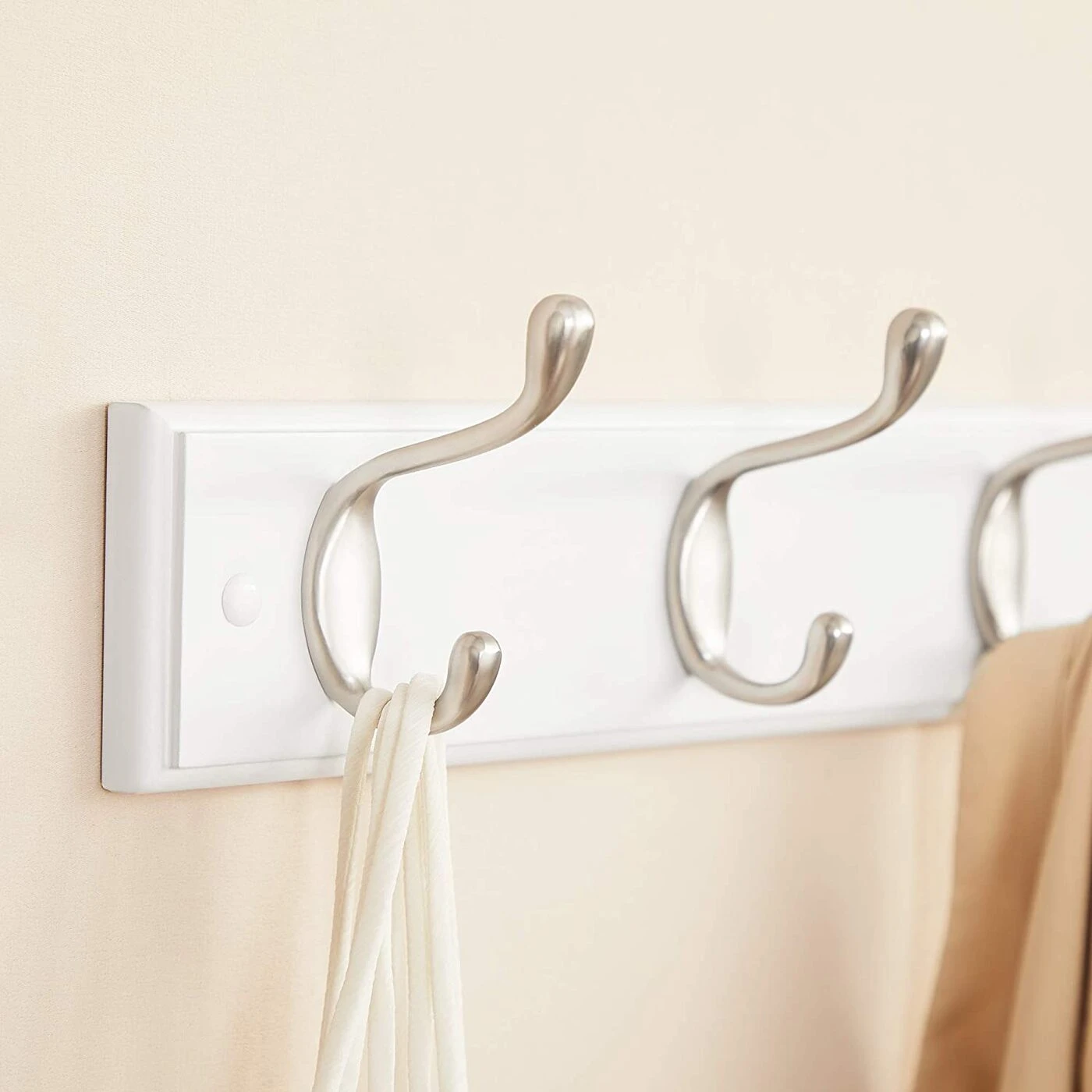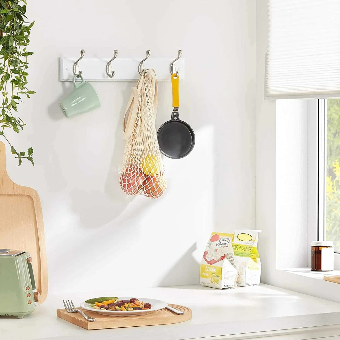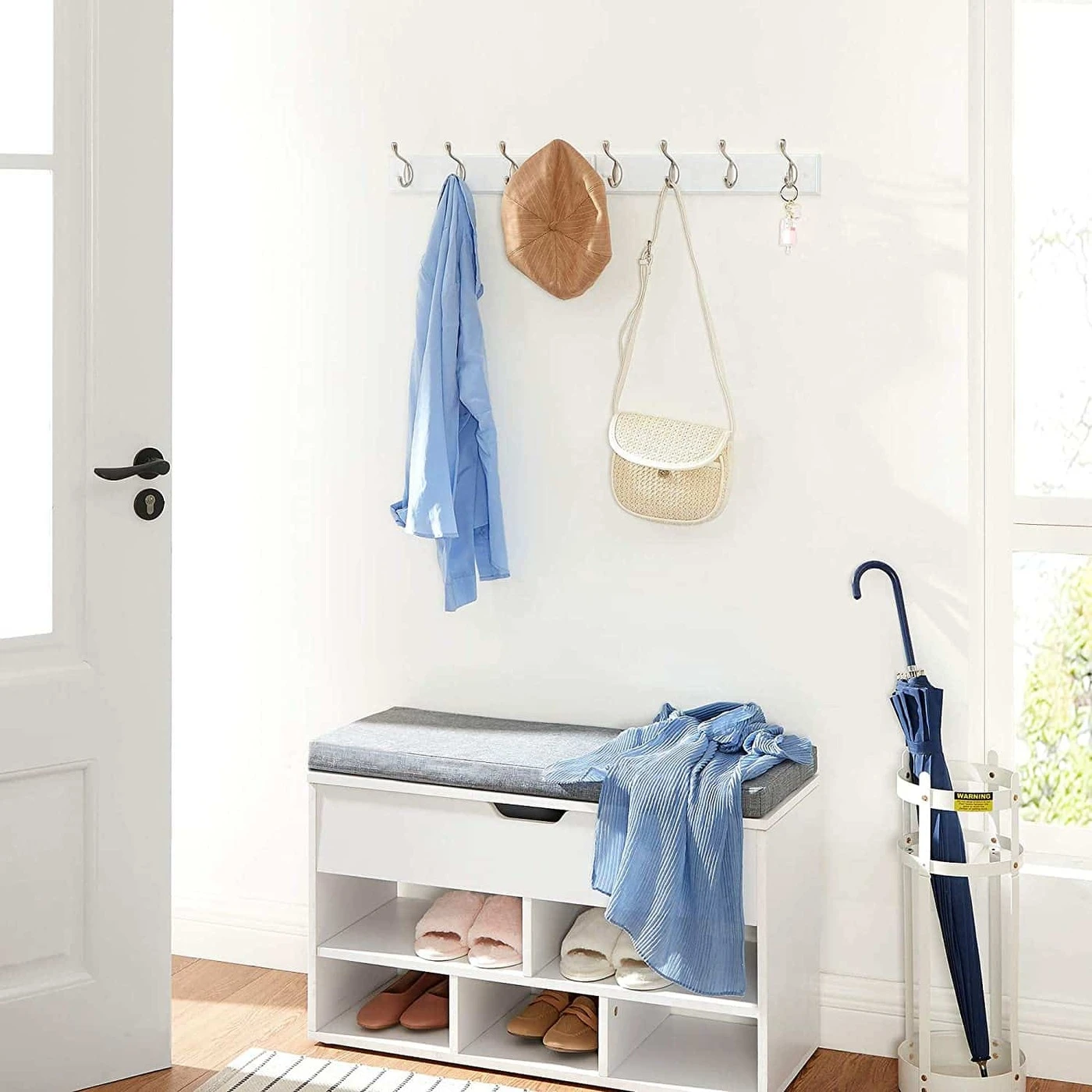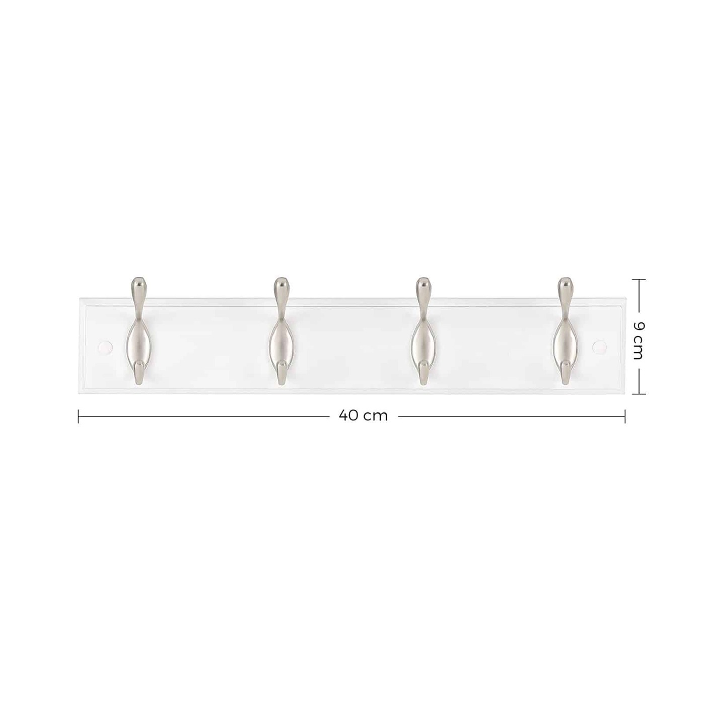 Aprašymas buvo automatiškai išverstas, gali pasitaikyti klaidų.Ar jums tai skamba pažįstamai? Durų rankenos pakabintos su paltais ir šalikais. Krepšiais ir kepurėmis apgultos kėdės. Rankšluosčiai yra ant grindų. Jūsų raktai vėl nepaaiškinamai dingo... Ar kažkas skamba? Jokiu problemu! Ši SONGMICS sieninė paltų kabykla padės įvesti tvarką jūsų namuose. Daugiau jokių chaotiškų drabužių krūvų! Šioje spintoje yra 4 metaliniai dvigubi kabliukai, suteikiantys 8 striukėms, skrybėlėms, rankinėms ir raktams pakabinti. Tokiu būdu jūsų kėdžių ir fotelių nebeapguls krūvos rūbų. Geri įpročiai palengvina kasdienybę: Naudodami šią paltų kabyklą įprasite visada tvarkingai pakabinti drabužius. Išmokykite to ir savo vaikus. Taip anksti išmoksite tvarkyti daiktus ir, greičiausiai, vėliau nereikės ieškoti savo raktų.Išsami informacija apie gaminį: Spalva: balta-sidabrinė Medžiaga: MDF (vidutinio tankio medienos plaušų plokštė), cinko lydinys Dydis: 40 x 9 x 7 cm (P x P x A) Svoris: 0,5 kg Maks. Statinė apkrova: 15,9 kg Pakuotės turinys: 1 x Sieninių drabužių kabykla 1 x Priedų komplektas 1 x Instrukcijos SONGMICS Pastabos: Nenaudokite šio gaminio lauke ir saugokite jį nuo lietaus. Norėdami užtikrinti stabilumą, šį gaminį montuokite ant tvirtos sienos arba medinių stulpų ir atsparumas, užtikrinantis sieninę spintą.