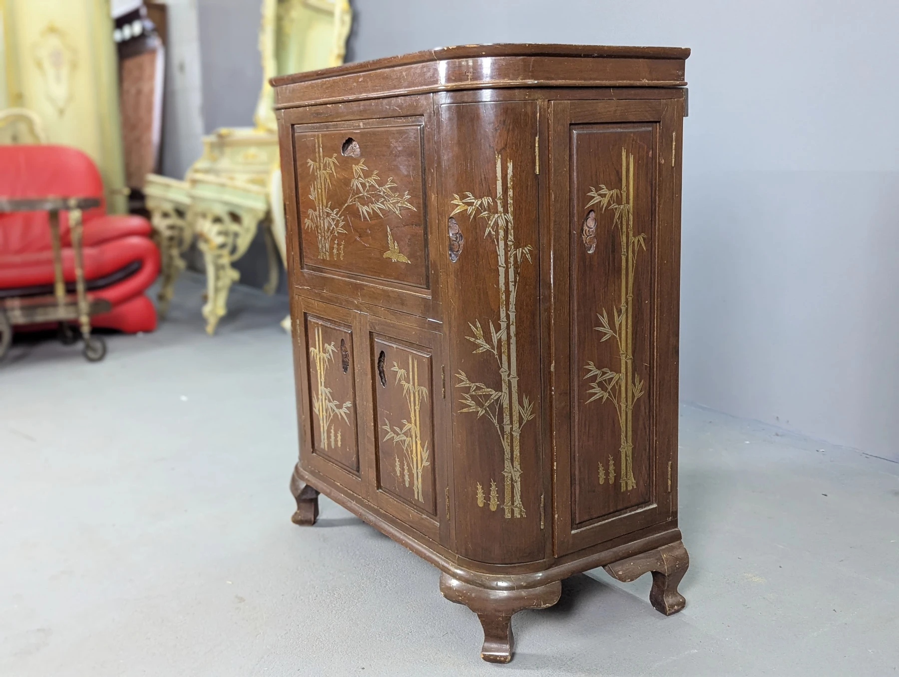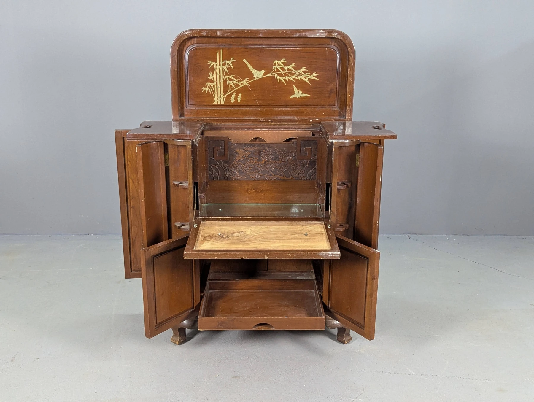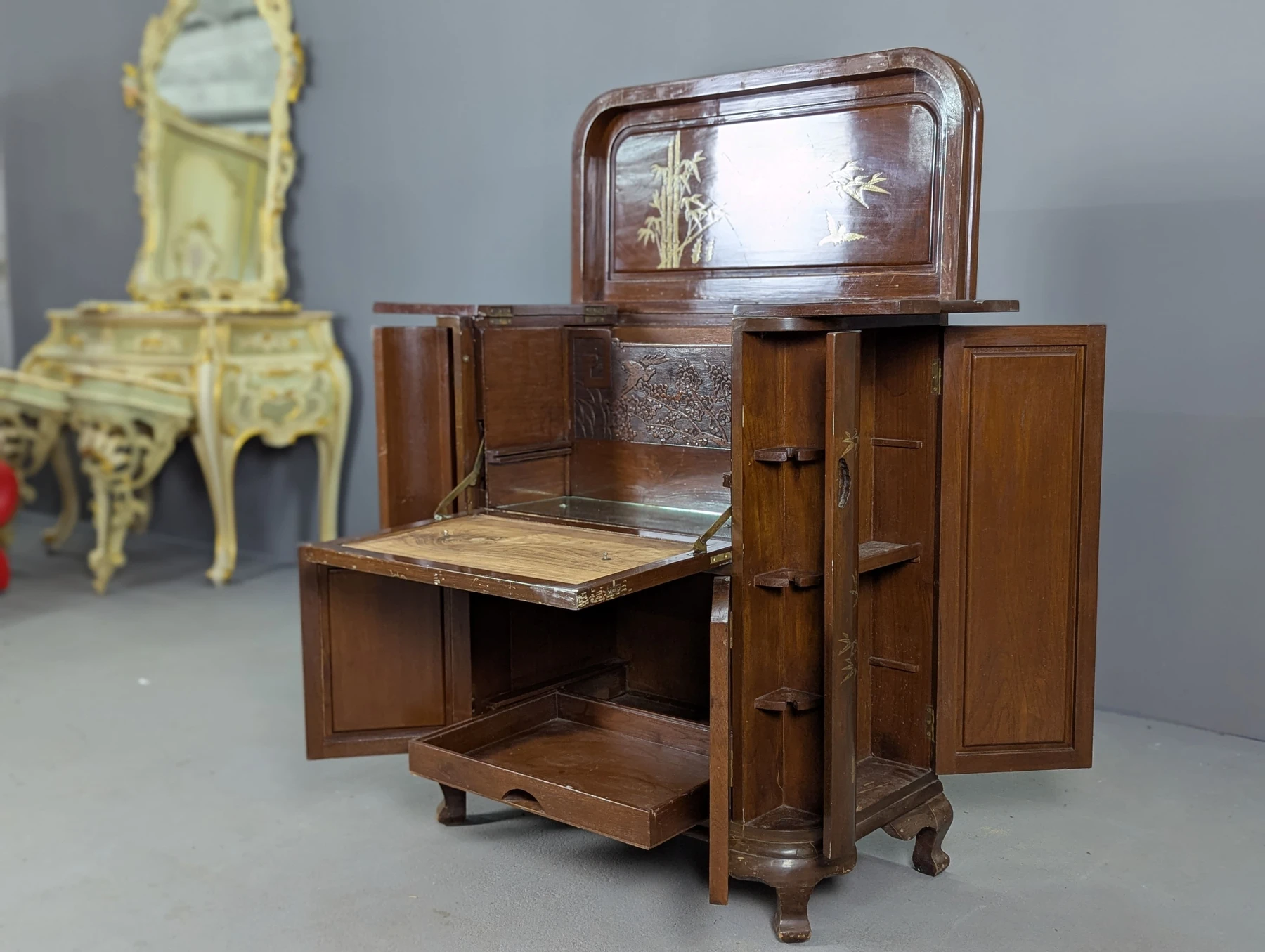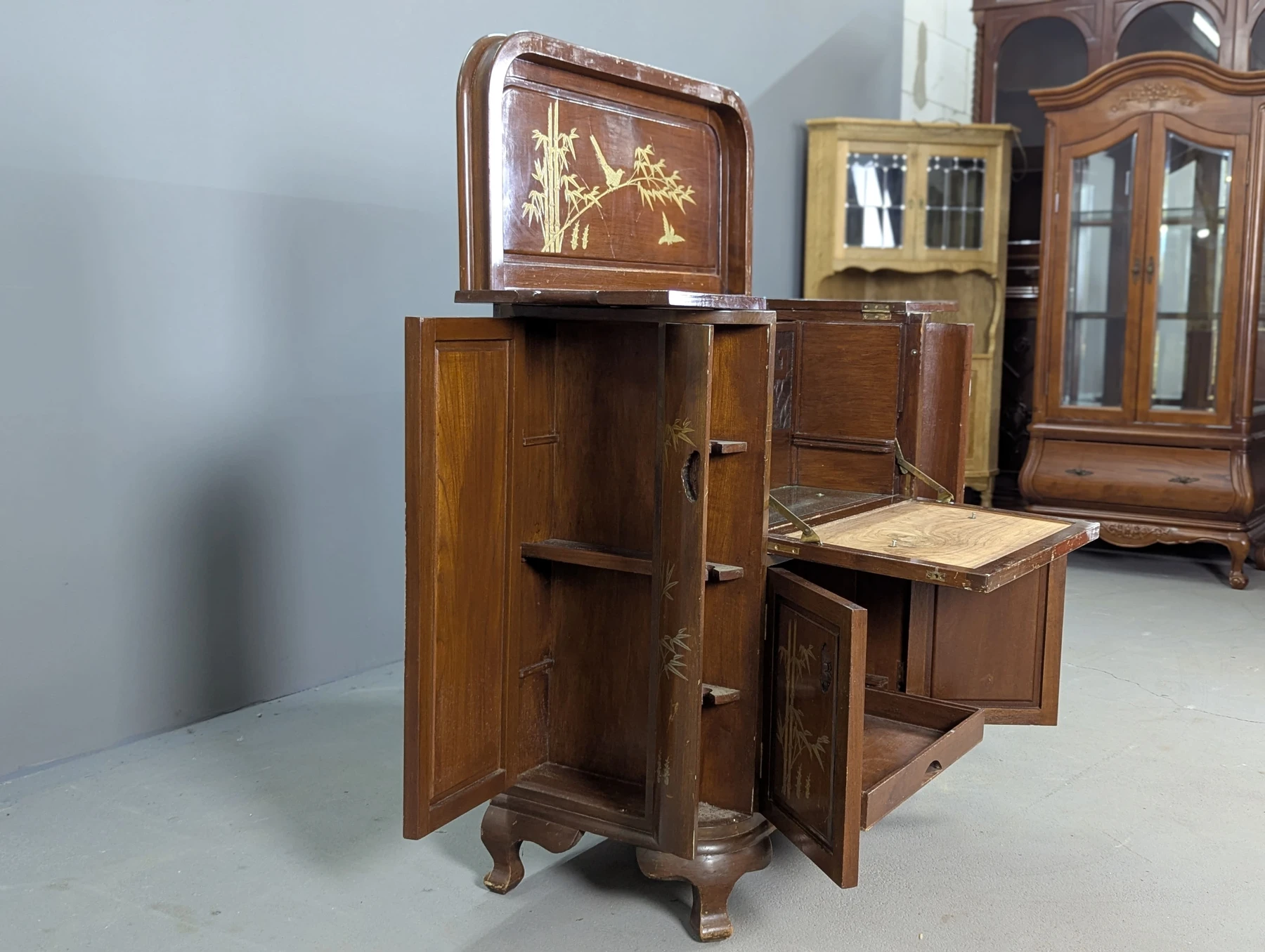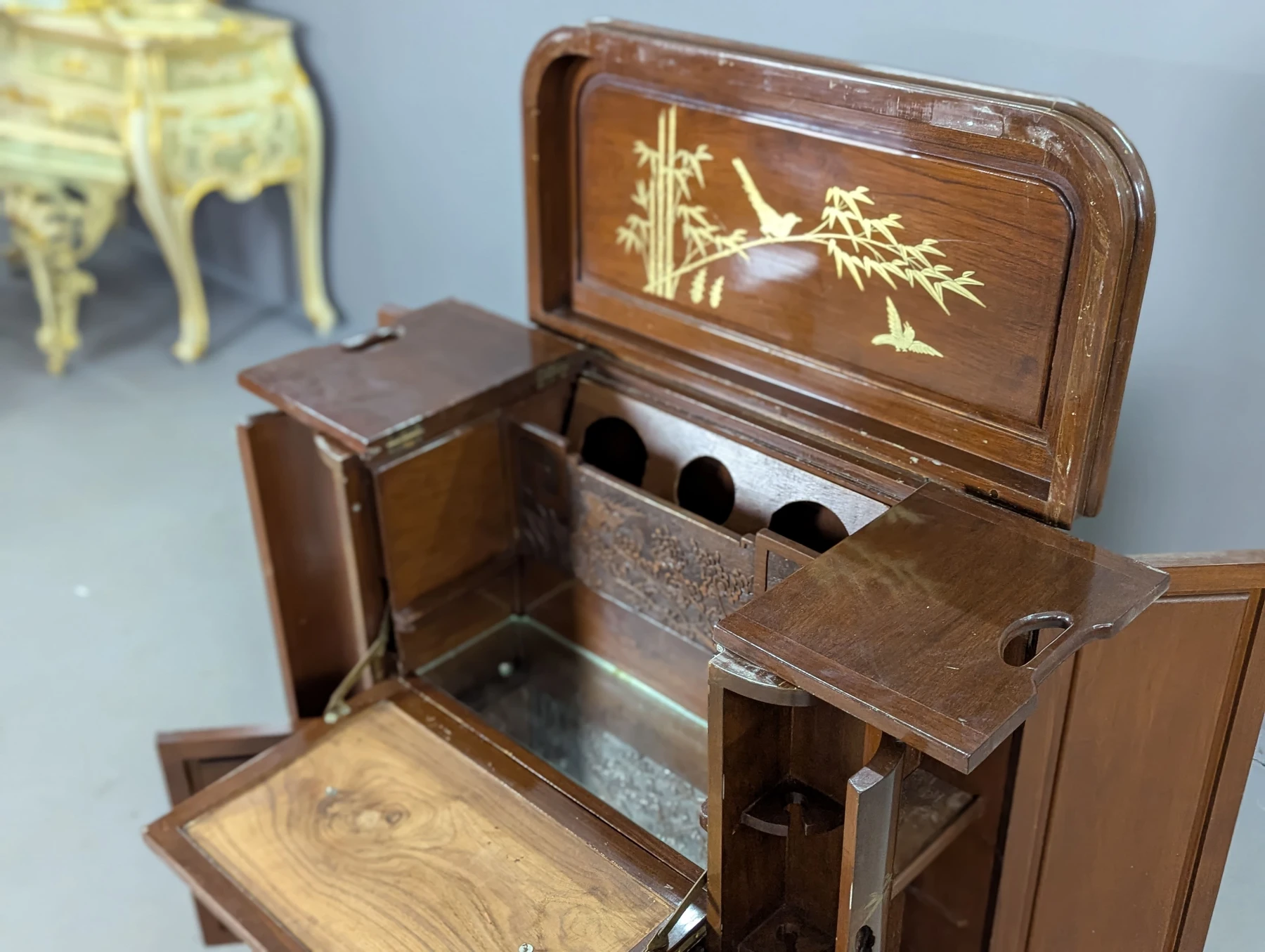 Išskirtinio rytietiško stiliaus baras su subtiliais augalų motyvais ir patogiu vidaus išdėstymu gėrimams bei taurėms laikyti. Baldas turi atsidarantį viršų ir lentynėles buteliams bei stiklinėms, todėl puikiai tinka stilingam svetainės ar darbo kambario kampeliui.