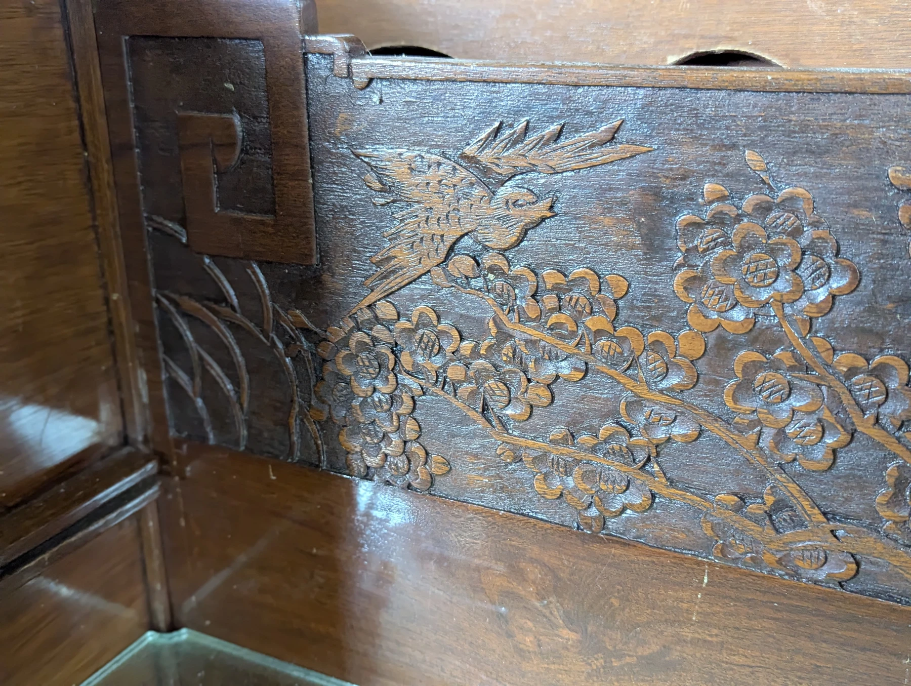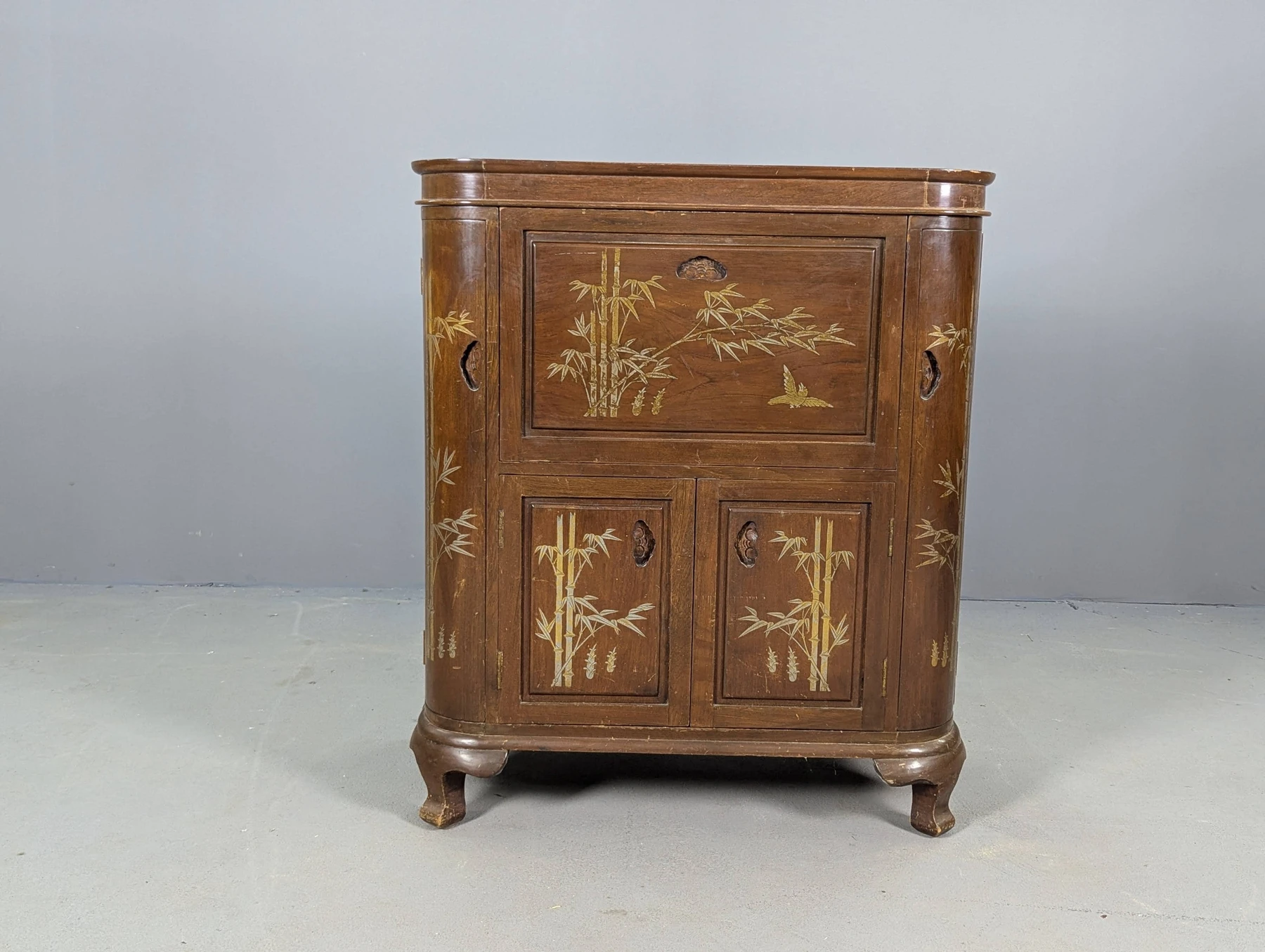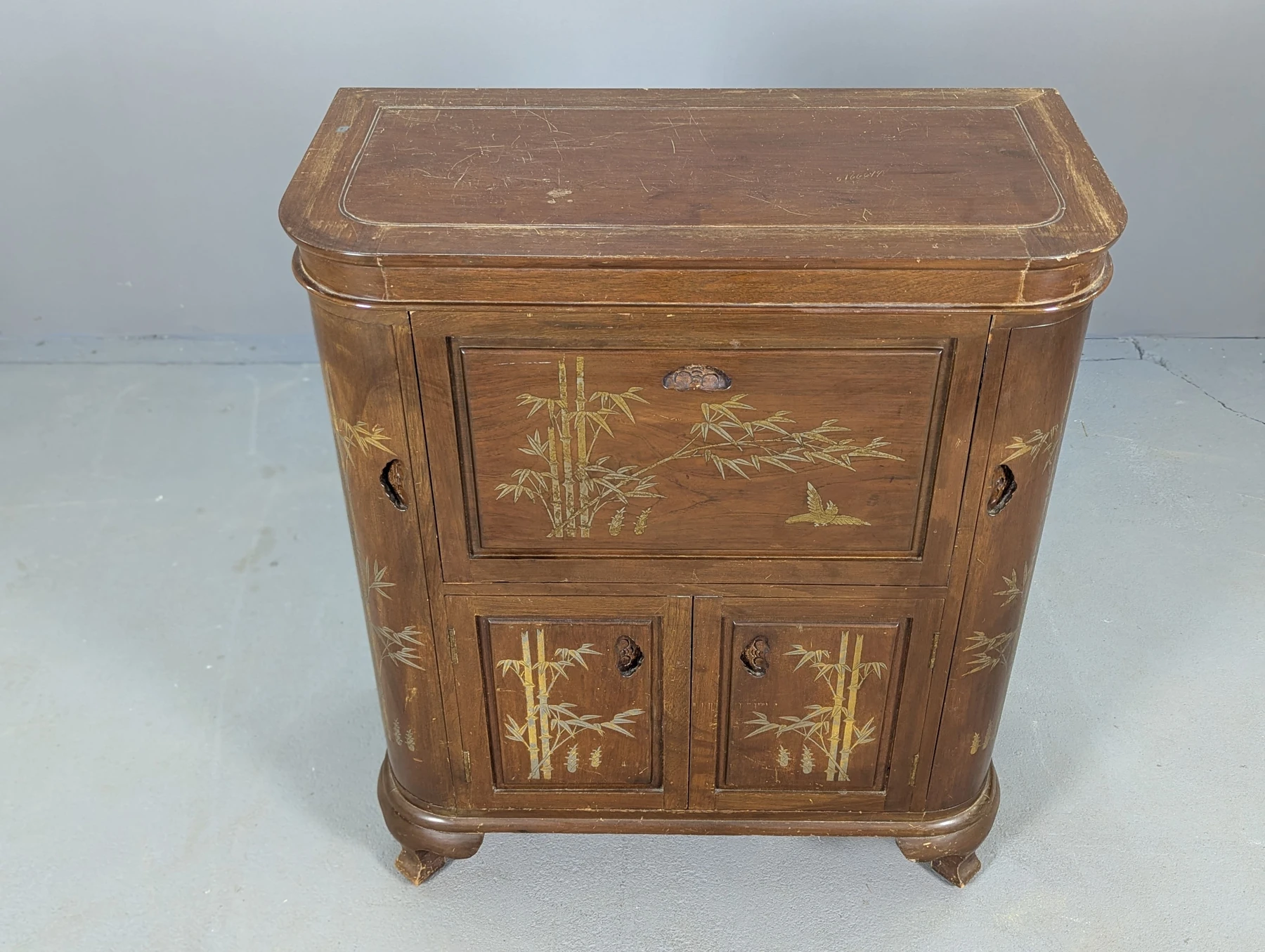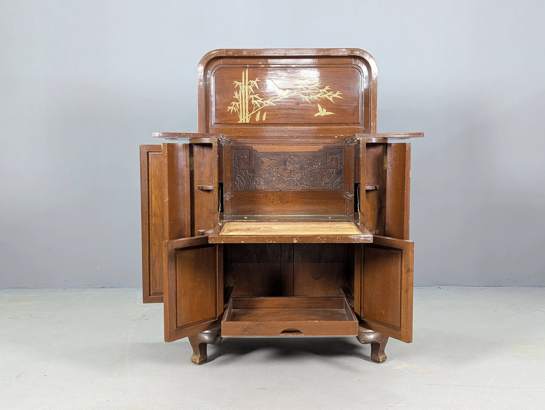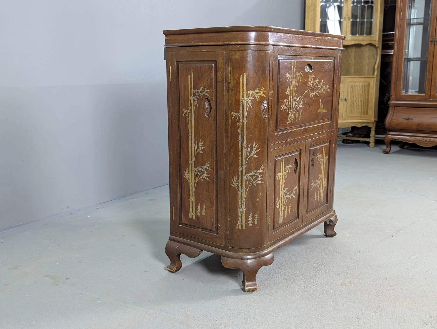 Išskirtinio rytietiško stiliaus baras su subtiliais augalų motyvais ir patogiu vidaus išdėstymu gėrimams bei taurėms laikyti. Baldas turi atsidarantį viršų ir lentynėles buteliams bei stiklinėms, todėl puikiai tinka stilingam svetainės ar darbo kambario kampeliui.