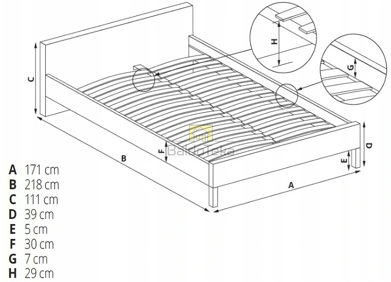 Lovos rėmo Plotis/Ilgis/Aukštis: 171/218/111 cm.