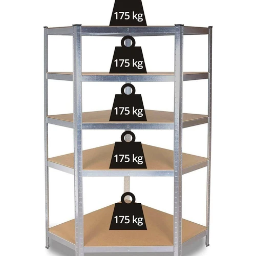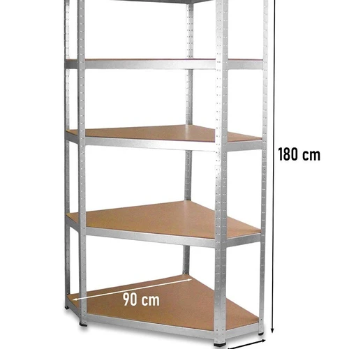 Industrinio stiliaus aukšta kampinė pastatoma lentyna;Su atviromis lentynomis;Lentynų skaičius: 5 lentynos;Lentyna pagaminta iš medžio dulkių plokštės (MDF), storis - 4 mm ir plieno, storis - 0,65 mm; Matmenys: aukštis - 180 cm, plotis - 90 cm, gylis - 40 cm;Vienos lentynos apkrova: 175 kg;Maksimali bendra apkrova: 875 kg;Lentynos yra suveriamos, be varžtų;Svoris: 13 kg;