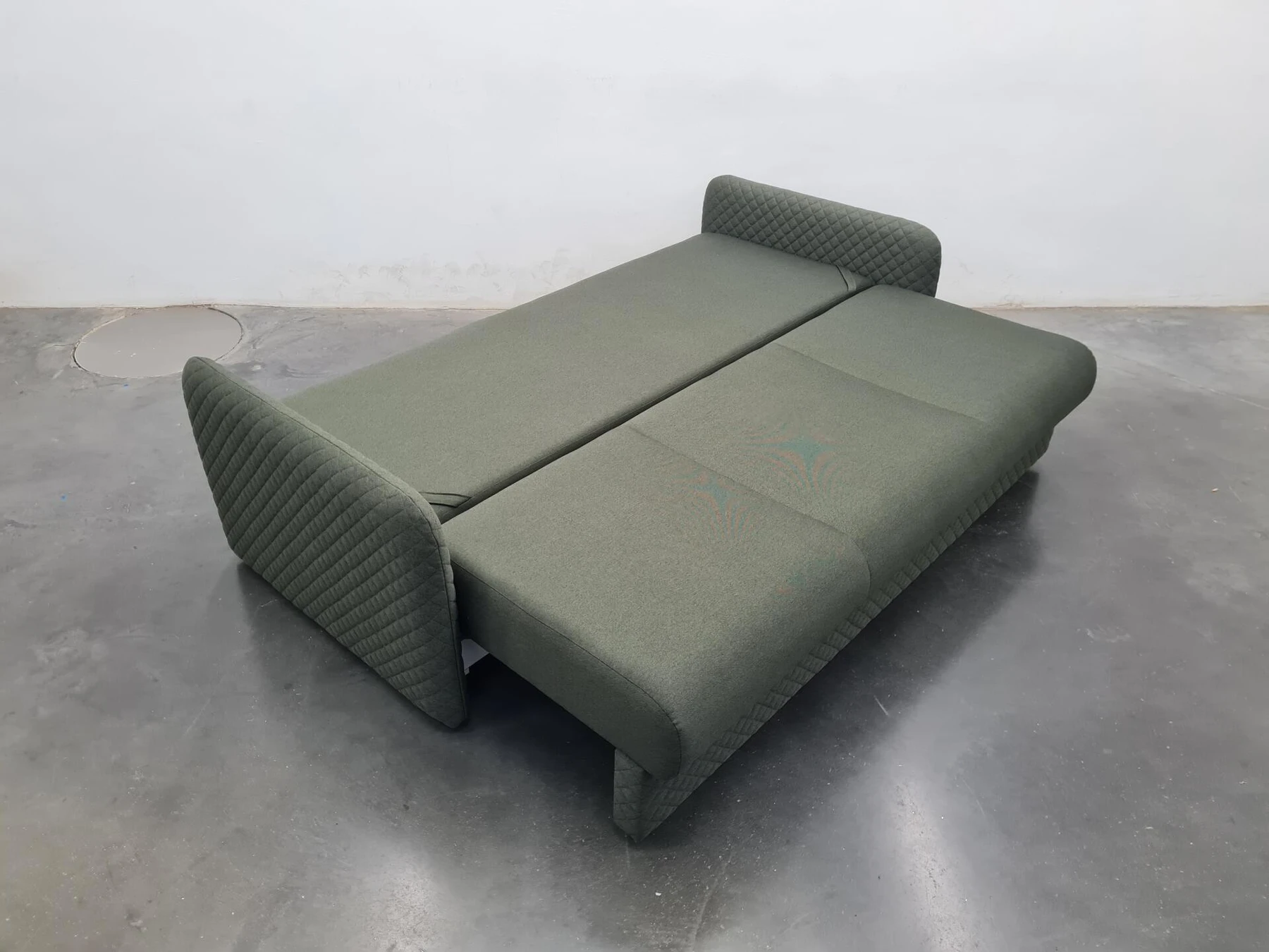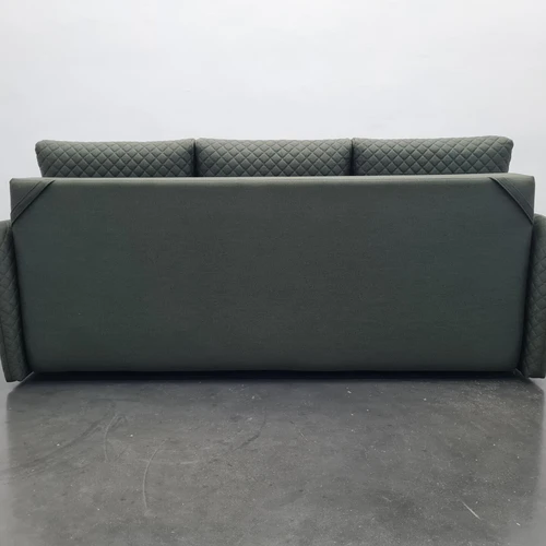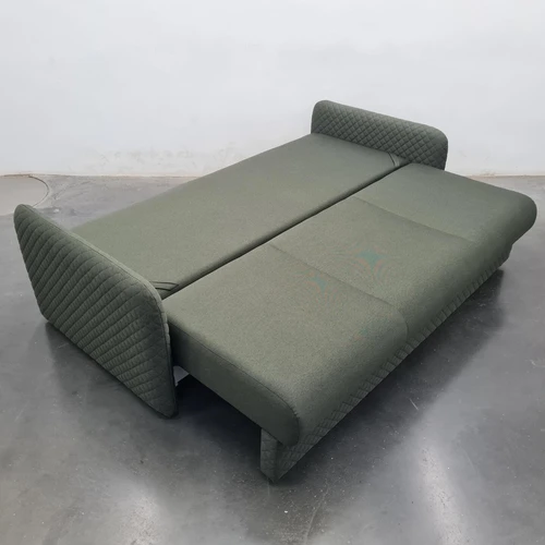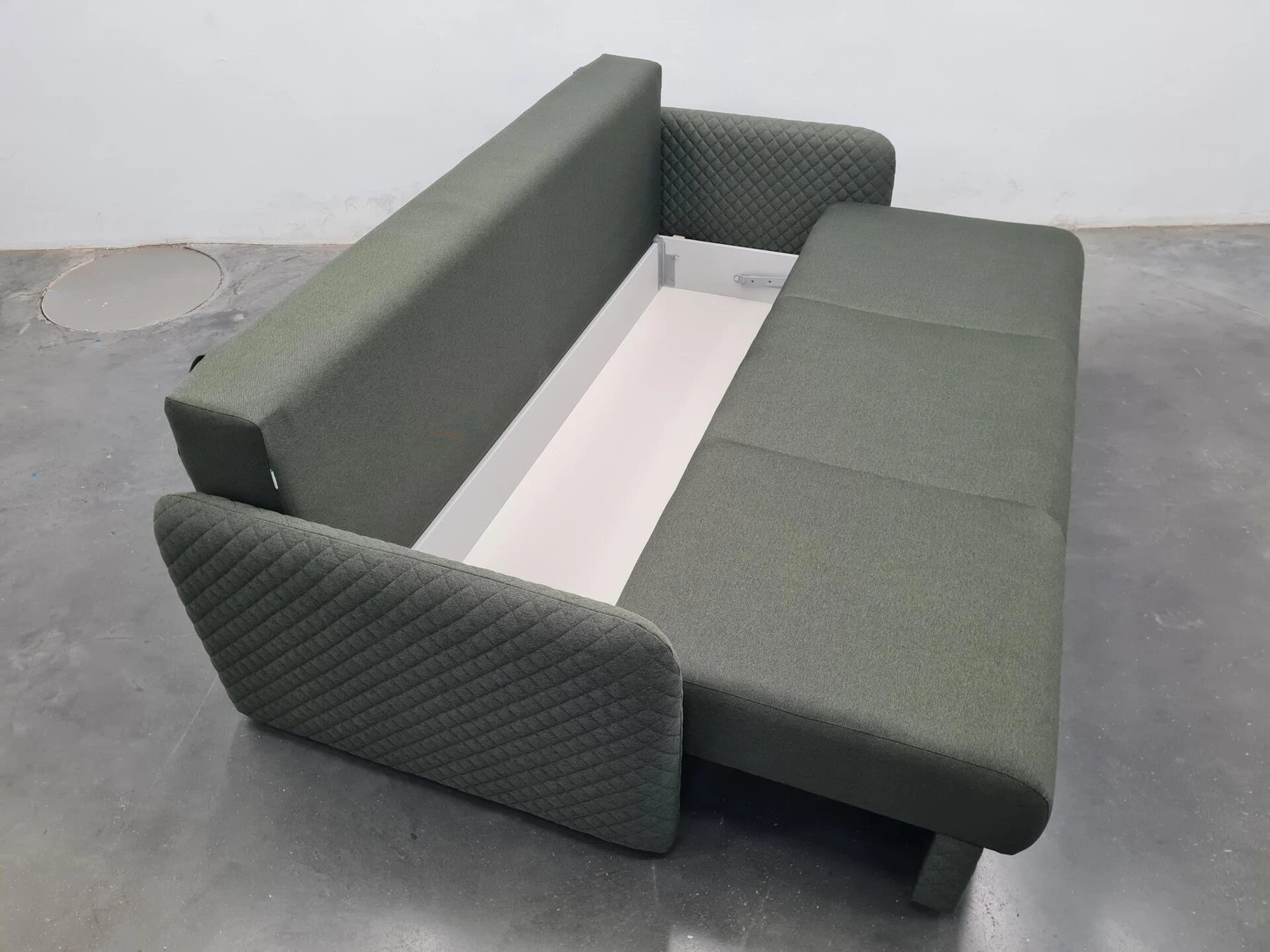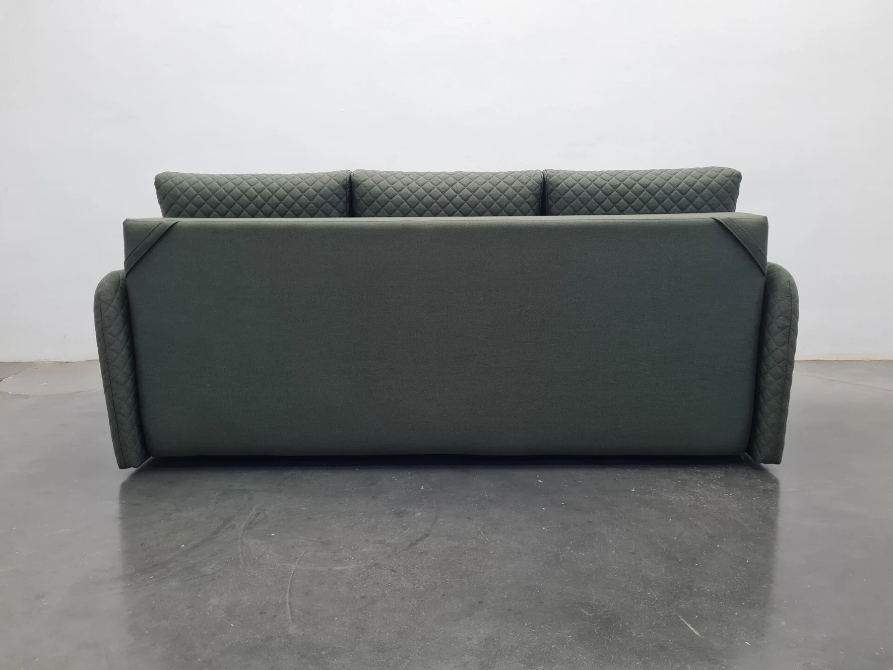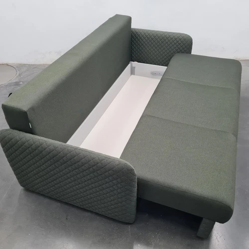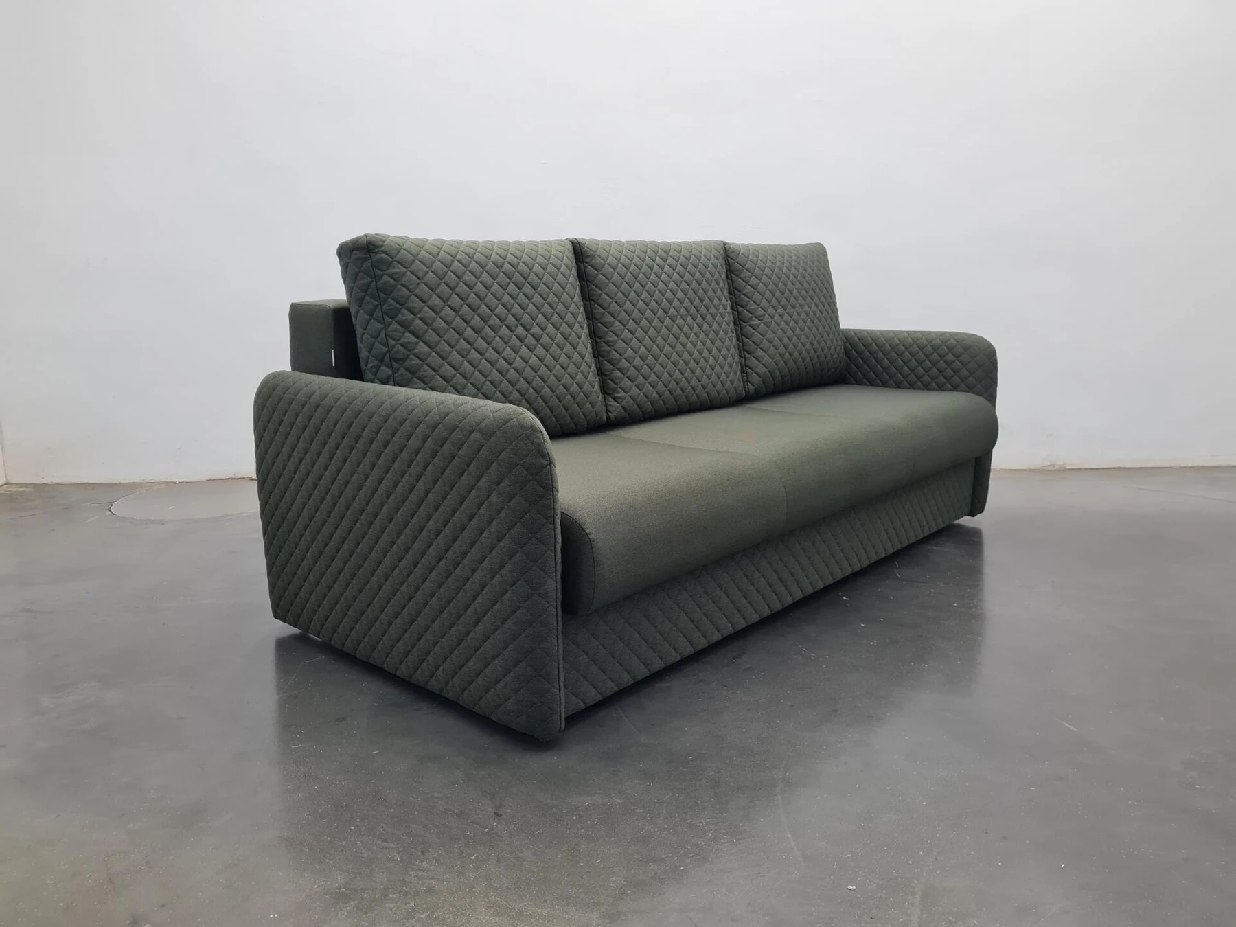 Sofa su miegamu mechanizmu, patalynės dėže, trimis atlošo pagalvėmis ir minkštais apvalintais 10 cm pločio porankiais