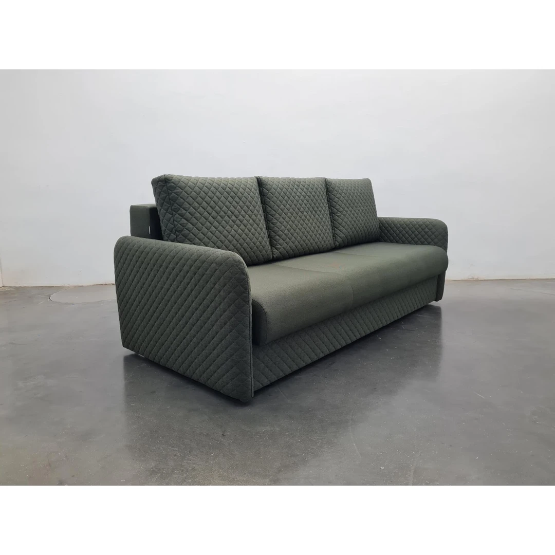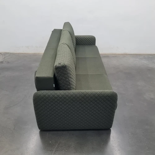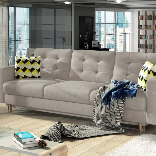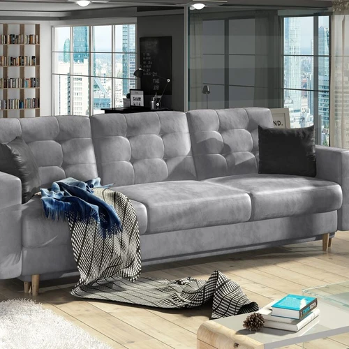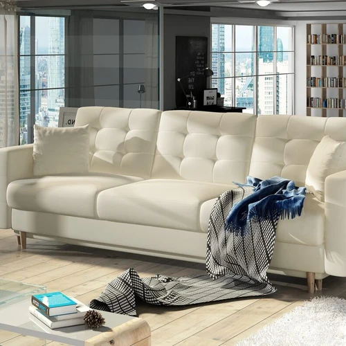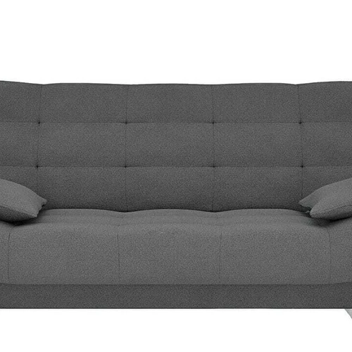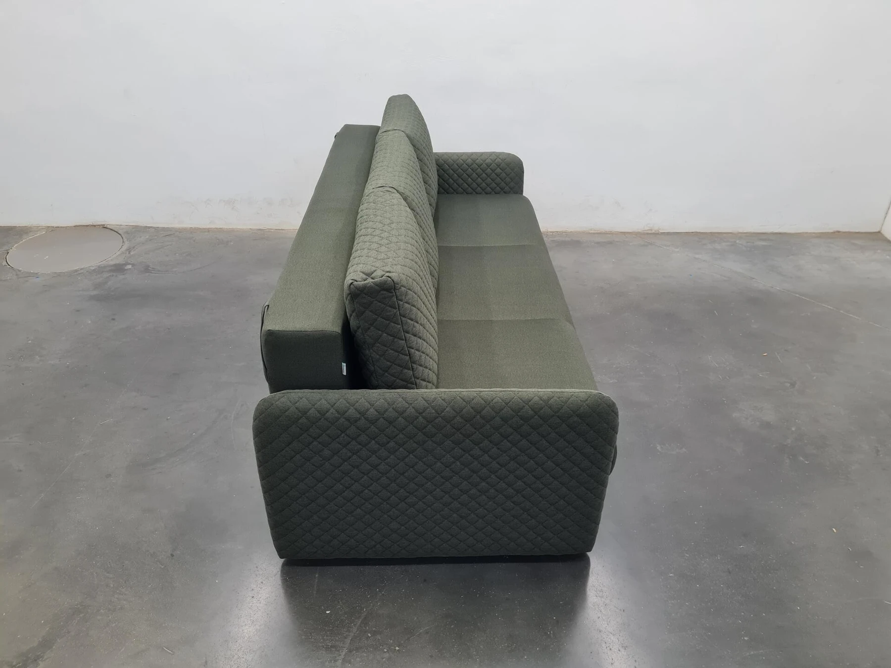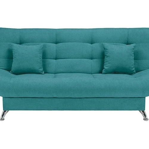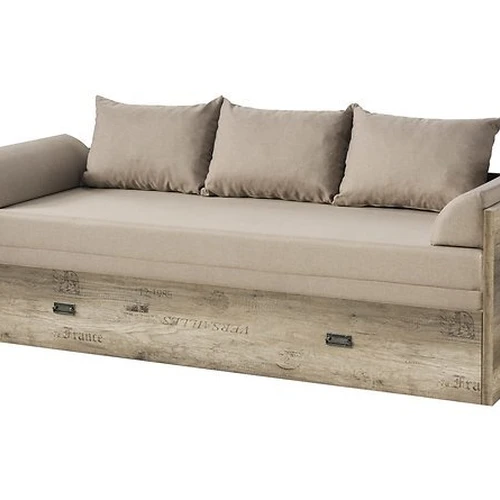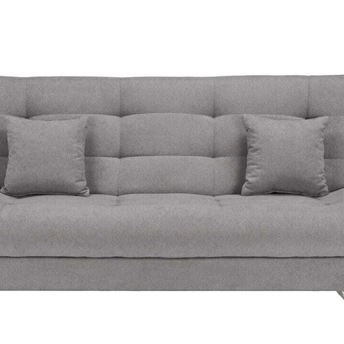 Sofa su miegamu mechanizmu, patalynės dėže, trimis atlošo pagalvėmis ir minkštais apvalintais 10 cm pločio porankiais