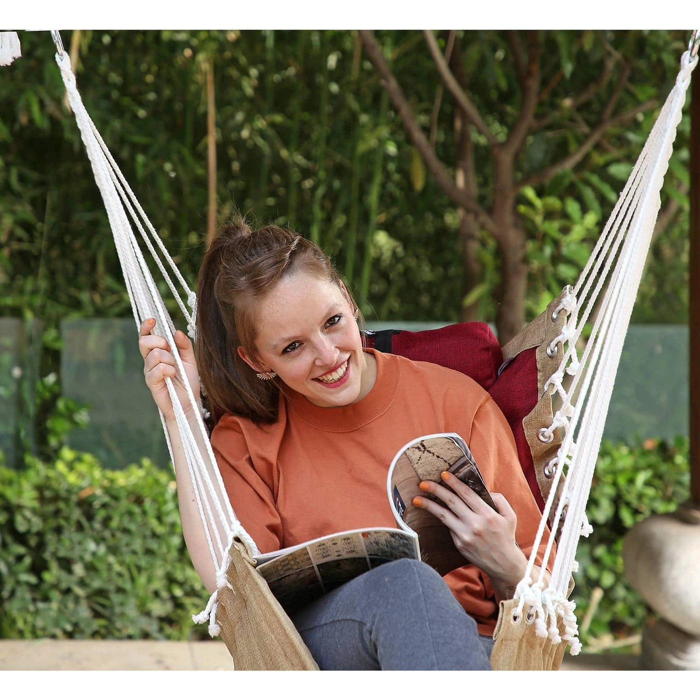 Aprašymas buvo automatiškai išverstas, gali pasitaikyti klaidų.Patalpoje arba lauke Pakabinkite šį fotelį sode arba terasoje ir susikurkite savo poilsį. Čia galite paskaityti knygas ar ramiai pailsėti po pietų. Arba sukurkite ramybės oazę savo miegamajame ar svetainėje su šia pakabinama kėde. Nesvarbu, ar lauke karšta, ar šalta, galite prisiglausti kaip katė, klausytis muzikos ar žiūrėti filmą ir atsikratyti kasdienės įtampos. Kiekvienas nusipelno atsipalaidavimo po ilgos dienos Gražių dalykų, kuriais turėtume pasidalinti su savo šeima ar draugais. Tačiau jei ši pakabinama kėdė tokia patogi, kad norite ją naudoti patys, galbūt norėsite užsisakyti dvi! Pakabinkite juos greta, tada galėsite sėdėti ir kalbėtis su draugais, mėgaudamiesi gamtos grožiu savo sode. Informacija apie gaminį: - Spalva: raudona-chaki - Medžiaga: lino imitacija, poliesterio užpildas, bambukas - Sėdynės matmenys: 70 x 60 cm (I x P) - Atlošo matmenys: 70 x 60 cm (P x P) - Svoris: 2 . 5 kg - Maksimali statinė apkrova: 200 kgPristatymo komplektas: - 1 x pakabinama kėdė - 1 x pagalvėlė - 1 x instrukcijos (DE, EN, FR, ES, IT) SONGMICS Pastabos: - Vaikai kabamąja kėde gali naudotis tik prižiūrimi suaugusiųjų. - Dėl gaminio spalvos pakitimai skirtinguose monitoriuose gali būti spalvinių nukrypimų.- Mūsų nurodyti matmenys buvo nustatyti rankiniu būdu išmatuojant, todėl gaminys gali skirtis iki 5 cm.