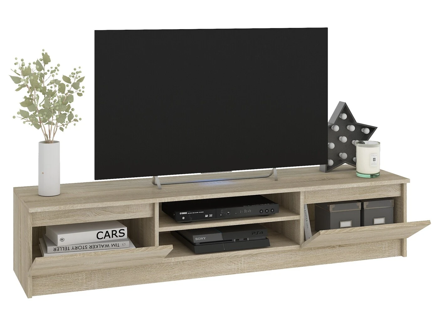 Aprašymas buvo automatiškai išverstas, gali pasitaikyti klaidų. Baldų rinkinys, kurį sudaro RTV spintelė televizoriui ir dvi spintos / pakabinamos vitrinos. RTV komodoje yra speciali vieta priedėliui ir interneto modemui. Šoniniuose skyreliuose už durelių galite paslėpti CD, DVD ar kitus priedus televizoriui ar kompiuteriui. Taip pat ant jo galite pastatyti bet kokio dydžio televizorių. Kita vertus, pakabinamose spintelėse tilps smulkūs daiktai, tokie kaip akiniai, akiniai ar knygos. Sonoma Oak spalva tiks tiek modernioms, tiek tradicinėms svetainėms. Visa tai atrodo moderniai ir elegantiškai ir puikiai papildys bet kurią svetainę.