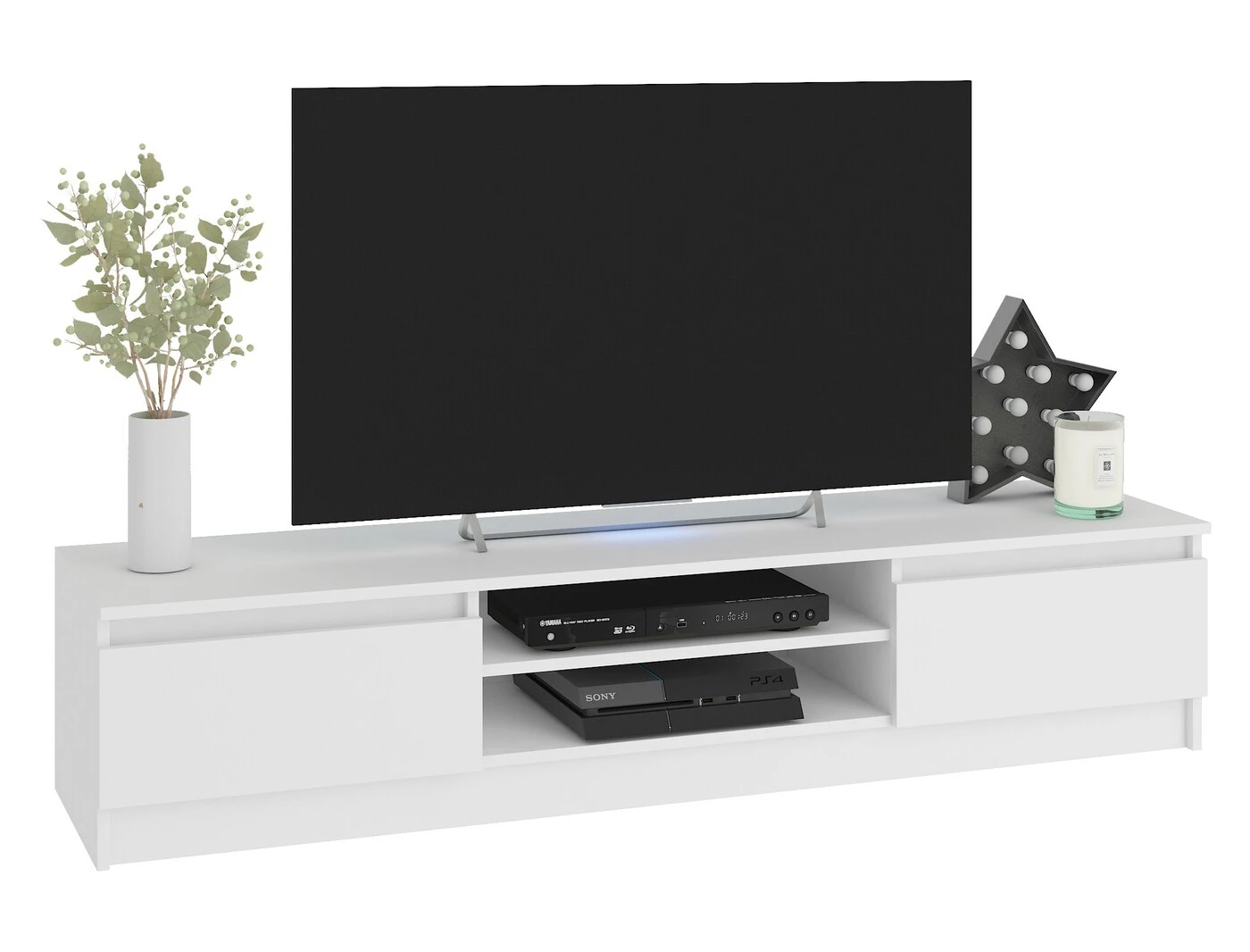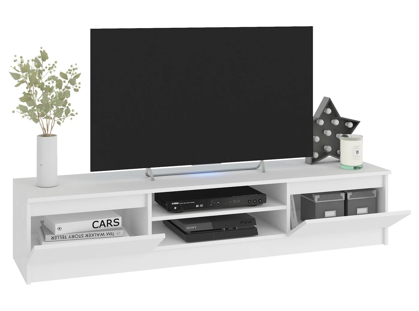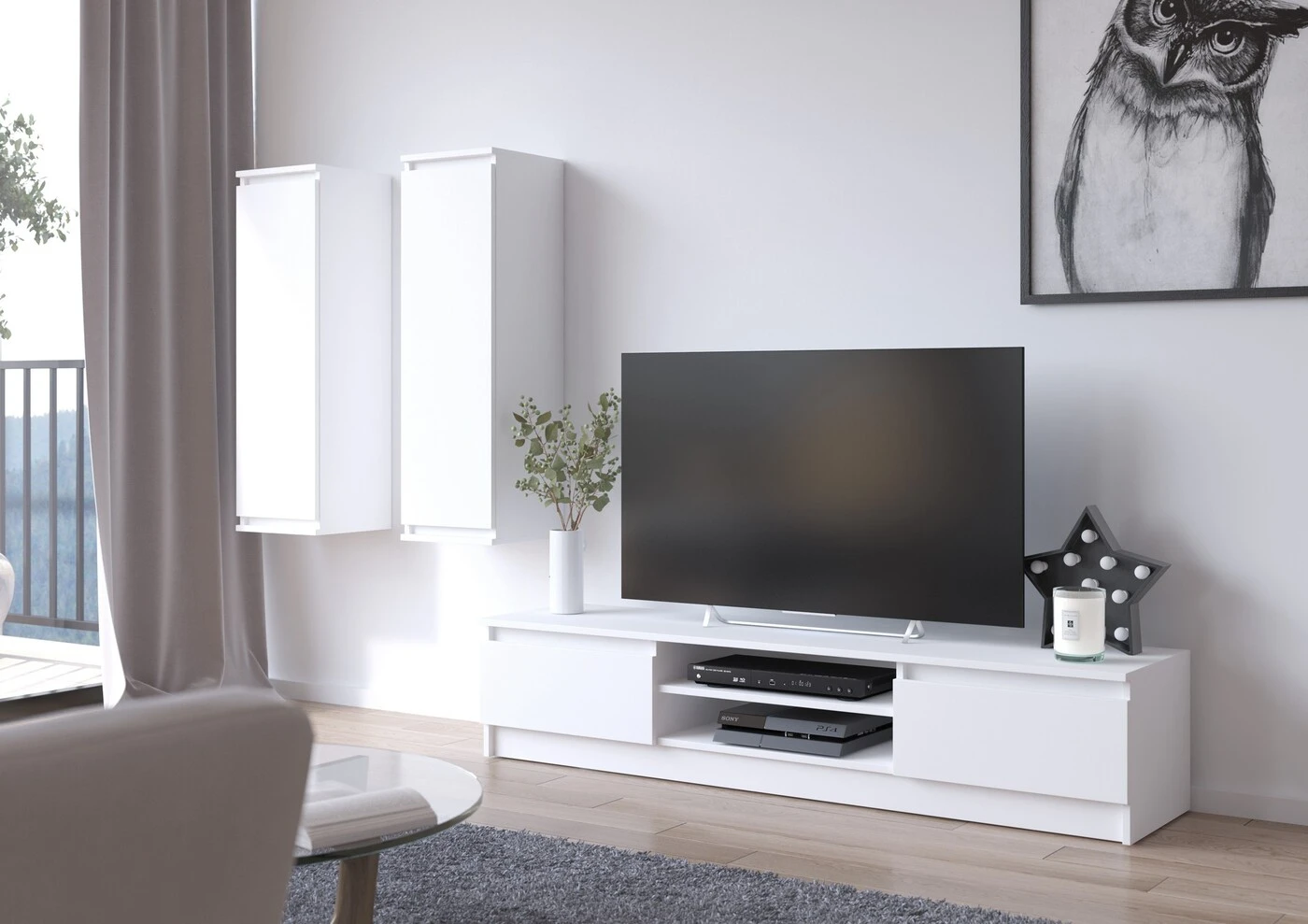 Aprašymas buvo automatiškai išverstas, gali pasitaikyti klaidų. Baldų komplektas, susidedantis iš RTV spintos ir dviejų pakabinamų spintelių, gali būti funkcionali svetainės, biuro ar jaunimo kambario įranga. Televizoriaus spintelė turi didelį stalviršį, ant kurio galėsite dėti bet kokio dydžio televizorių ir dekoratyvinius elementus. Balduose įrengtos praktiškos lentynos elektroninei įrangai bei šoniniai skyriai su varstoma durelėmis, kuriuose galima laikyti DVD, kompiuterių priedus ar kitokius smulkius daiktus. Televizoriaus stovas kartu su šonuose kabantomis spintelėmis yra vizualiai patraukli kompozicija. Baldai užima mažai vietos, todėl tinka ne tik didelei svetainei, bet ir mažoms patalpoms. Baltos spalvos televizoriaus spintelė ir pakabinamos spintelės puikiai derės prie modernaus interjero dizaino. Klasikinės baltos spalvos atspalvis toks universalus, kad baldų komplektas įspūdingai atrodys tiek pastelinėmis spalvomis vyraujančioje patalpoje, tiek svetainėje su sienomis ar tamsesnių tonų kilimu. Baldai pagaminti iš laminuotos plokštės su ABS briauna, kuri yra atspari trinčiai, braižymui ir ilgalaikiam naudojimui.